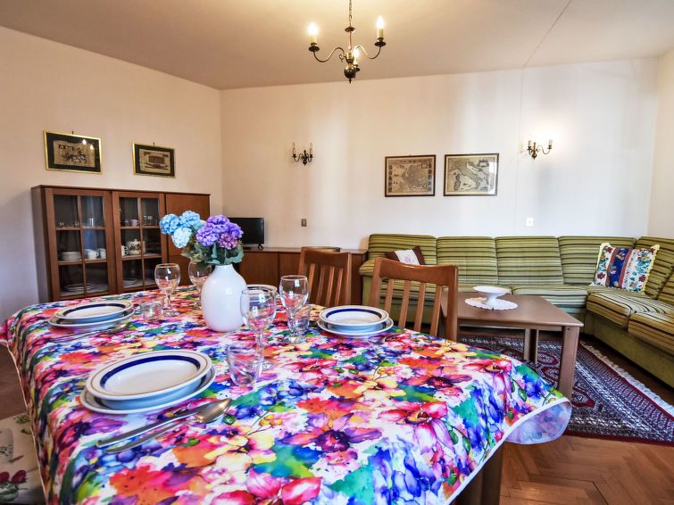 3-room apartment 65 m2 on 1st floor. Bright, practical and comfortable furnishings: living/dining room with dining table and TV. Exit to the terrace. 1 room with 1 x 2 bunk beds. Exit to the terrace. 1 double bedroom. Exit to the terrace. Small kitchen (4 induction hot plates, toaster, kettle, microwave, freezer) with small dining table.