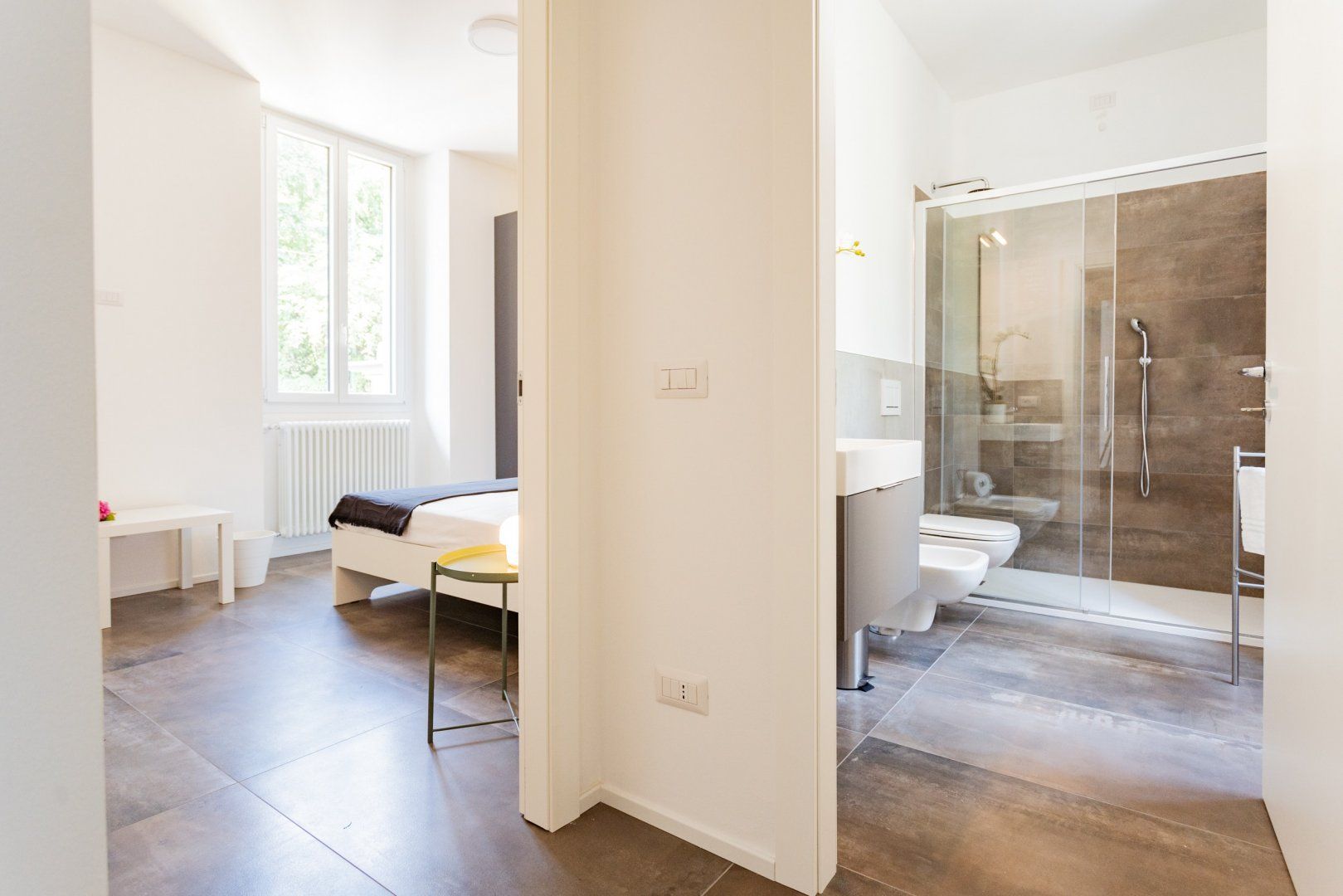 In the apartment itself, you’ll find clean white walls and long French windows brightening up each room. Dine by the window in the kitchen and throw open the doors to create a Juliet-style balcony looking out over the leafy street below. The old stonework of the building is on display behind the dove-grey sofa and the kitchen units have everything you need for self-catering. That’s if you’re not too busy hitting every trattoria and gelateria in Cernobbio.