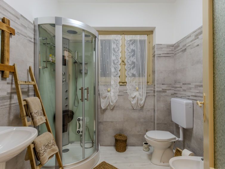 "Mara", 3-room apartment 80 m2, on the upper ground floor. Comfortable furnishings: living/dining room with dining table. Exit to the garden. 1 double bedroom with 1 sleeping facility. 1 room with 2 beds. Small, open kitchen (oven, dishwasher, 4 gas rings, toaster, electric coffee machine) with dining table.