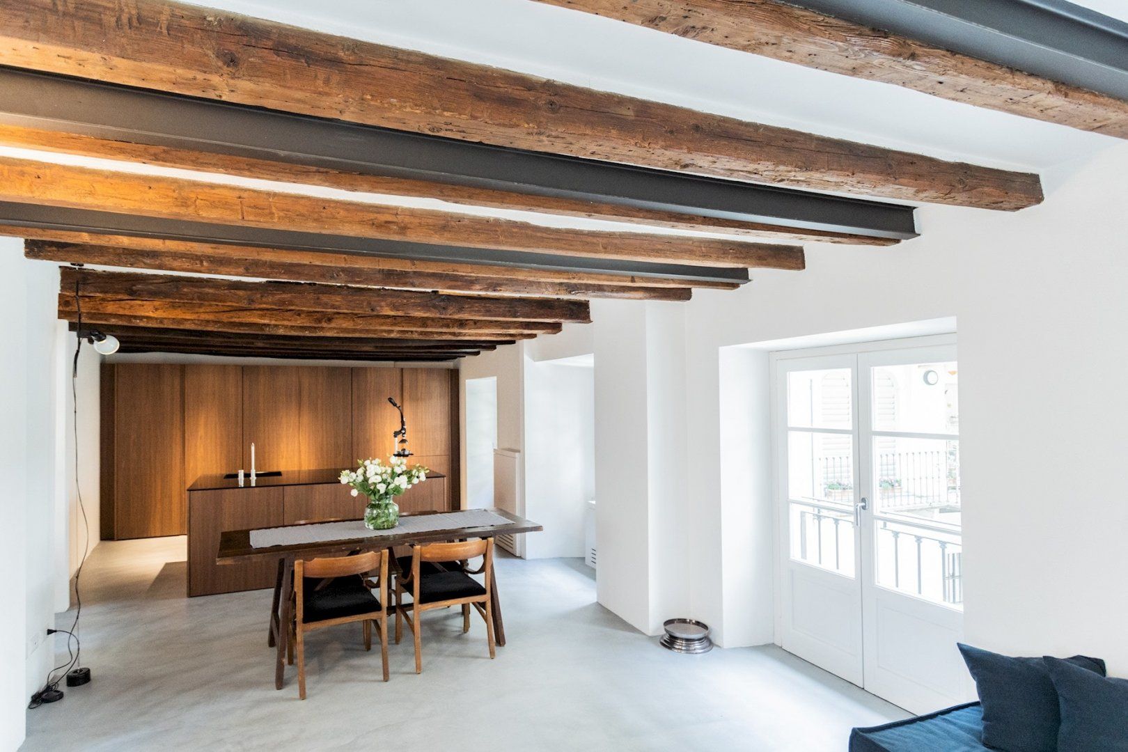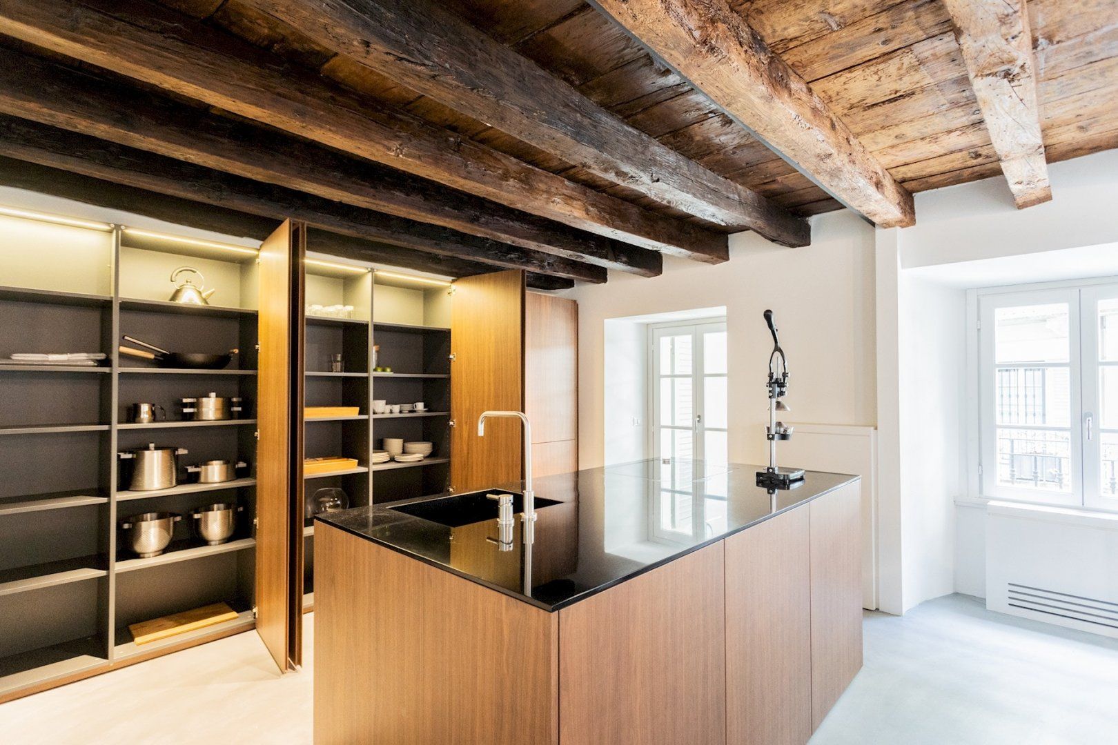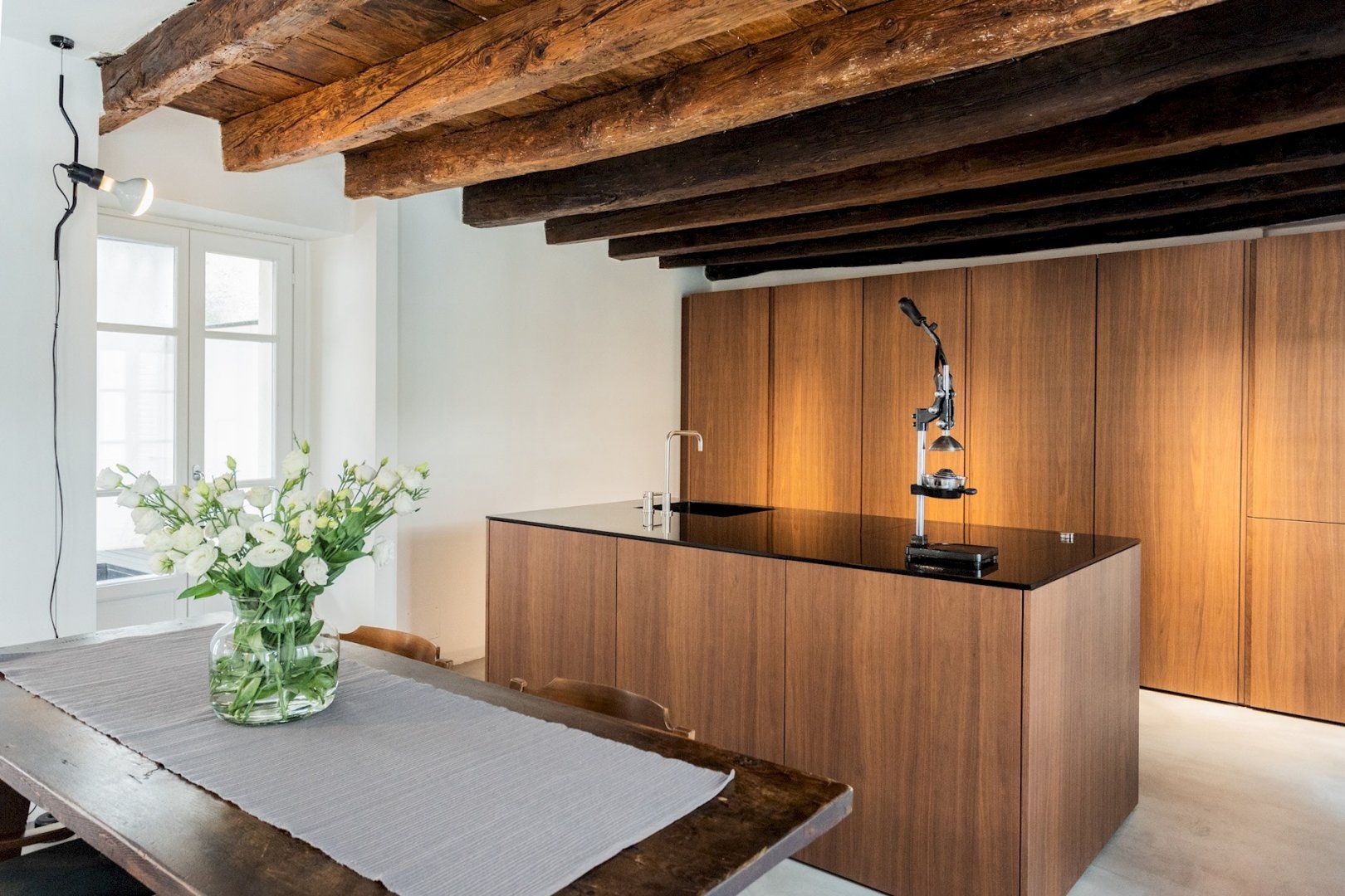 Located on a picturesque square in the centre of Como, this apartment is a playful mixture of tradition and modernity. You only have to look at the sleek kitchen island sitting underneath wooden ceiling beams, or the stone basin in an otherwise contemporarily styled bathroom to see what we mean.