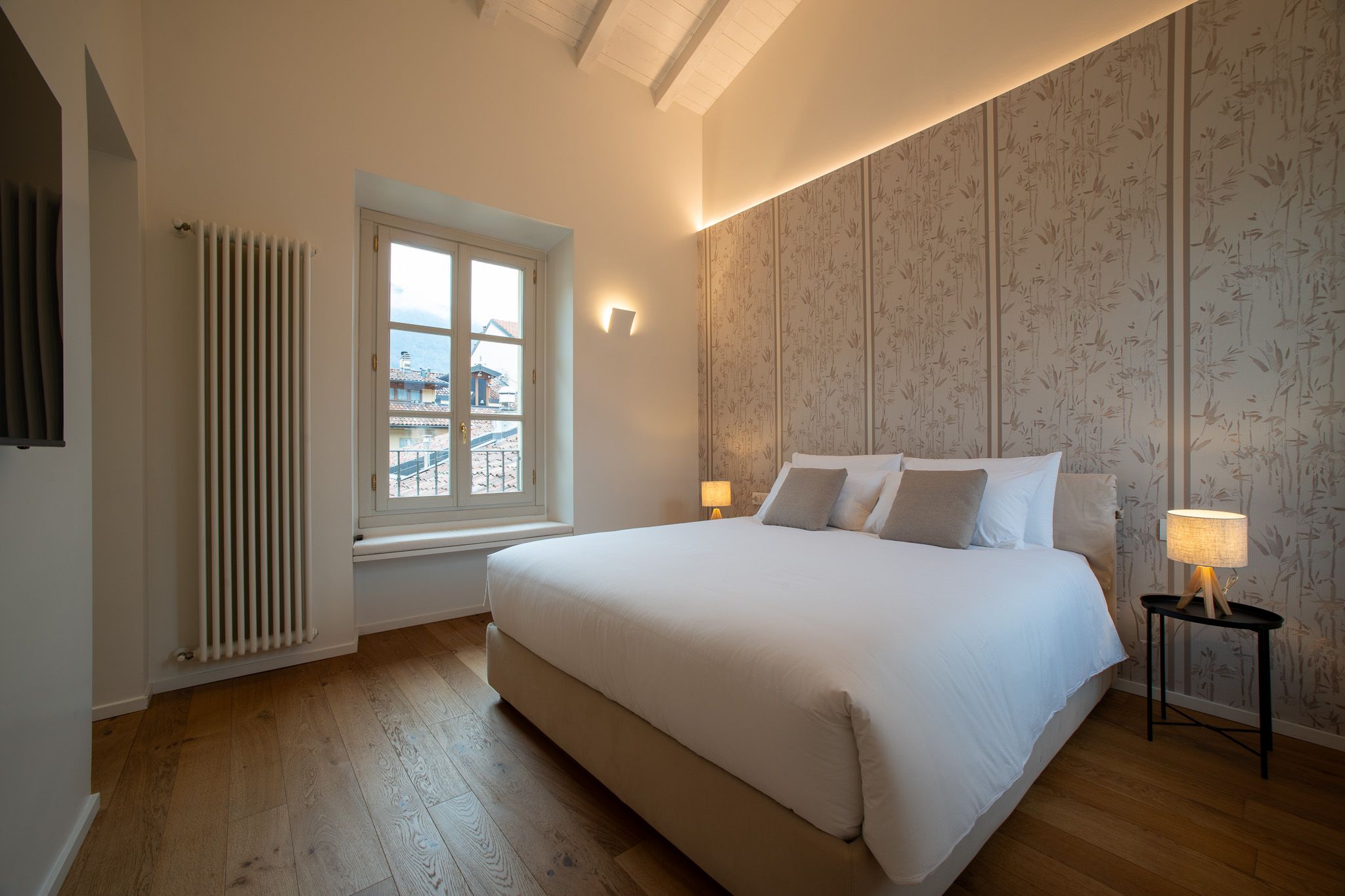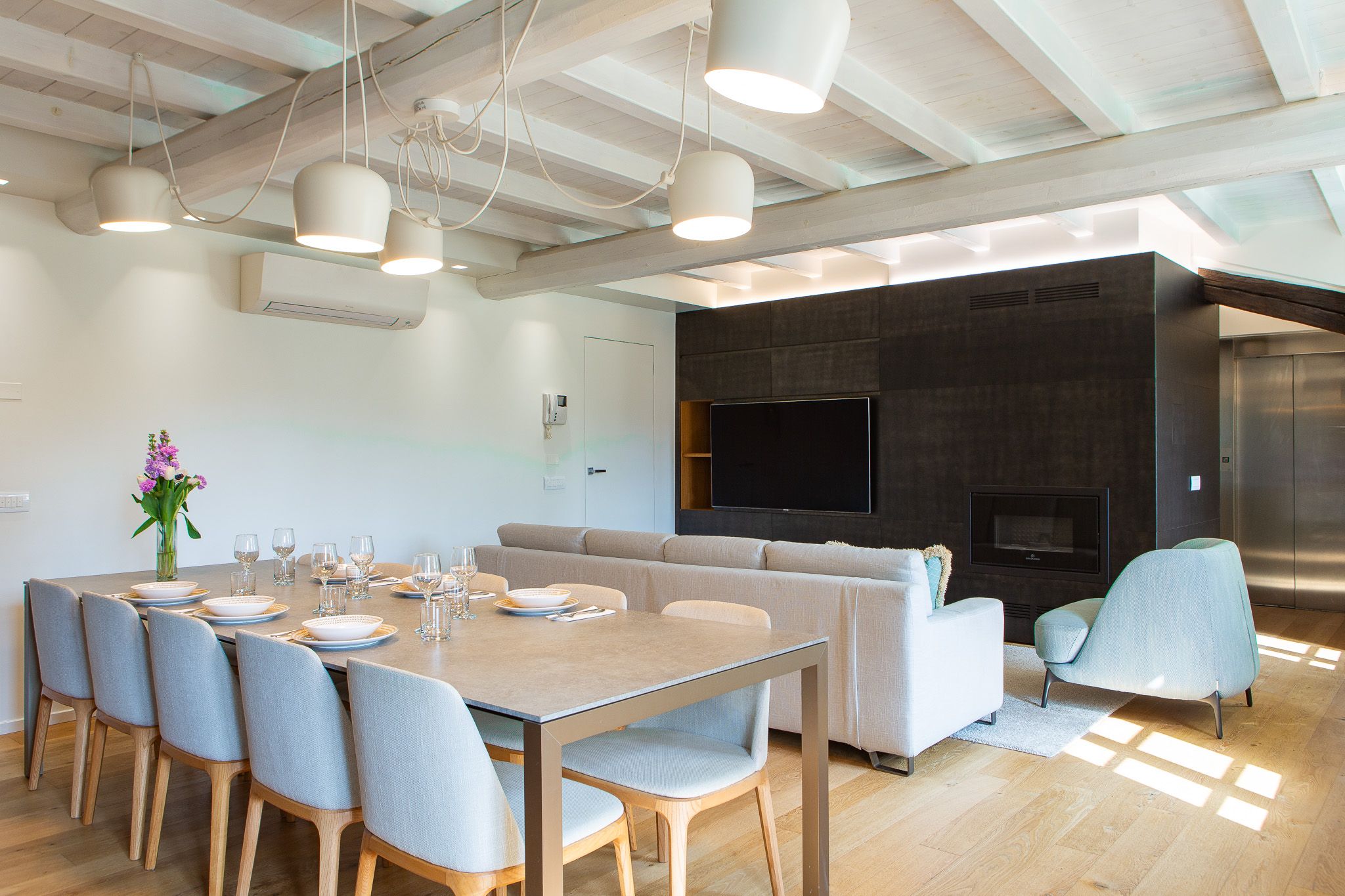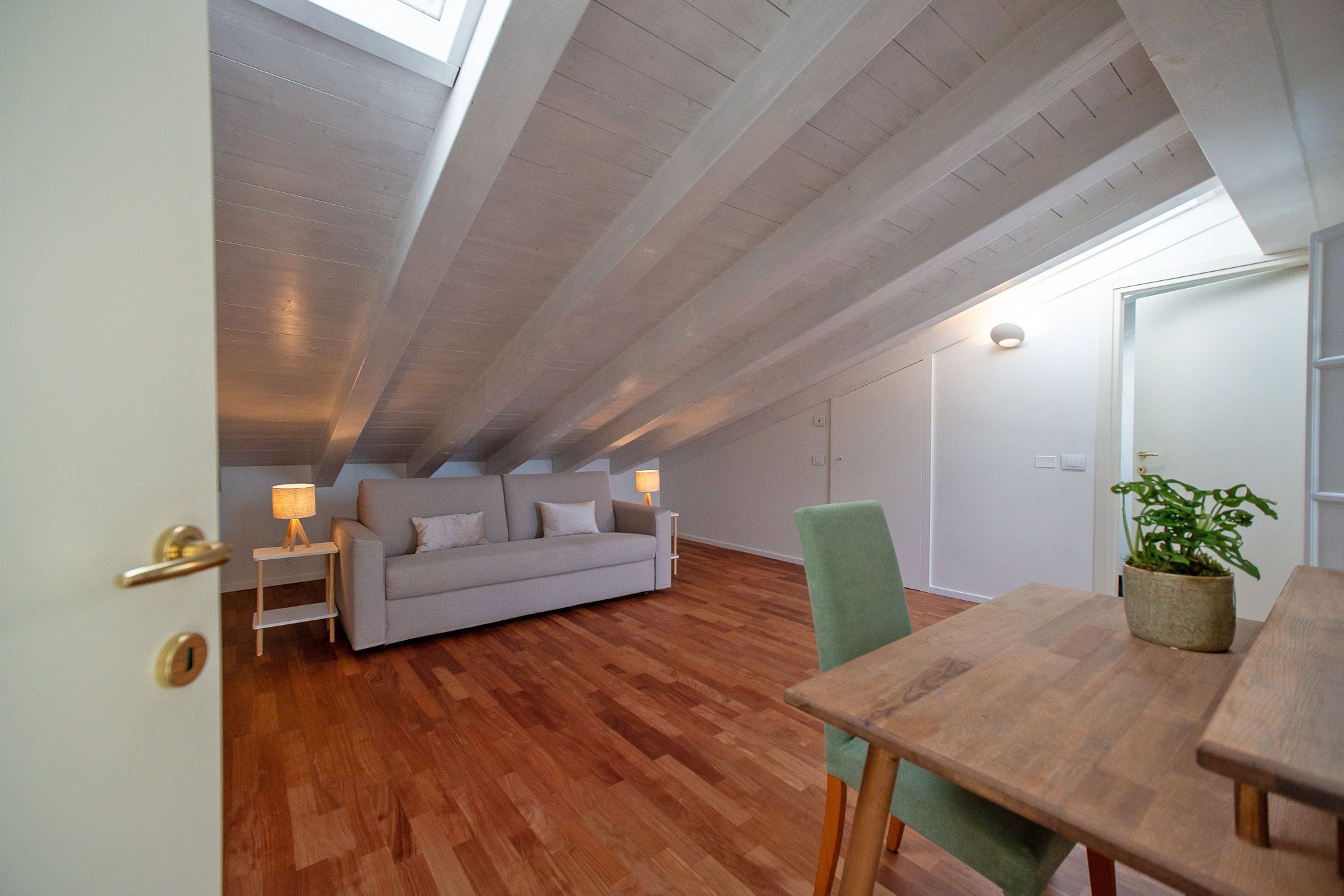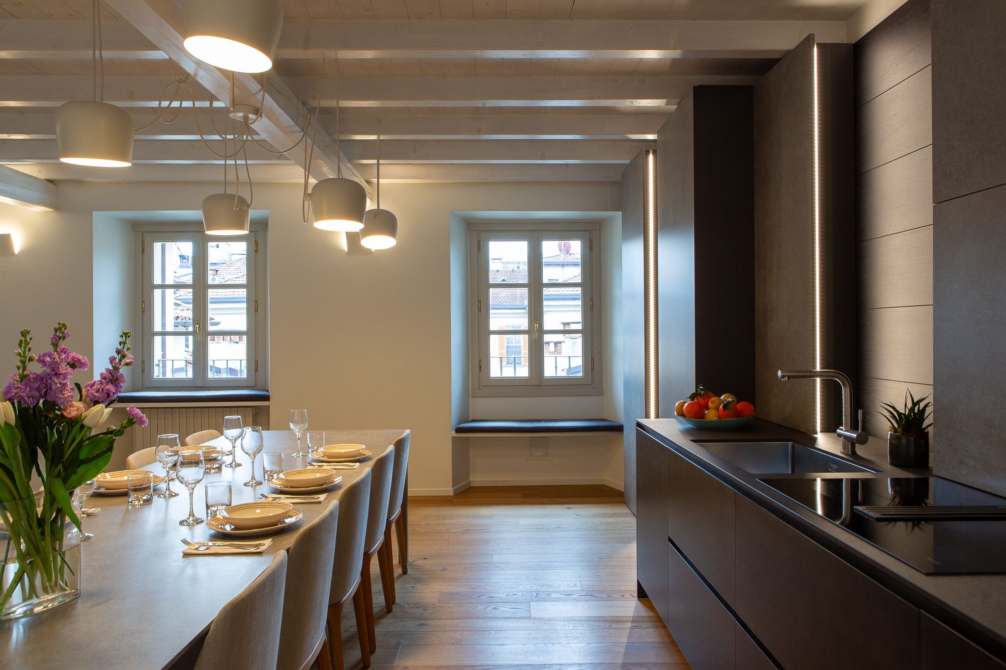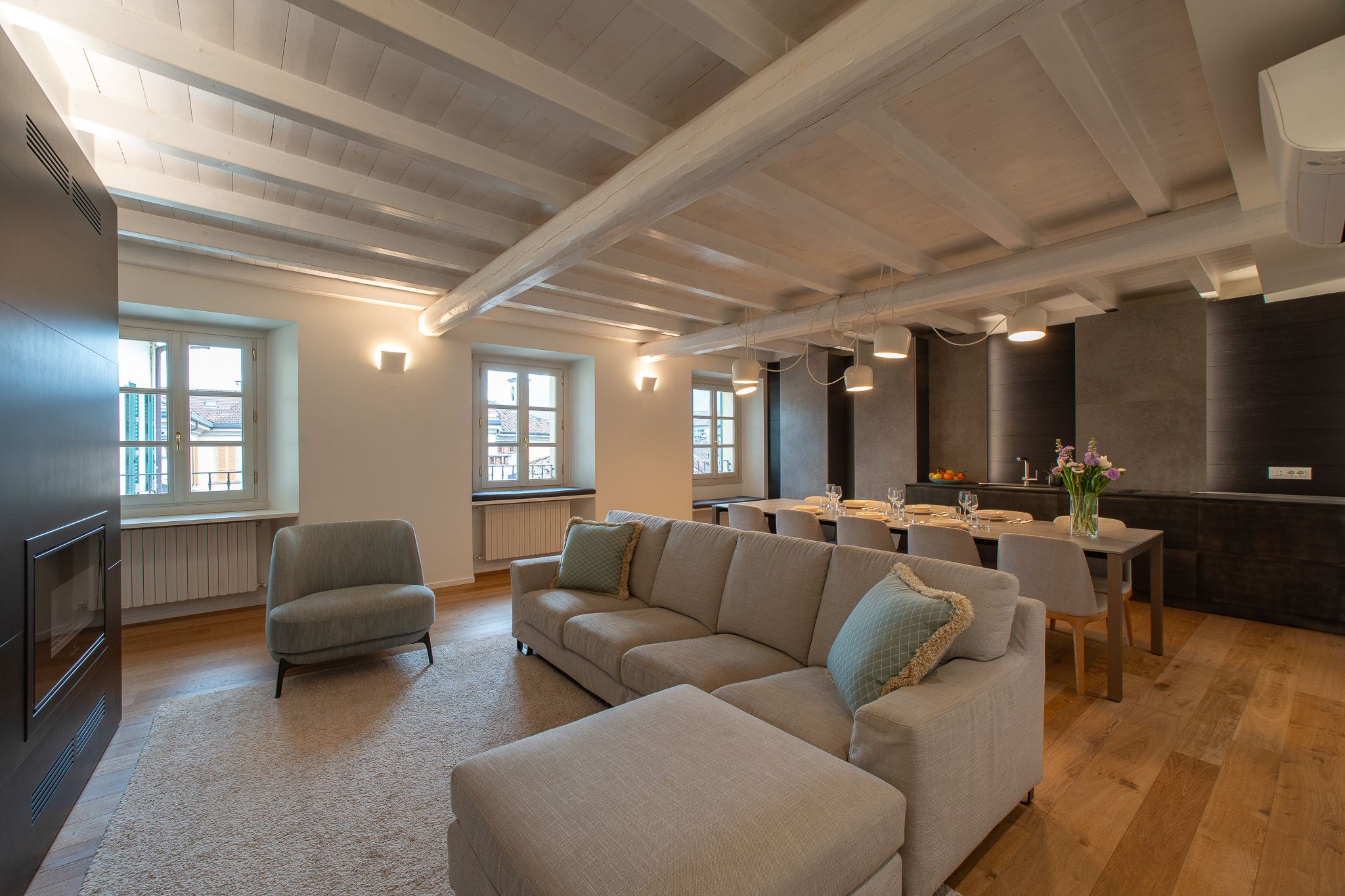 This loft apartment offers a unique blend of city living and peaceful retreat. It’s in the centre of Como, but still feels quiet and tranquil – you can relax here when you're not out exploring Lake Como and its surroundings. The star of the show is the roof terrace, a dreamy spot for dining alfresco while drinking in the view. The apartment is bright and welcoming, with large windows that frame Como views. It’s minimalist in style but has everything you’ll need for a comfortable stay, though two guests will sleep on a sofa bed. We love the elegant dining space… who’s in the mood for pasta?