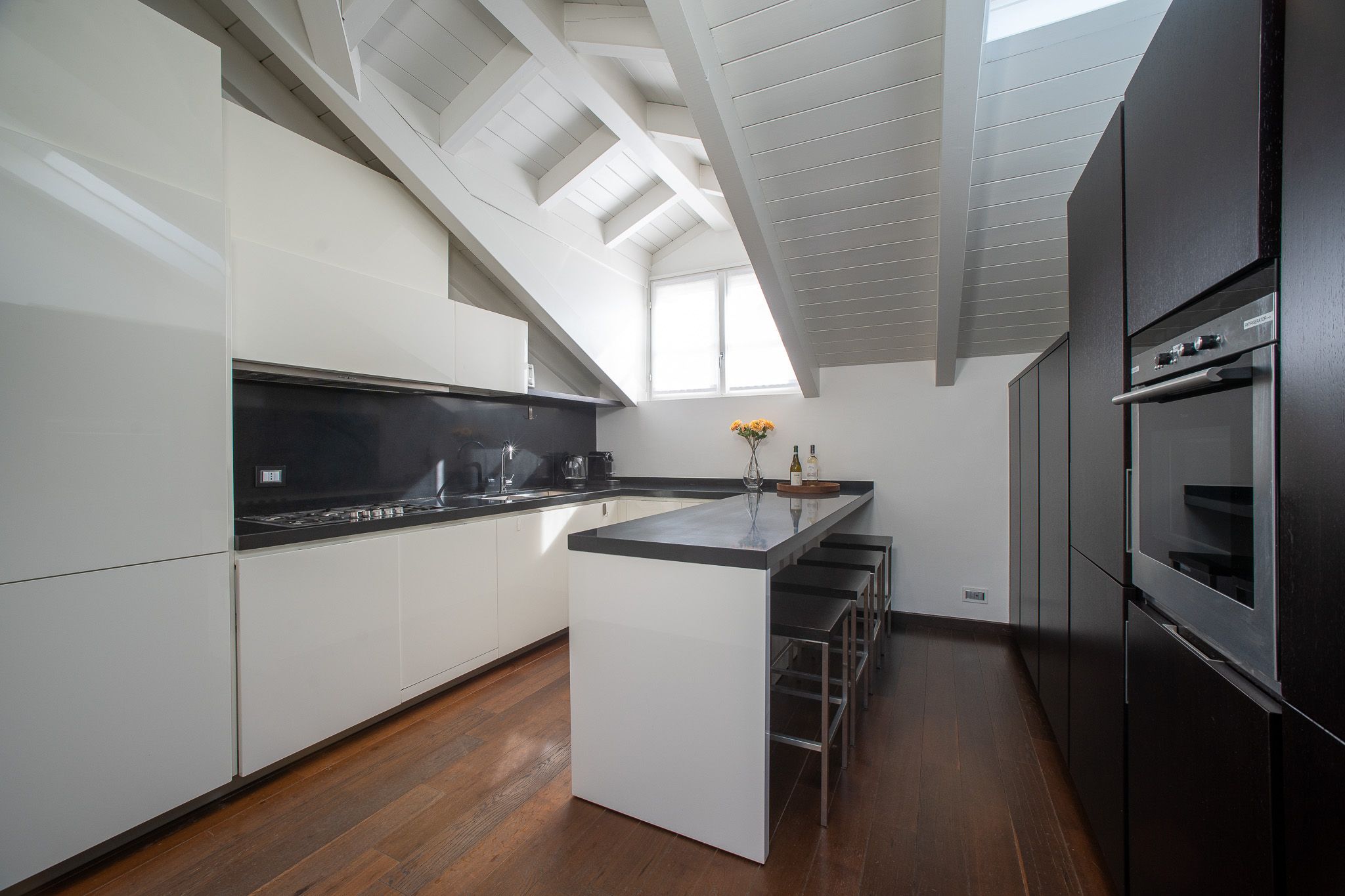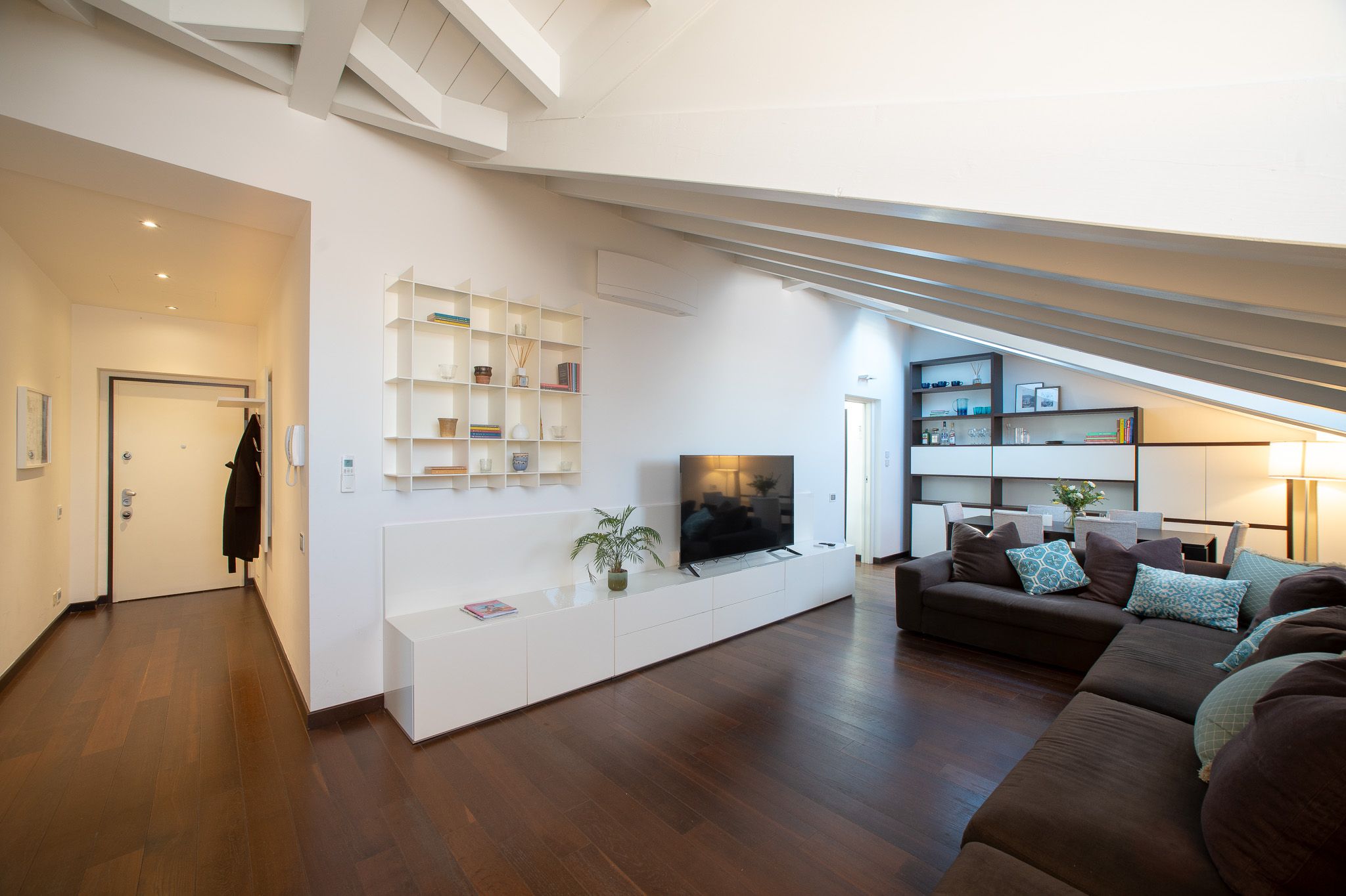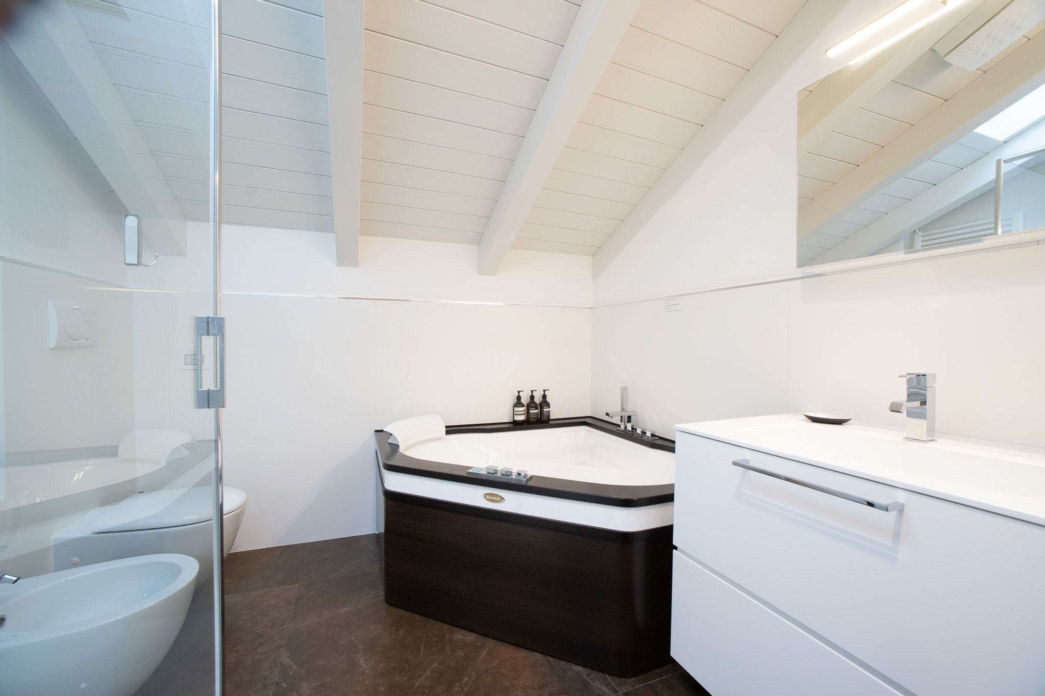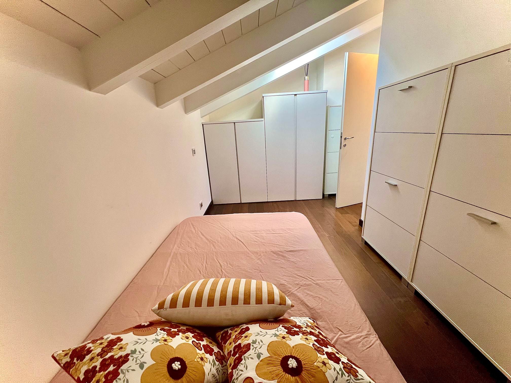 With the shores of Lake Como only five minutes up the road, this good sized apartment boasts an exceptional location to go with its classy interior design. Ideal for couples or solo travellers – although there is room for a third guest in its second bedroom – this home makes good use of its attic setting to incorporate a sleek living room and dining area, as well as a bathroom with its own corner bathtub equipped with jacuzzi jets. With the delights of Como on your doorstep, and both its train station and ferry terminal just ten minutes away, you'll also be utterly free to explore the wonders of the region – and wholly comfortable when you get back home.