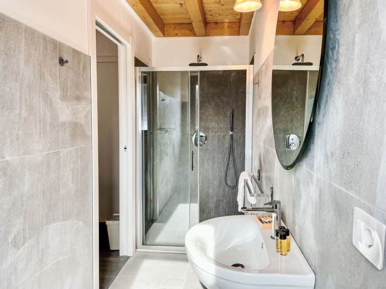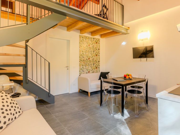 There are five apartments under one roof. We had number two, but I would still choose number four, as it has a much larger terrace and a view of the lake and the campsite. The apartment is spacious and has a luxurious bathroom. Downstairs is one bedroom and upstairs is a loft with two more beds. Beautifully finished and comfortably furnished. Bring your own tea towels, as they aren't provided! There's a lovely little eatery by the lake near the boat launching point. A delicious breakfast, cappuccino for €1.50, and the pasta is also delicious. A great value!