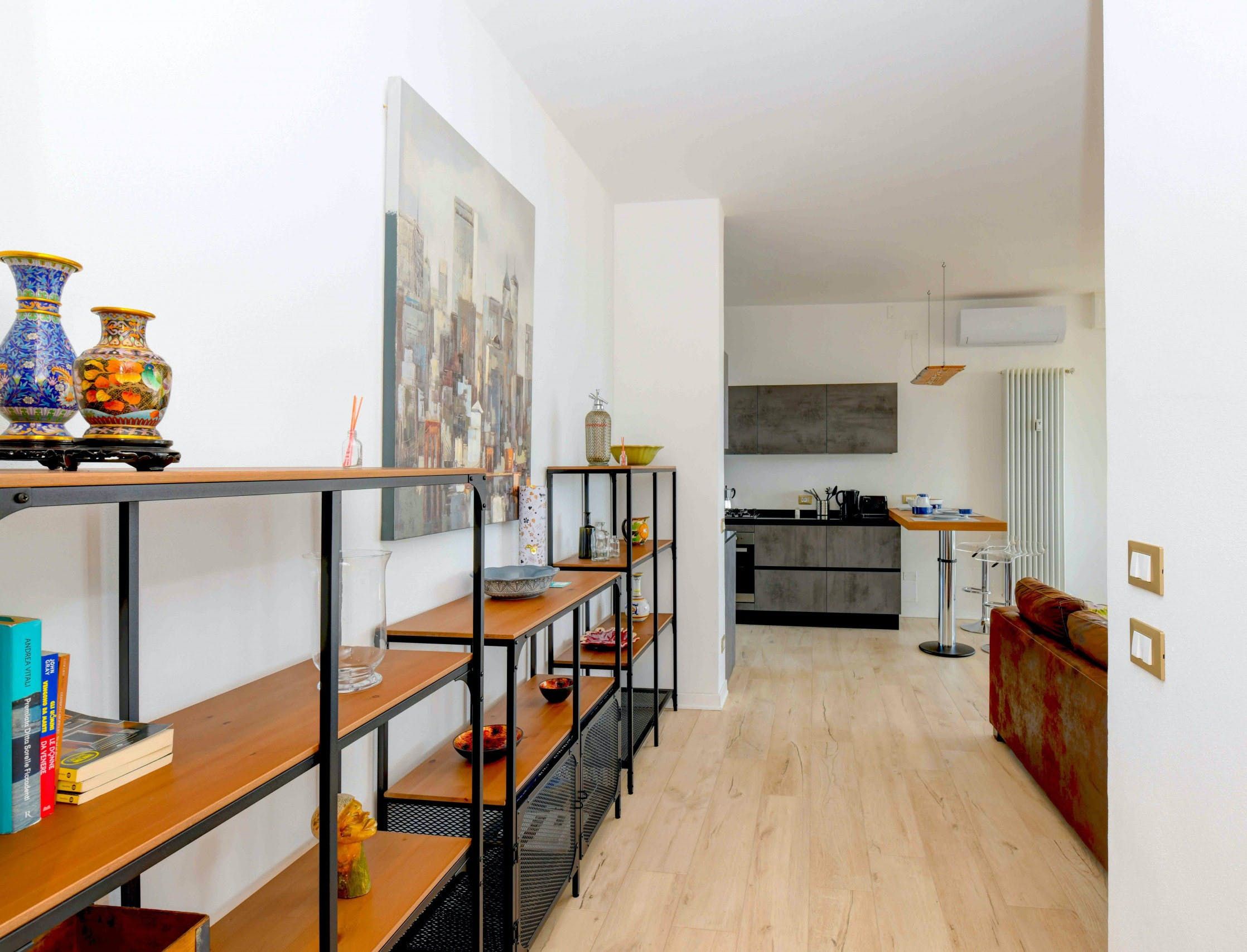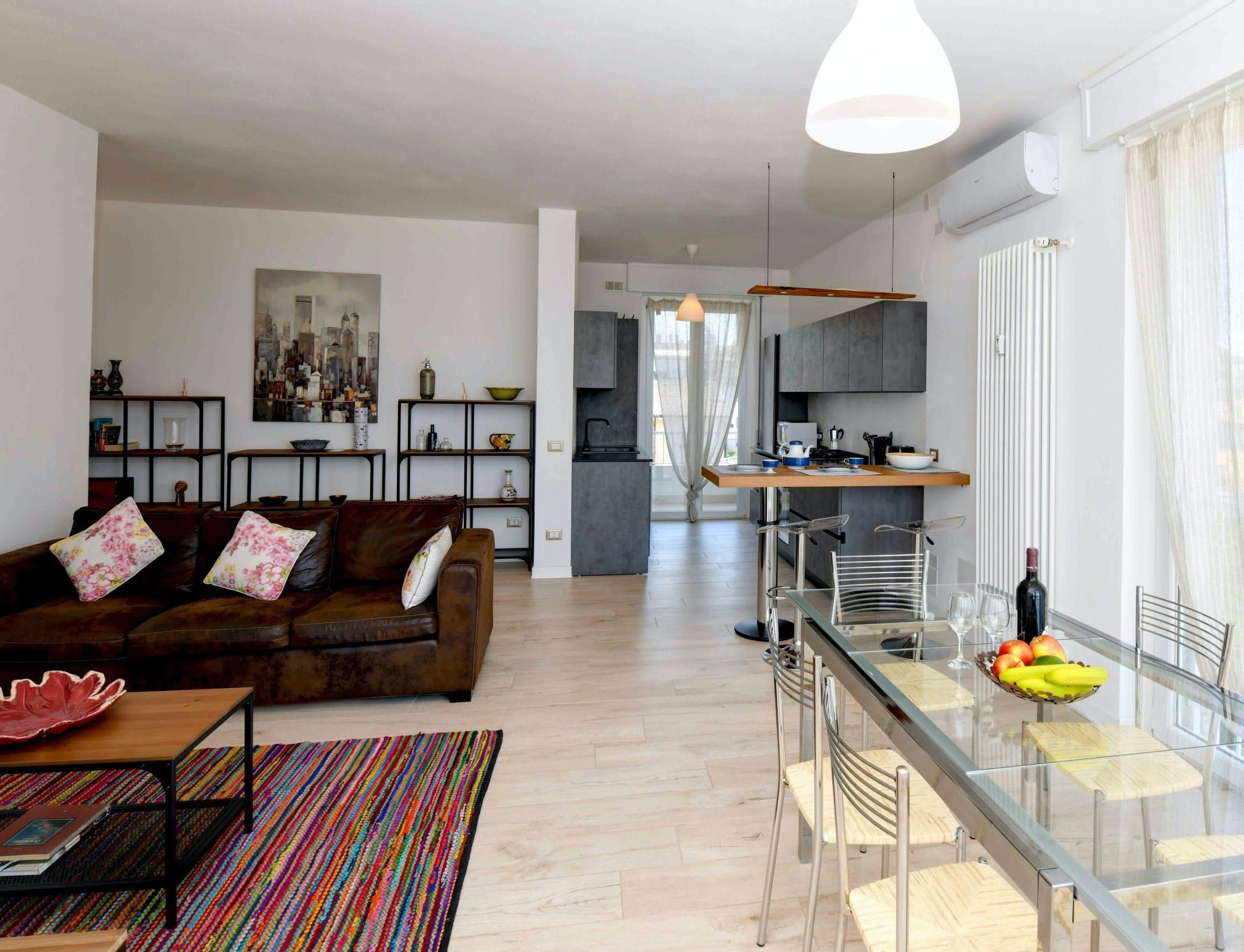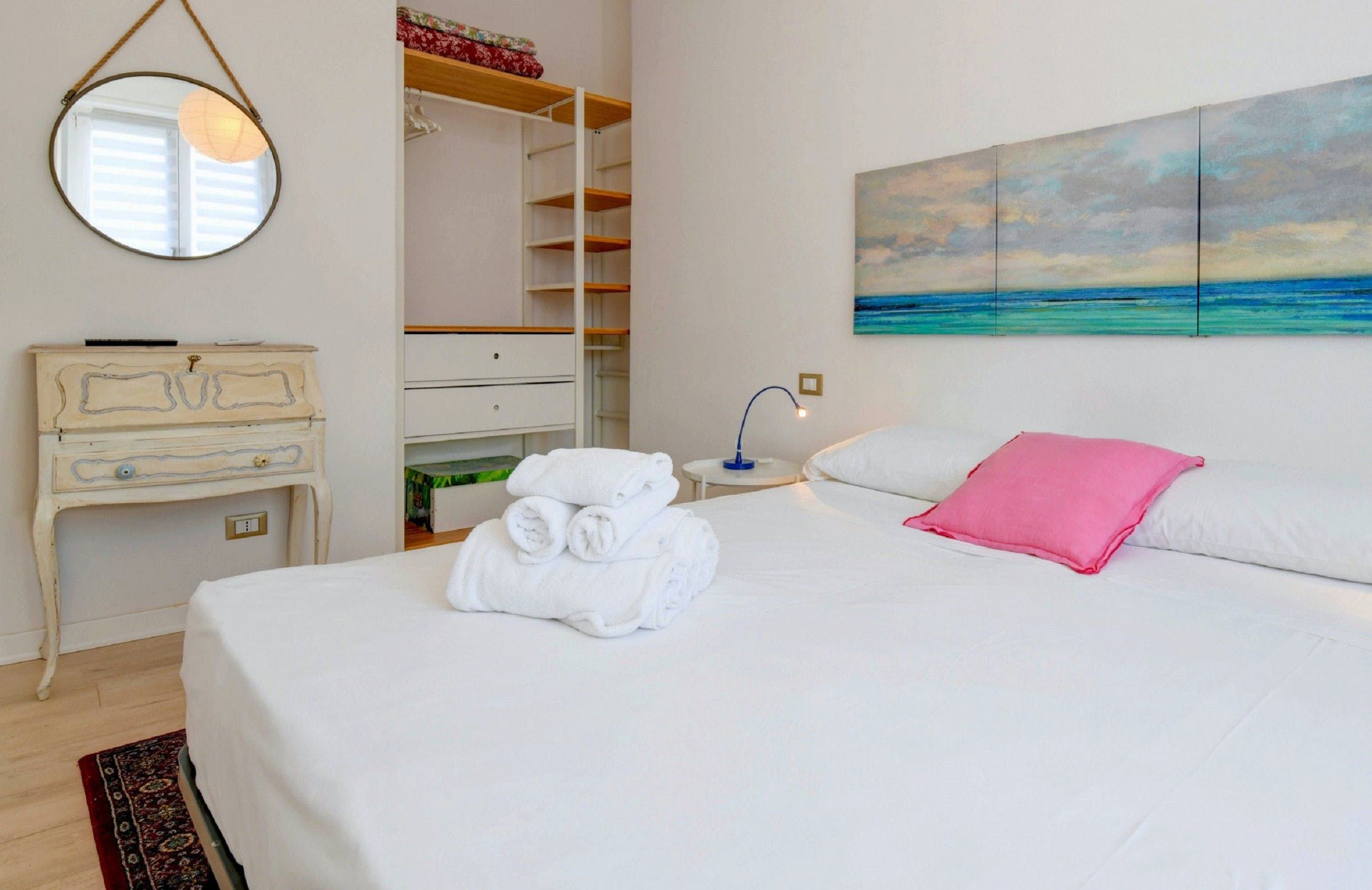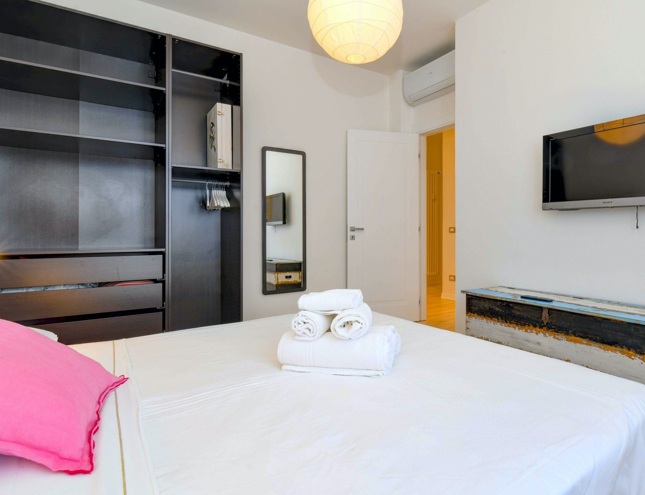 The first thing that grabs you as soon as you step inside is the view from the living area’s big windows. The vista of red-roofed houses leading to the shores of Lake Garda takes pride of place as if it’s a work of art hanging on the wall. Lightwood floors and white walls keep things feeling bright and the glass dining table sits in a particularly sunny corner, surrounded by windows. There’s plenty of room to prep meals in the open kitchen, thanks to a wooden breakfast bar. A little, unfurnished balcony provides a space to step out and breathe in the fresh, lake air.