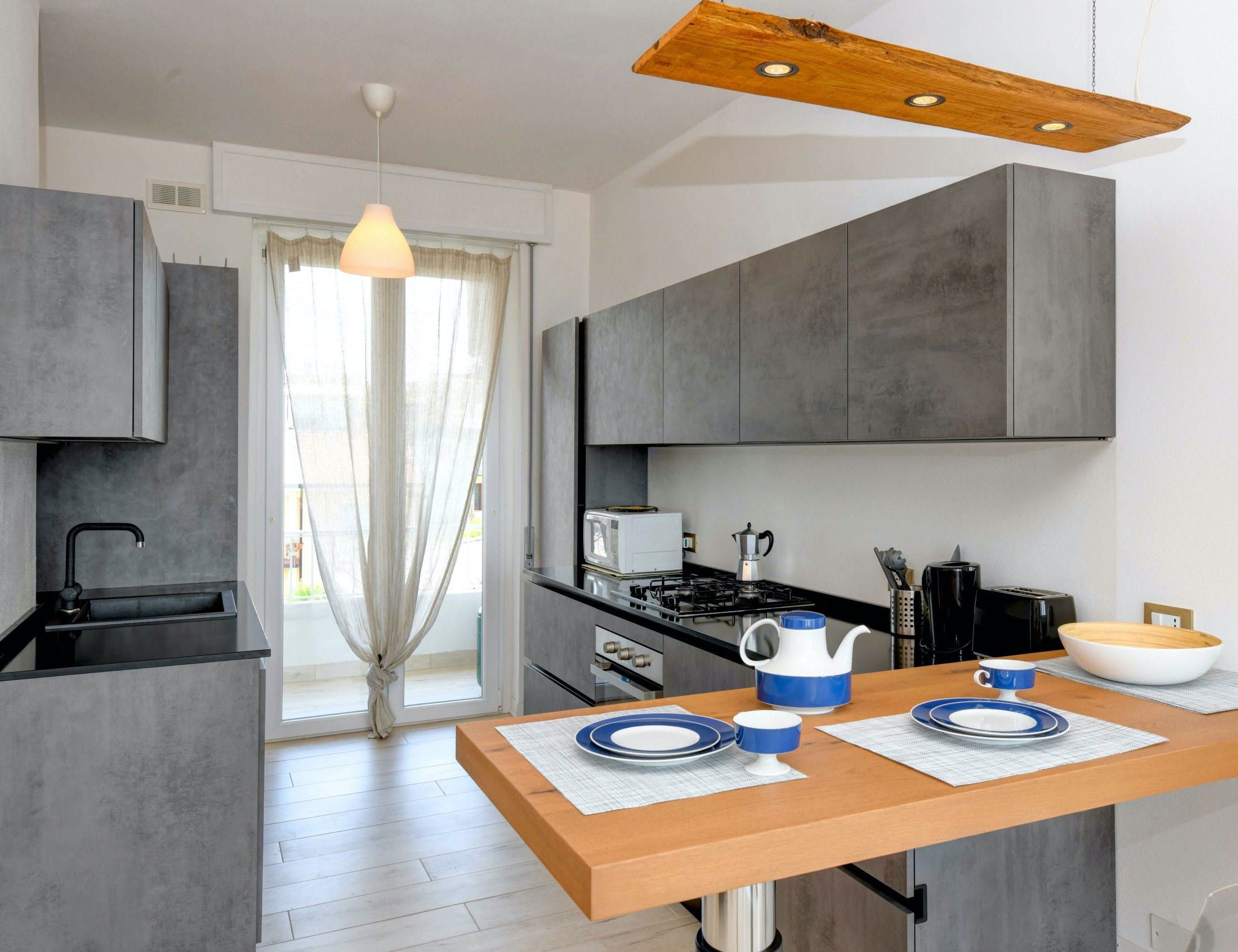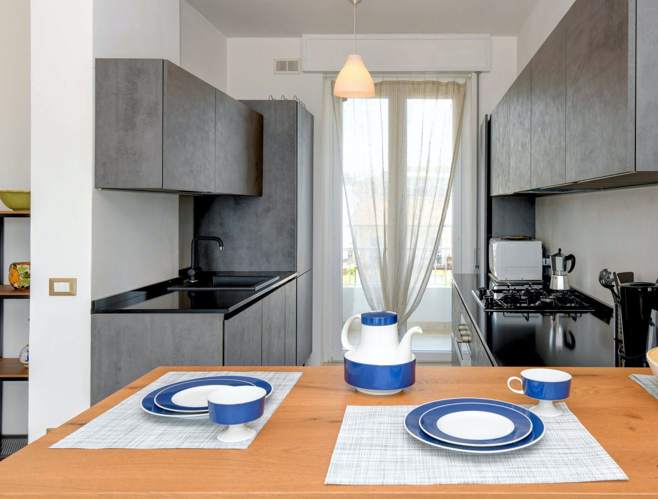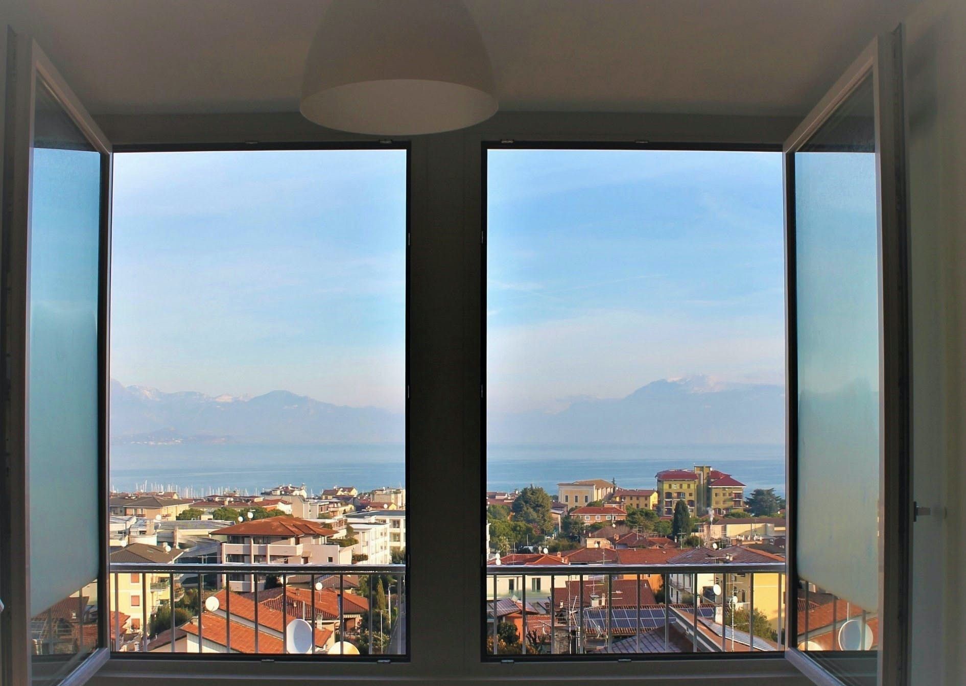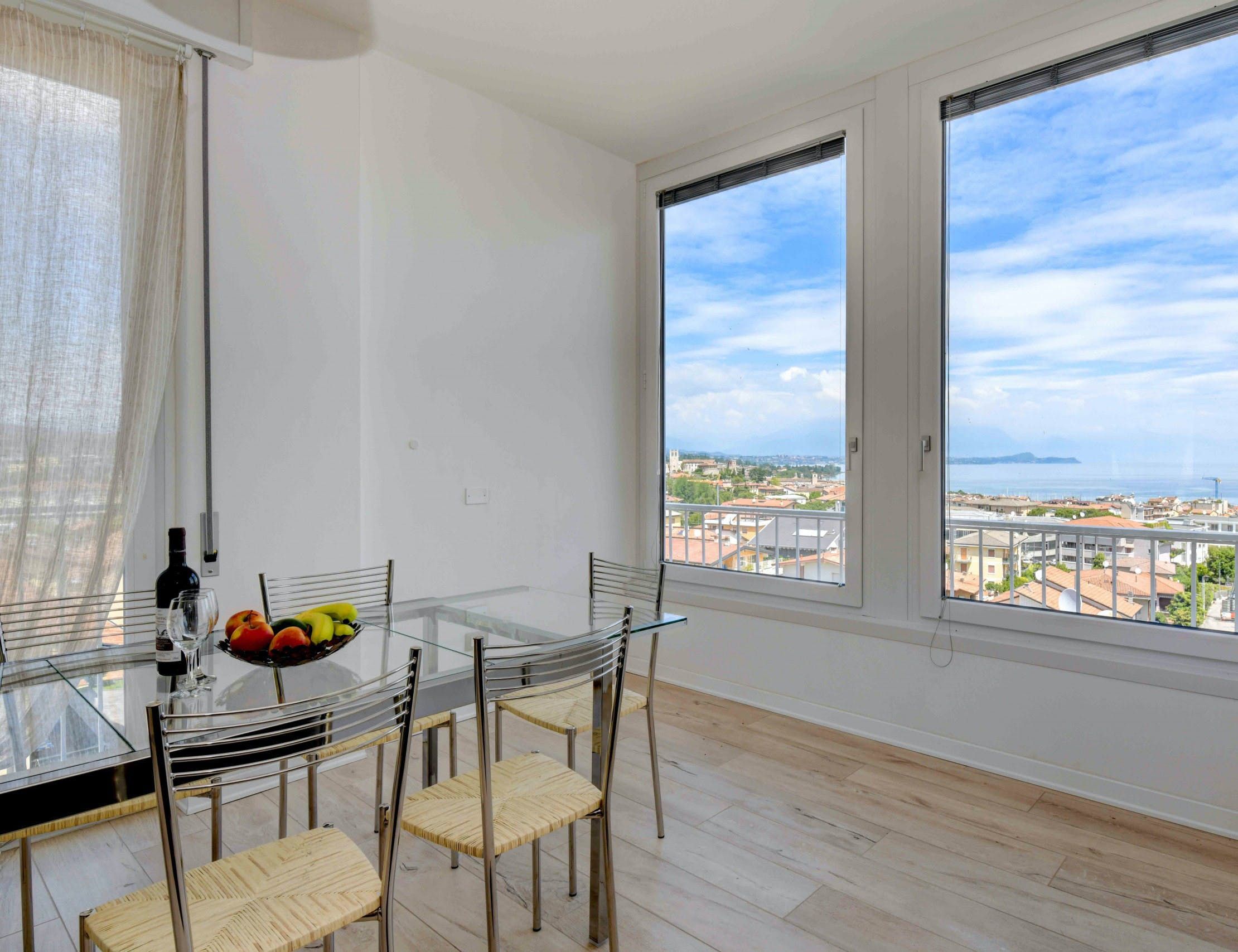 The first thing that grabs you as soon as you step inside is the view from the living area’s big windows. The vista of red-roofed houses leading to the shores of Lake Garda takes pride of place as if it’s a work of art hanging on the wall. Lightwood floors and white walls keep things feeling bright and the glass dining table sits in a particularly sunny corner, surrounded by windows. There’s plenty of room to prep meals in the open kitchen, thanks to a wooden breakfast bar. A little, unfurnished balcony provides a space to step out and breathe in the fresh, lake air.