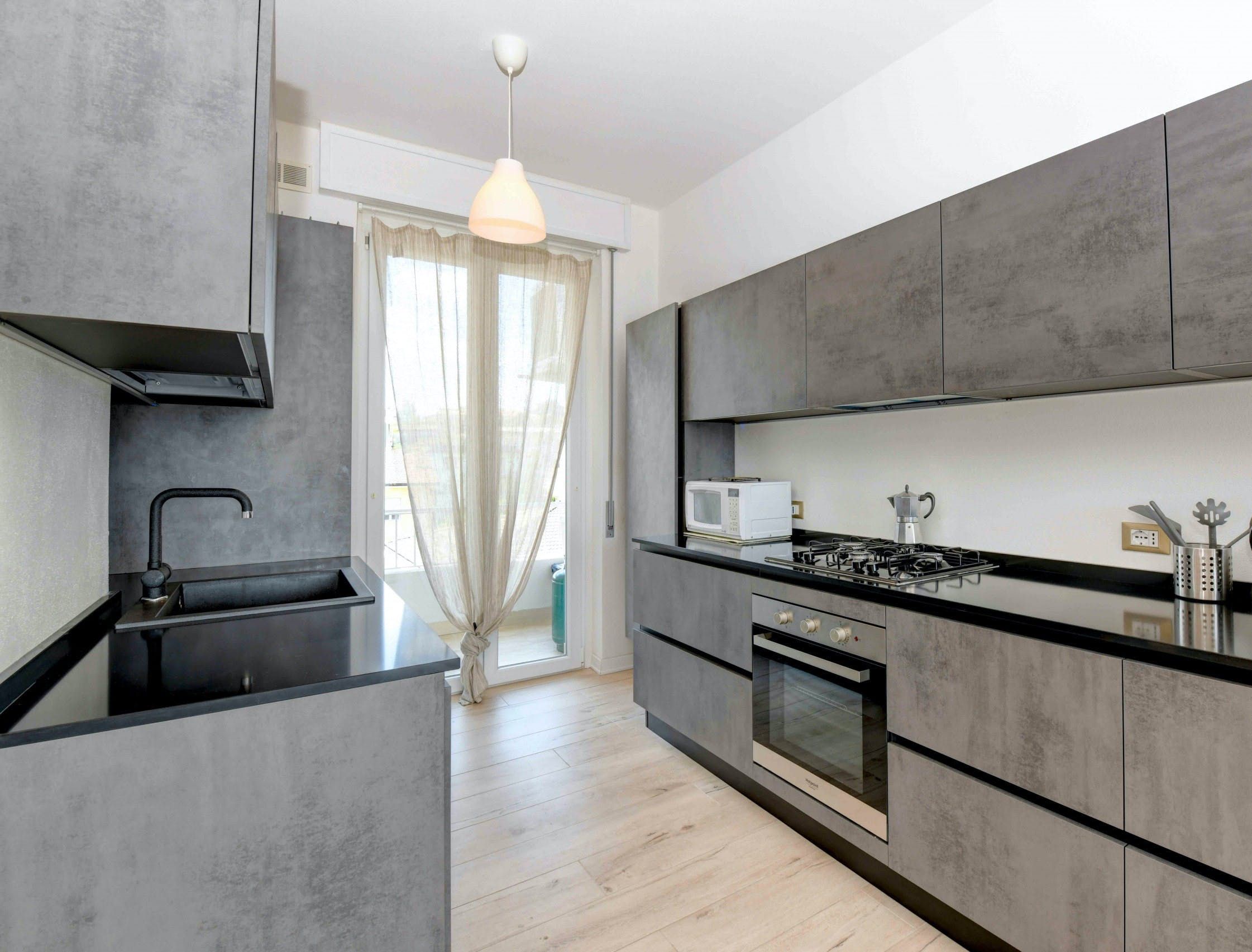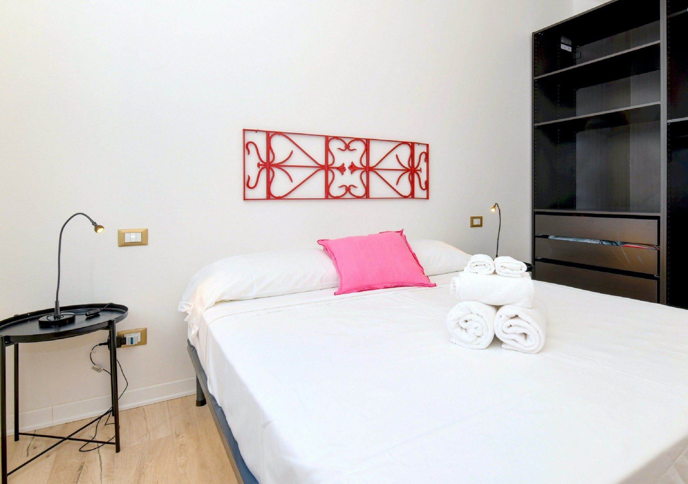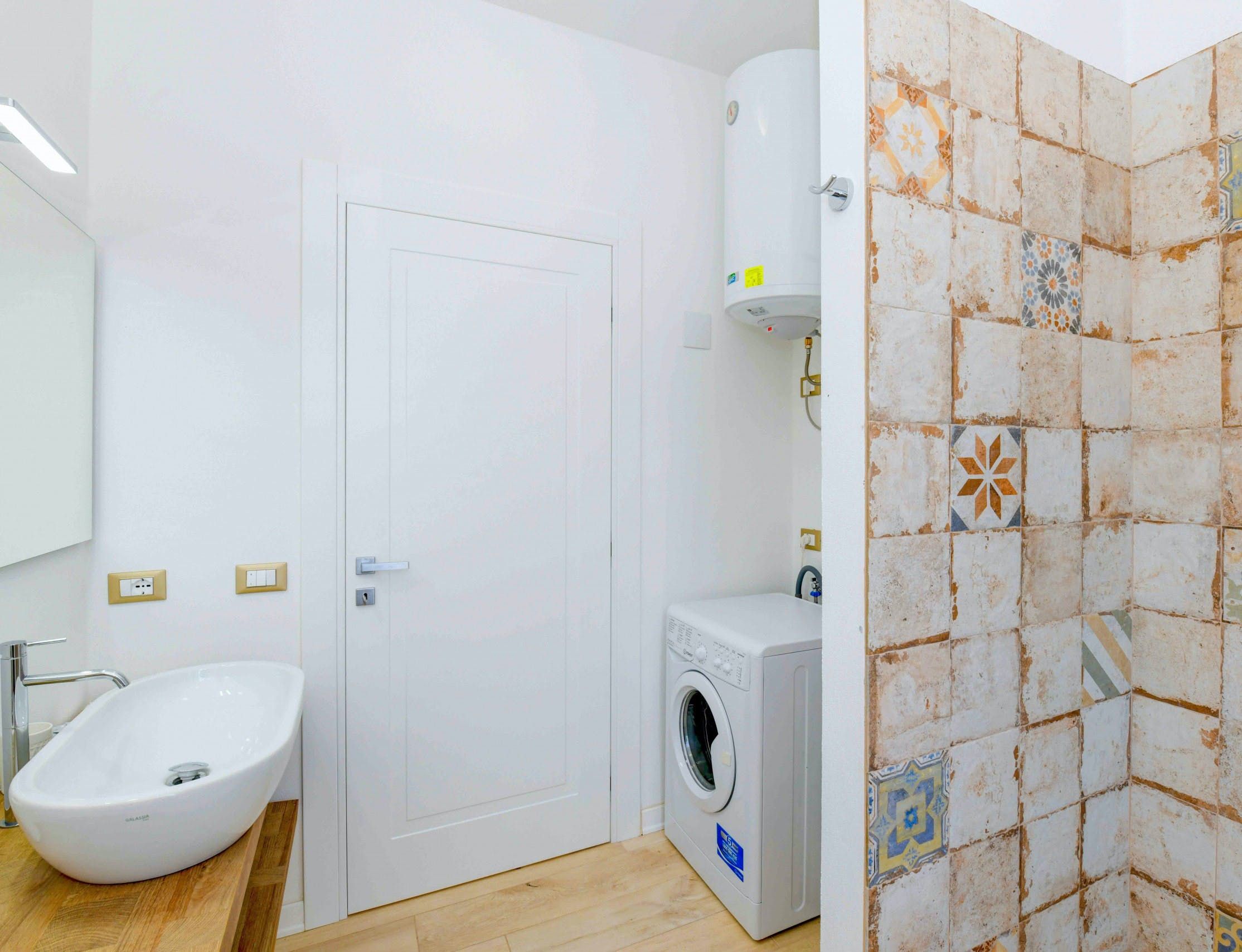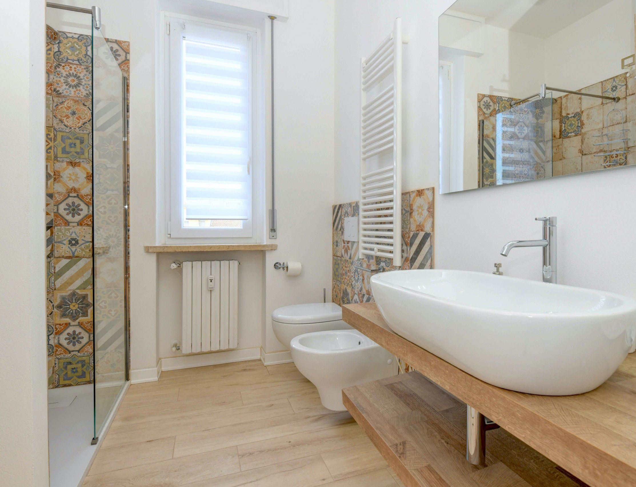 The first thing that grabs you as soon as you step inside is the view from the living area’s big windows. The vista of red-roofed houses leading to the shores of Lake Garda takes pride of place as if it’s a work of art hanging on the wall. Lightwood floors and white walls keep things feeling bright and the glass dining table sits in a particularly sunny corner, surrounded by windows. There’s plenty of room to prep meals in the open kitchen, thanks to a wooden breakfast bar. A little, unfurnished balcony provides a space to step out and breathe in the fresh, lake air.