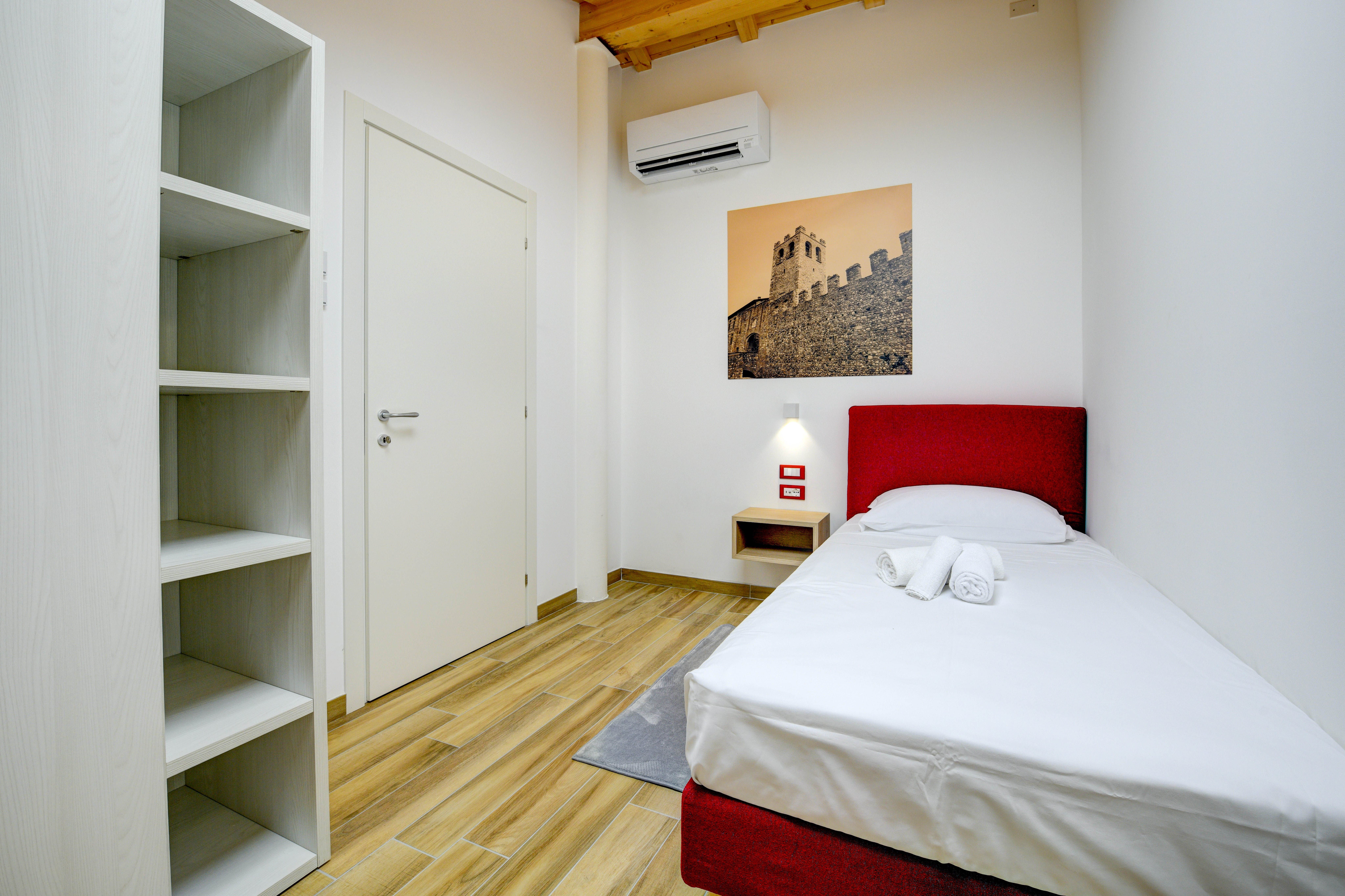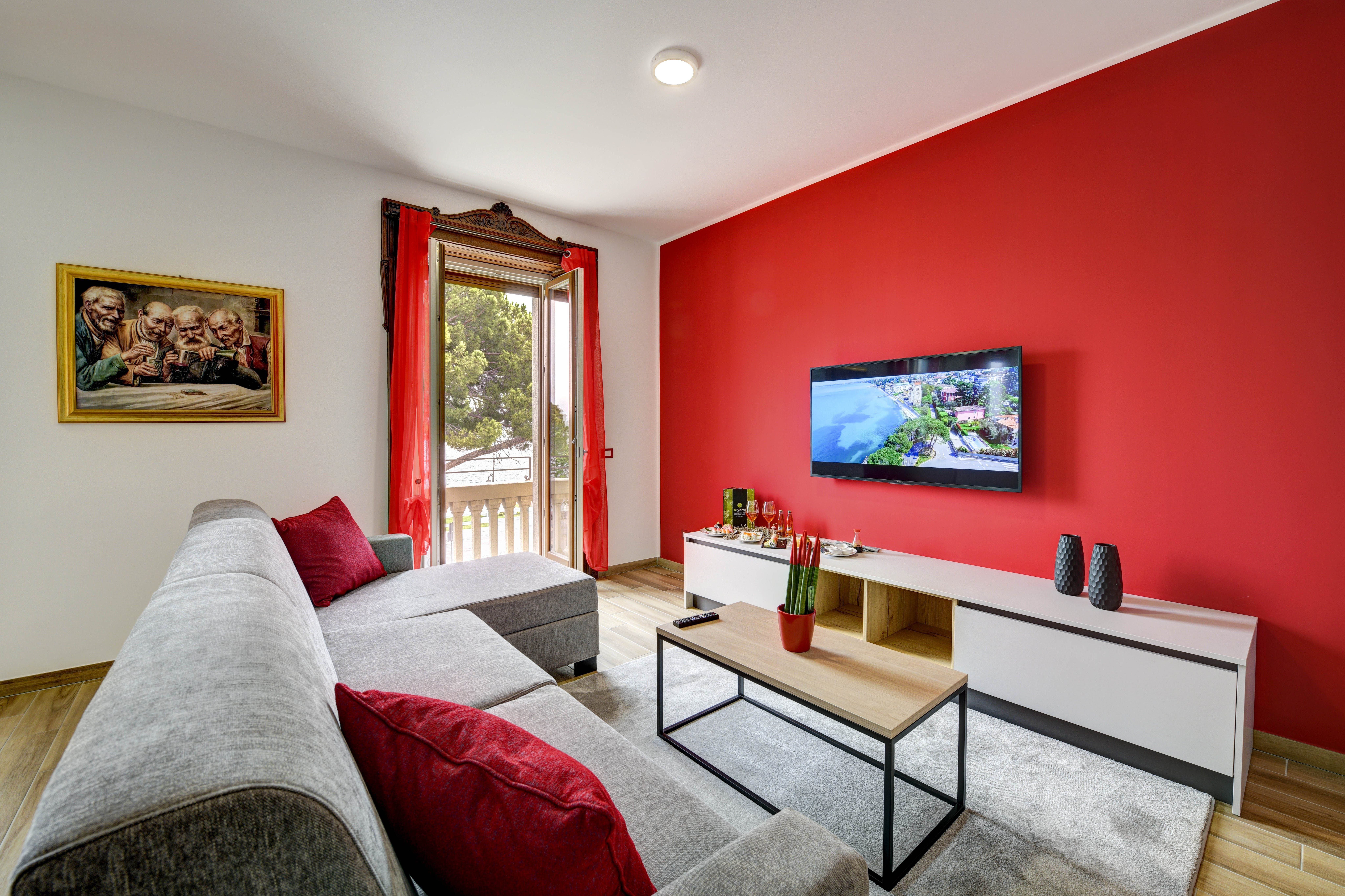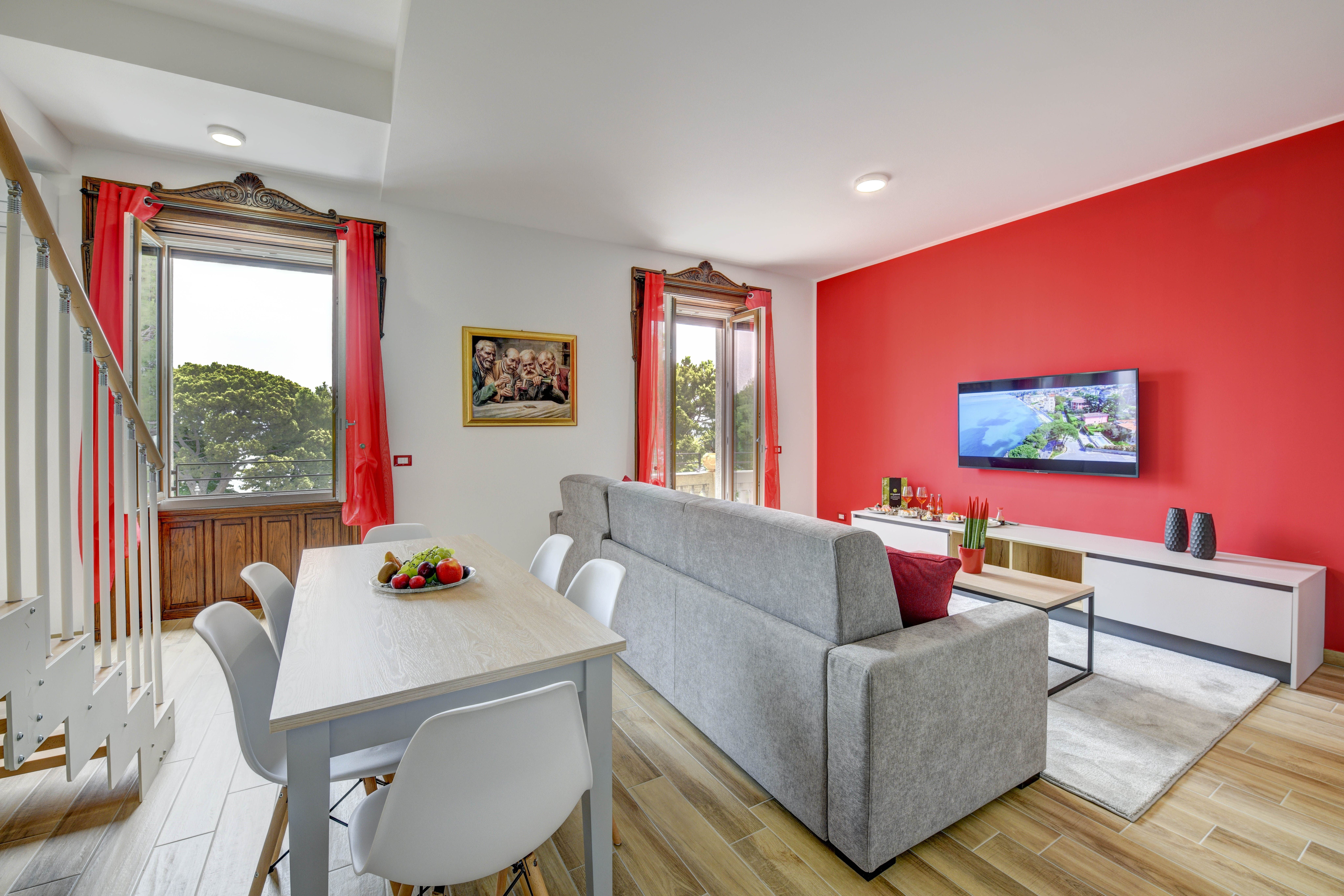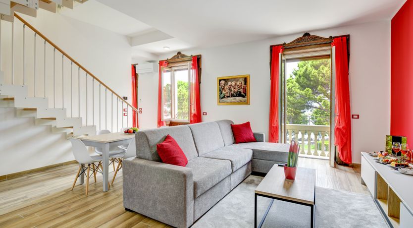 A stone's throw from the sandy shores and harbour of Lake Garda lies this beautiful apartment, bathed in red. Spread over two floors, everyone will have the space to stretch their legs here. Lounge on the sofa in the open-plan living space while natural light fills the home, or breathe in the fresh air and lakeside views from the cosy balcony. The rich history of the building can be glimpsed in the touches of the original construction that were kept after the 2021 renovation – the wrought iron decor on the staircase railings, and the ornate windows. The traditional blends seamlessly with the modern, with the fully-equipped kitchen allowing you to whip up some fantastic home-cooked meals. That is, when you're not out exploring the dining opportunities that Desenzano del Garda has to offer.