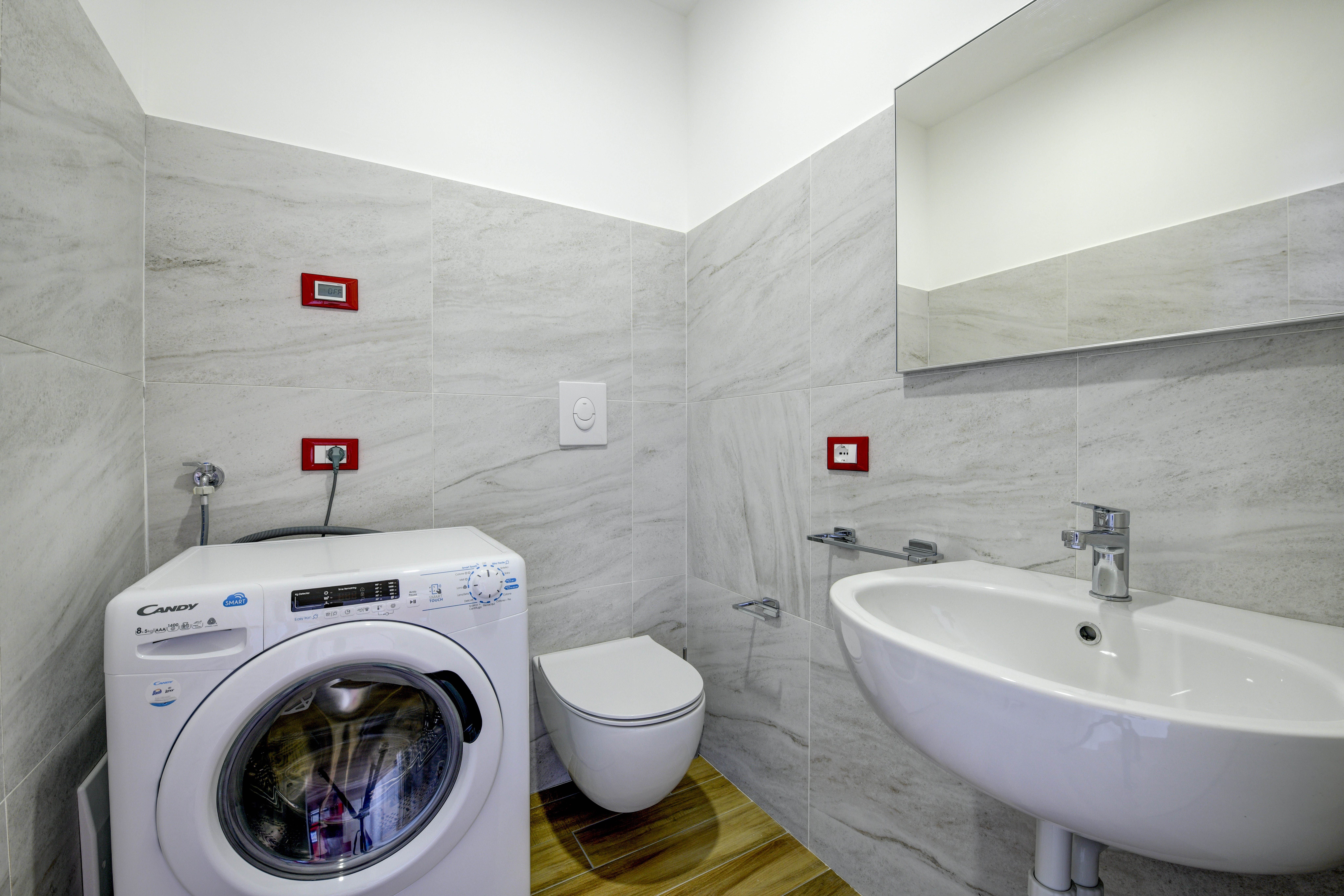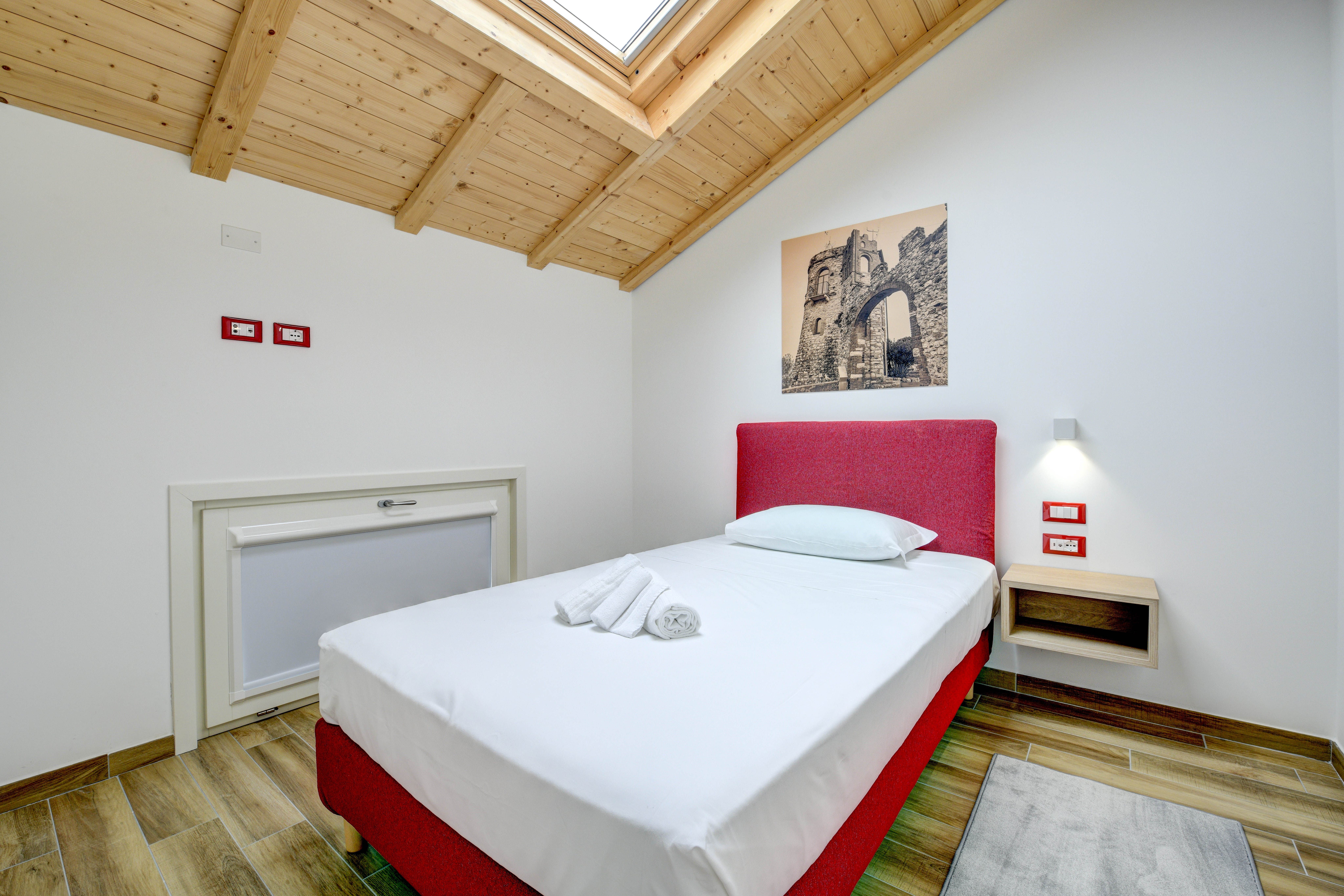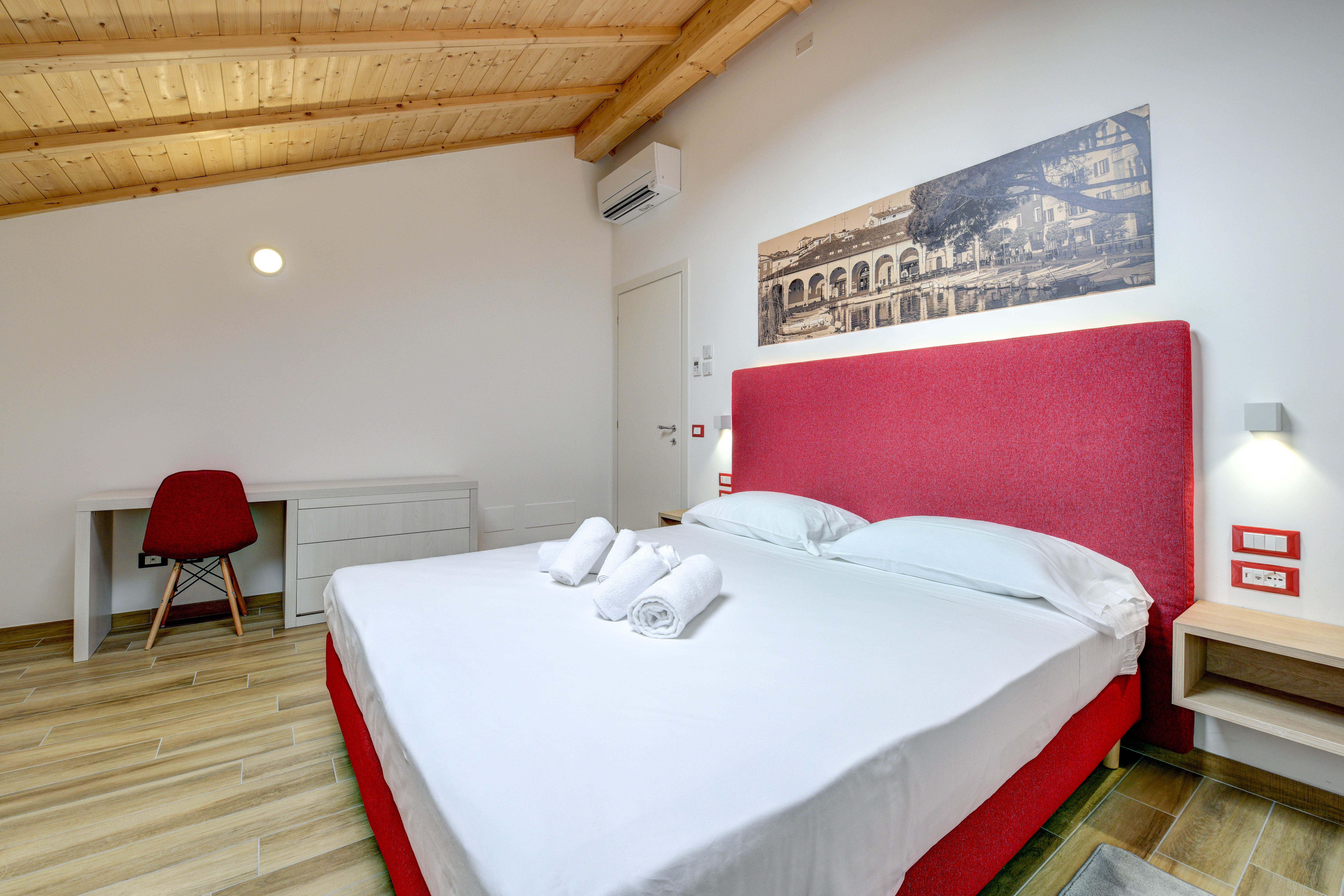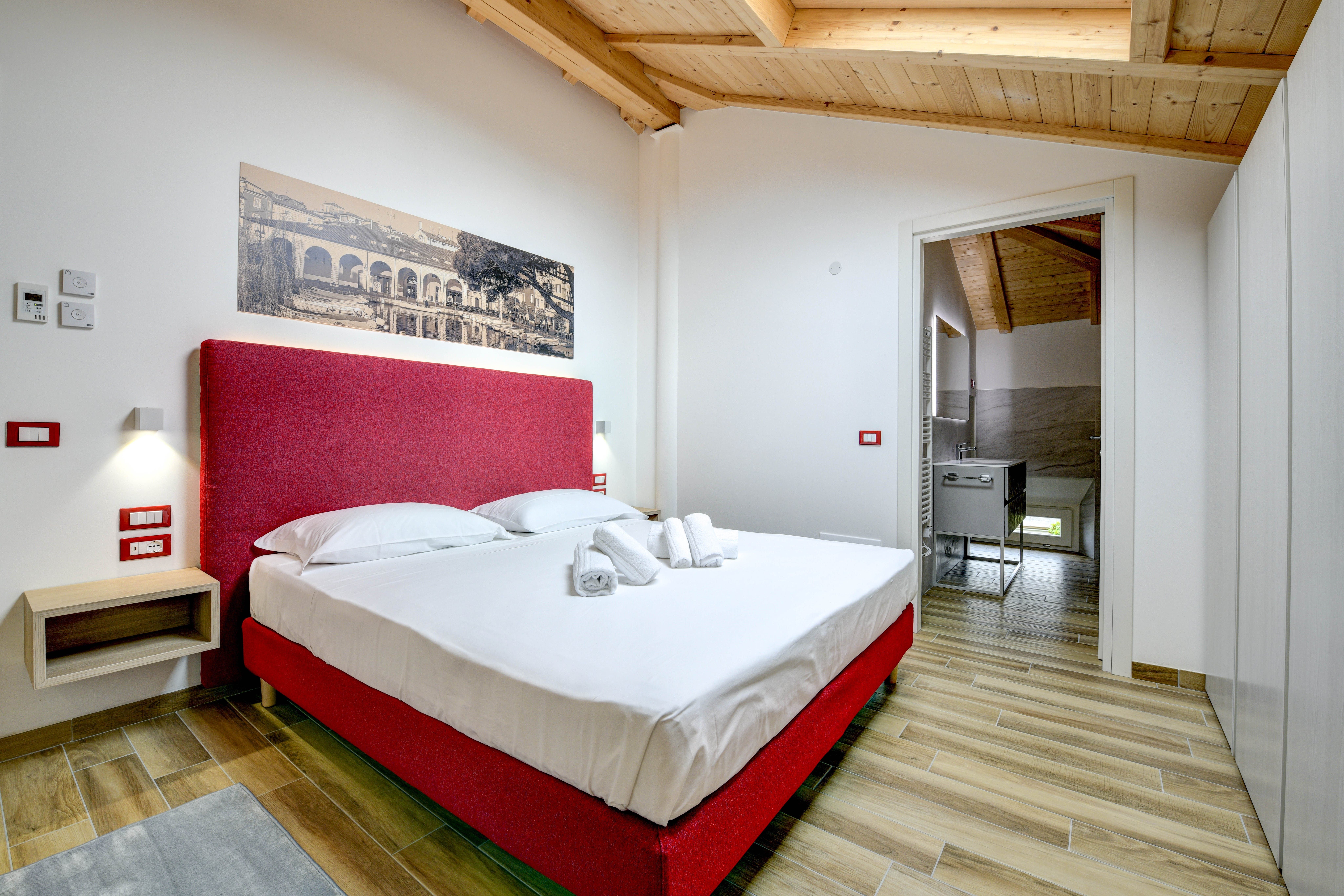 A stone's throw from the sandy shores and harbour of Lake Garda lies this beautiful apartment, bathed in red. Spread over two floors, everyone will have the space to stretch their legs here. Lounge on the sofa in the open-plan living space while natural light fills the home, or breathe in the fresh air and lakeside views from the cosy balcony. The rich history of the building can be glimpsed in the touches of the original construction that were kept after the 2021 renovation – the wrought iron decor on the staircase railings, and the ornate windows. The traditional blends seamlessly with the modern, with the fully-equipped kitchen allowing you to whip up some fantastic home-cooked meals. That is, when you're not out exploring the dining opportunities that Desenzano del Garda has to offer.