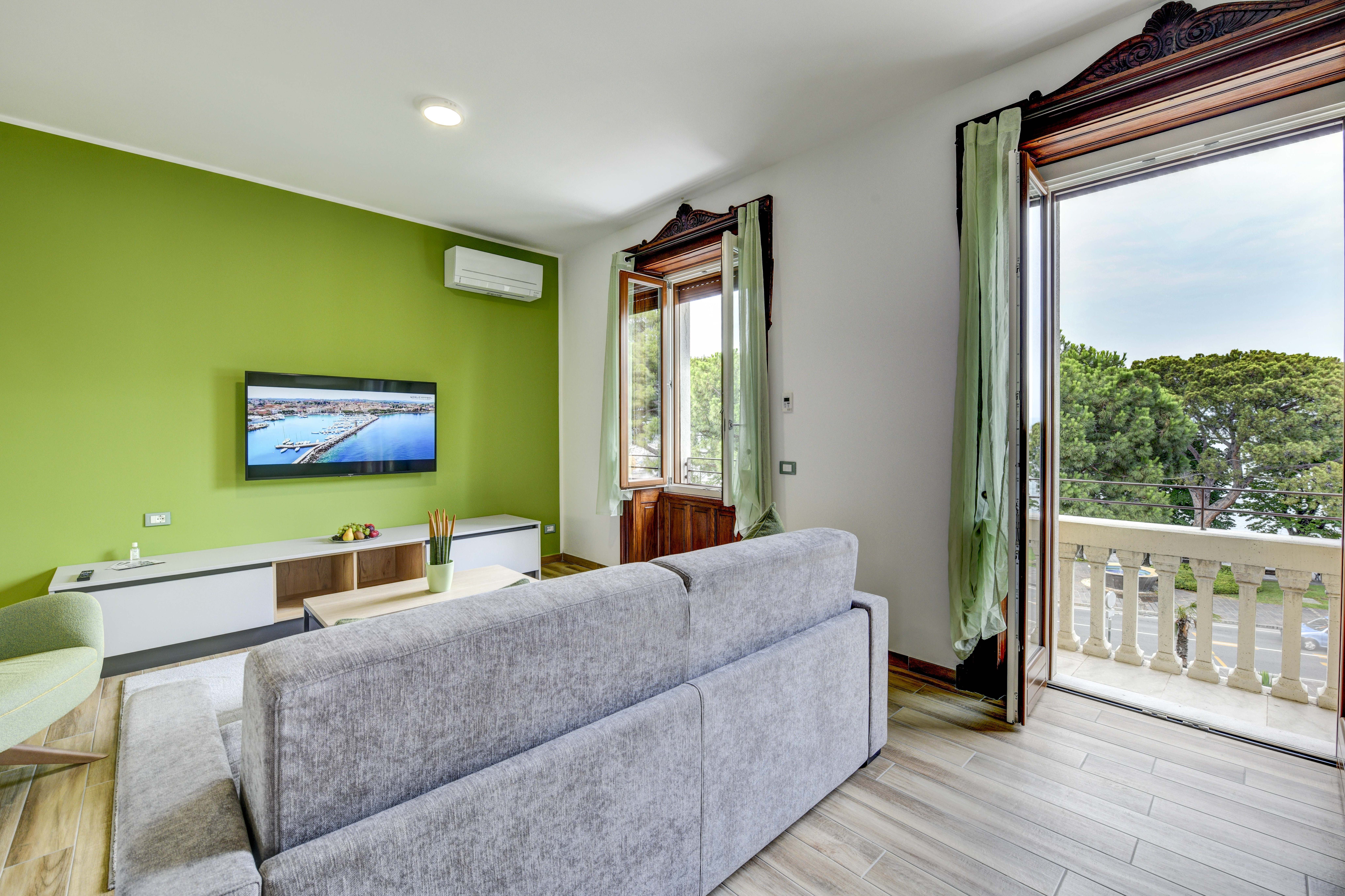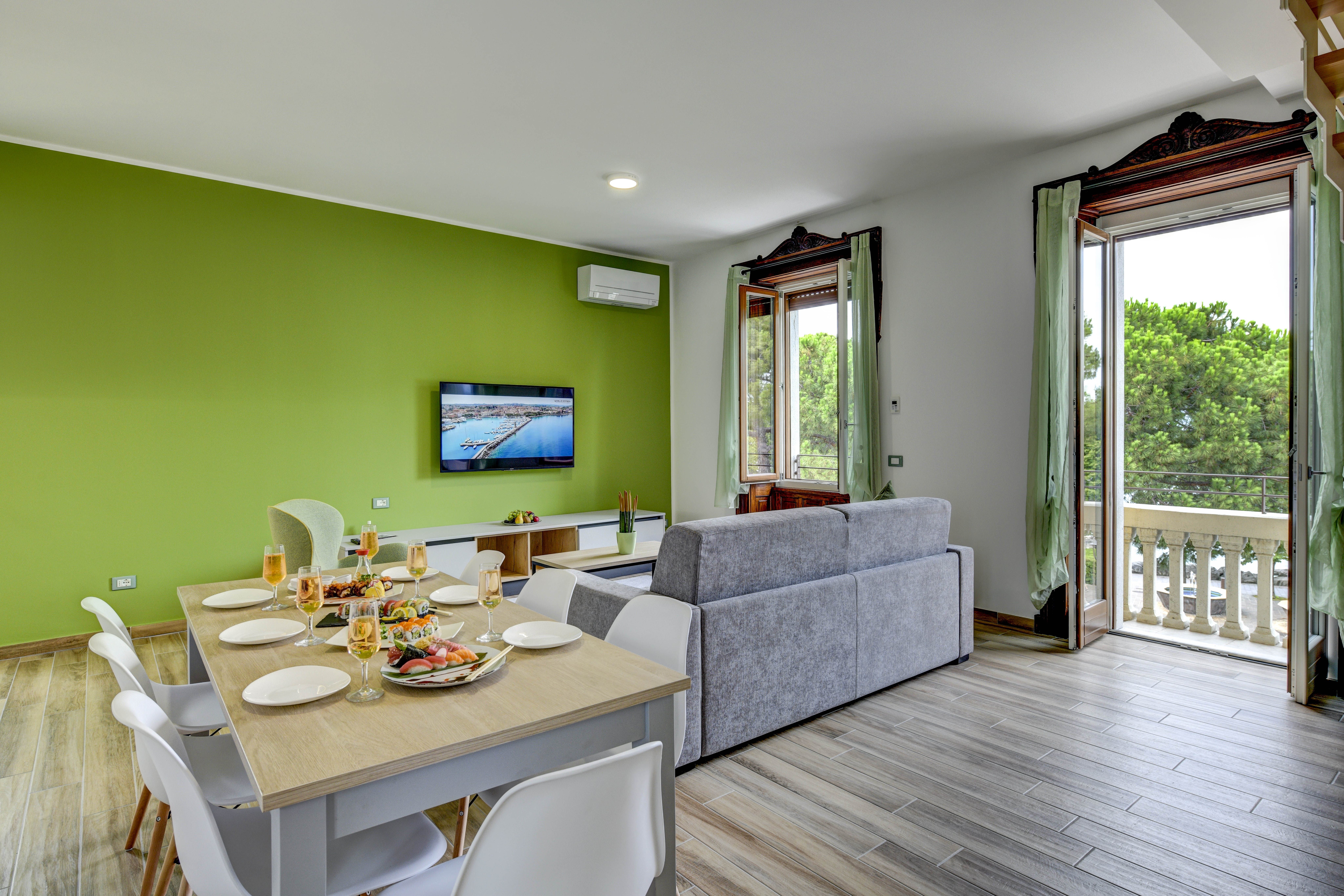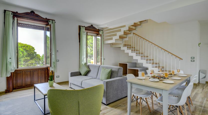 A stone's throw from Lake Garda lies this beautiful apartment, dipped in green. Spread over two floors, everyone will have the space to stretch their legs here. Lounge on the sofa in the open-plan living space while natural light fills the home, or set your laptop up at the dining table to get some work done. The building's rich history can be glimpsed in the wrought iron decor on the railings and the ornately carved windows. The traditional blends seamlessly with the modern, with the fully-equipped kitchen allowing you to whip up some fantastic home-cooked meals – when you're not out exploring the dining opportunities that Desenzano del Garda has to offer, that is.