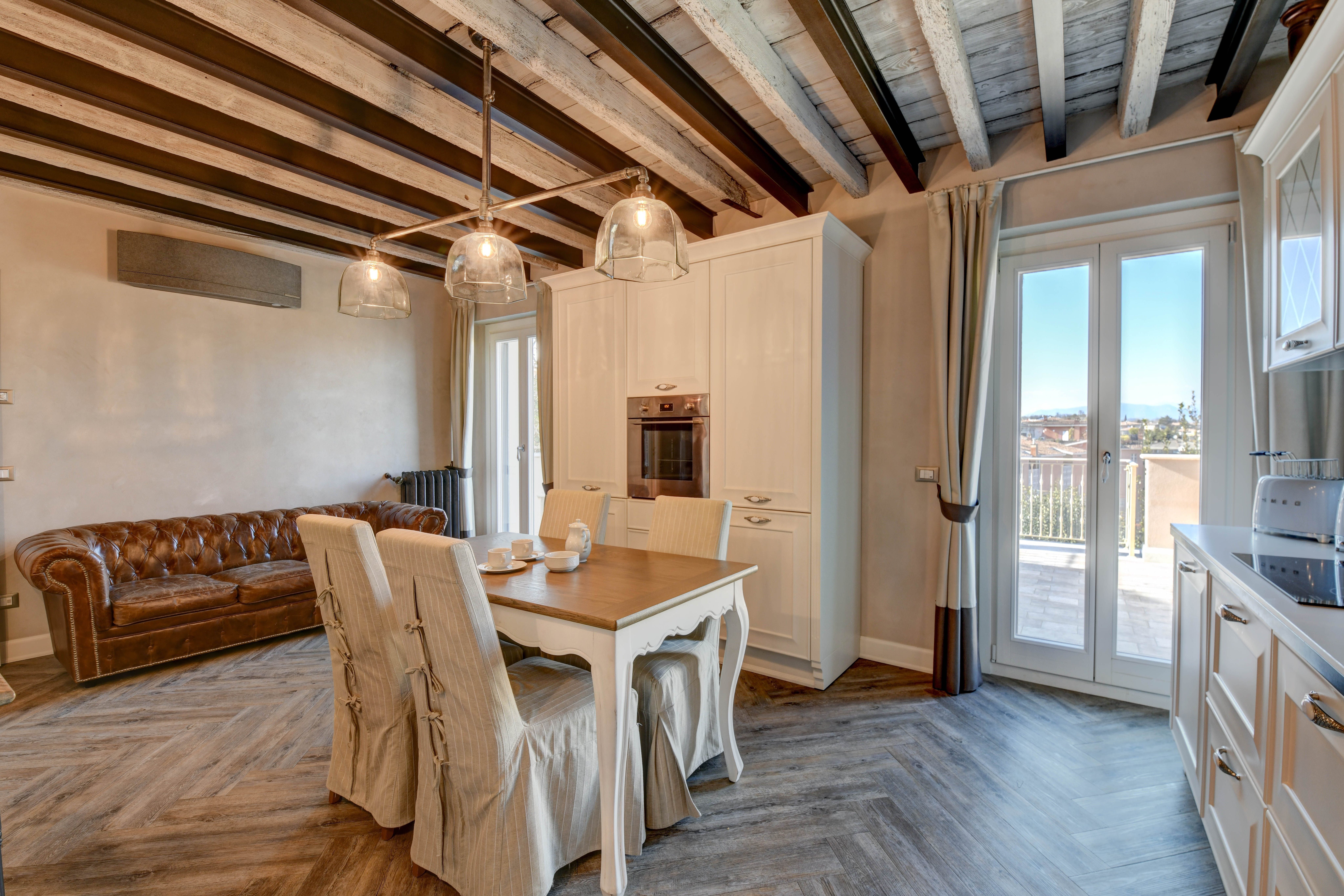 Leaning into a more vintage aesthetic, this home, minutes away from Lake Garda, creates a tasteful and understated space in which to unwind. Start every day by enjoying breakfast out on the balcony where you can admire the snow-capped mountains in the very distance. As you come back in through the kitchen, you may as well grab another cup of coffee to accompany a bit of light reading, curled up on the sofa in the bright living room.