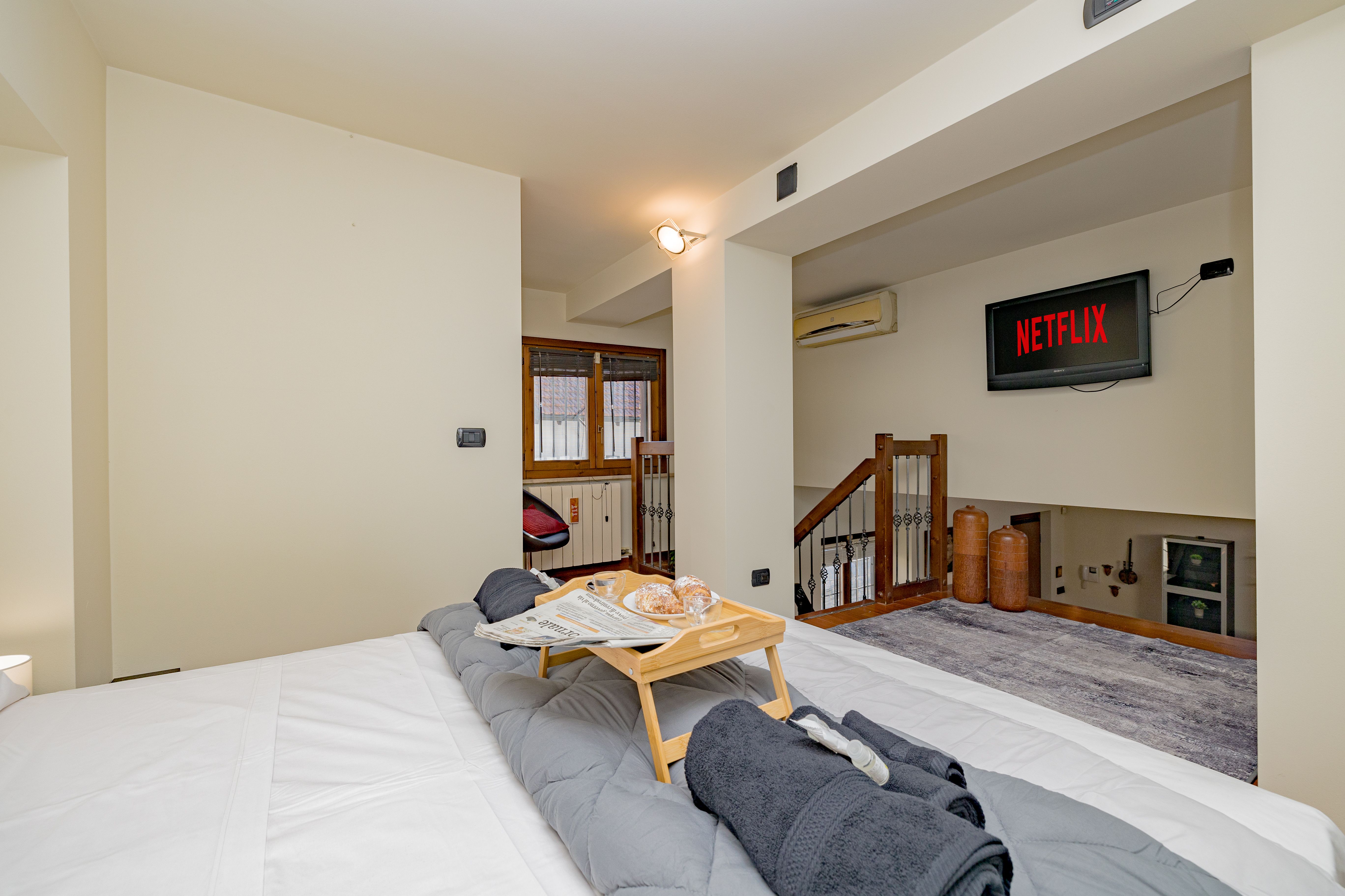 This characterful loft is just a thirty-five-minute train ride from the centre of Milan, offering the ideal base for exploring the city. The home blends comfort and style, with a private outdoor space, a jacuzzi, and a sunken seating area that's perfect for chilled evenings with a drink in hand. A full kitchen, bar space, generous storage, and free parking make longer stays a breeze. At full capacity, two guests will sleep on the downstairs sofa bed. The single bedroom is fully private, while the mezzanine double is semi-open to the living space below. Some areas, particularly the bathrooms, do feel a little dated. But with its generous layout, peaceful setting, and easy access to the city, this stay is full of appeal.