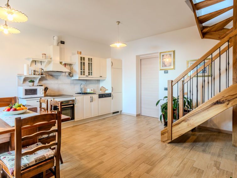 "Baita Mirtillo", 3-room house 85 m2 on 3 levels, south facing position. Comfortable and rustic furnishings: living/dining room with dining table, dining nook and TV. Exit to the garden. Open kitchen (oven, dishwasher, 4 induction hot plates, microwave, freezer, electric coffee machine).