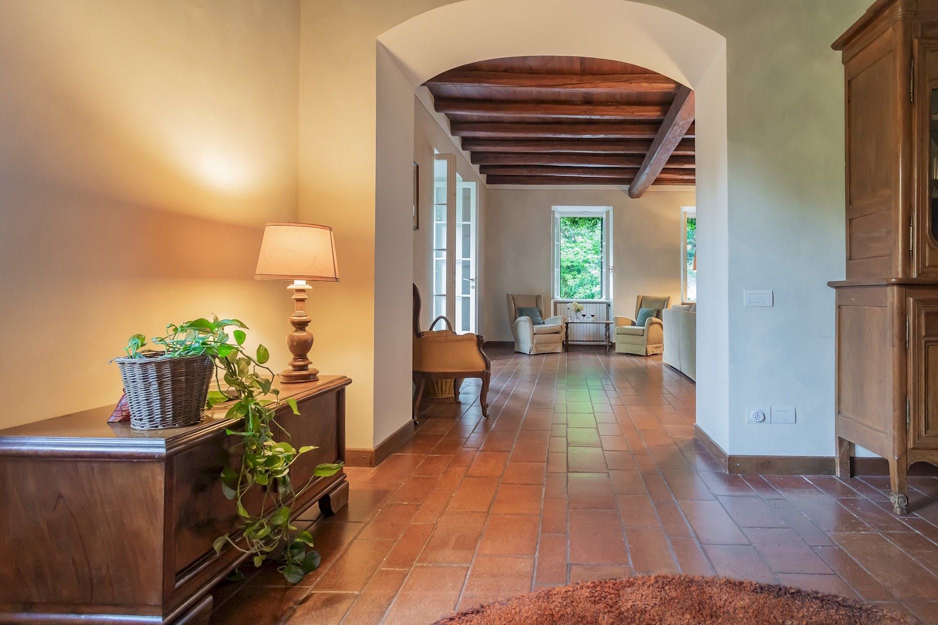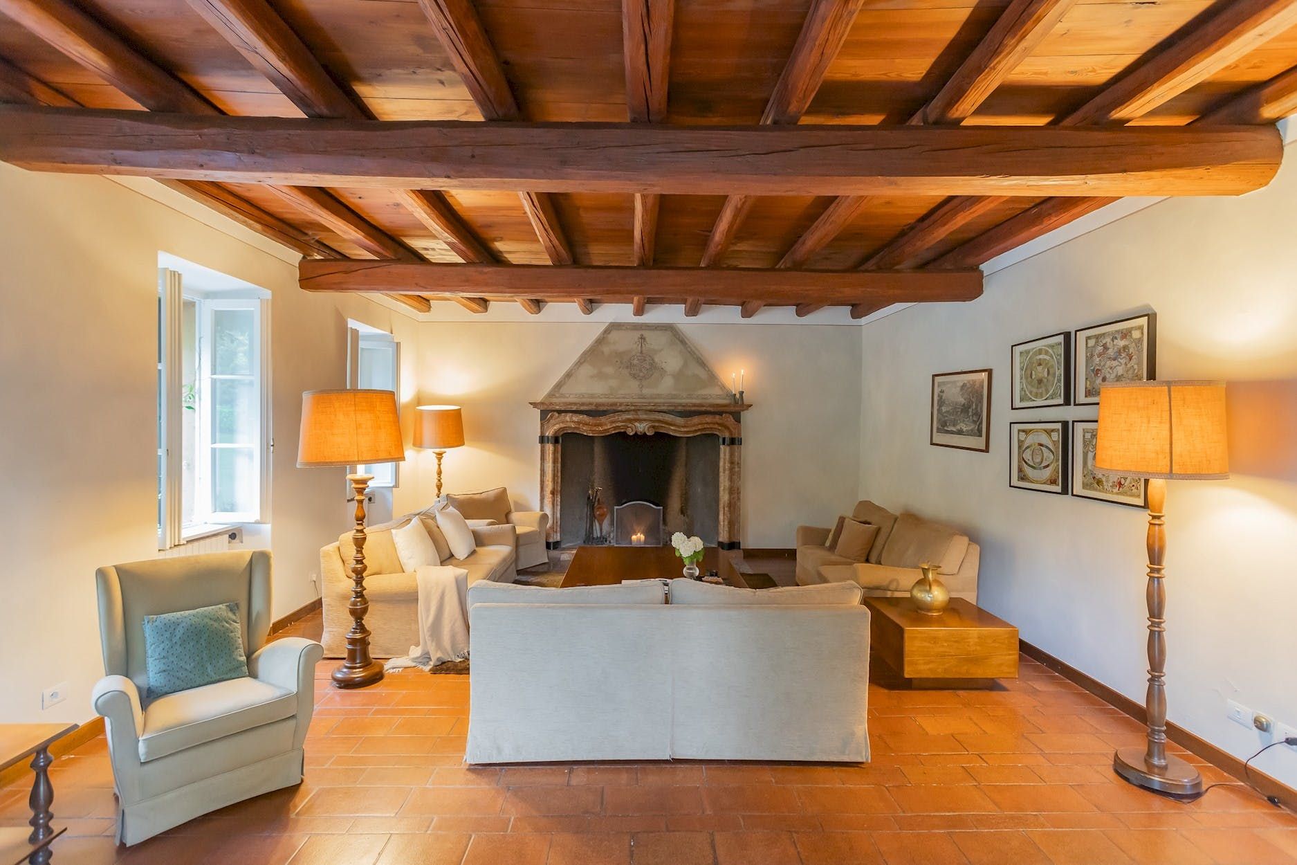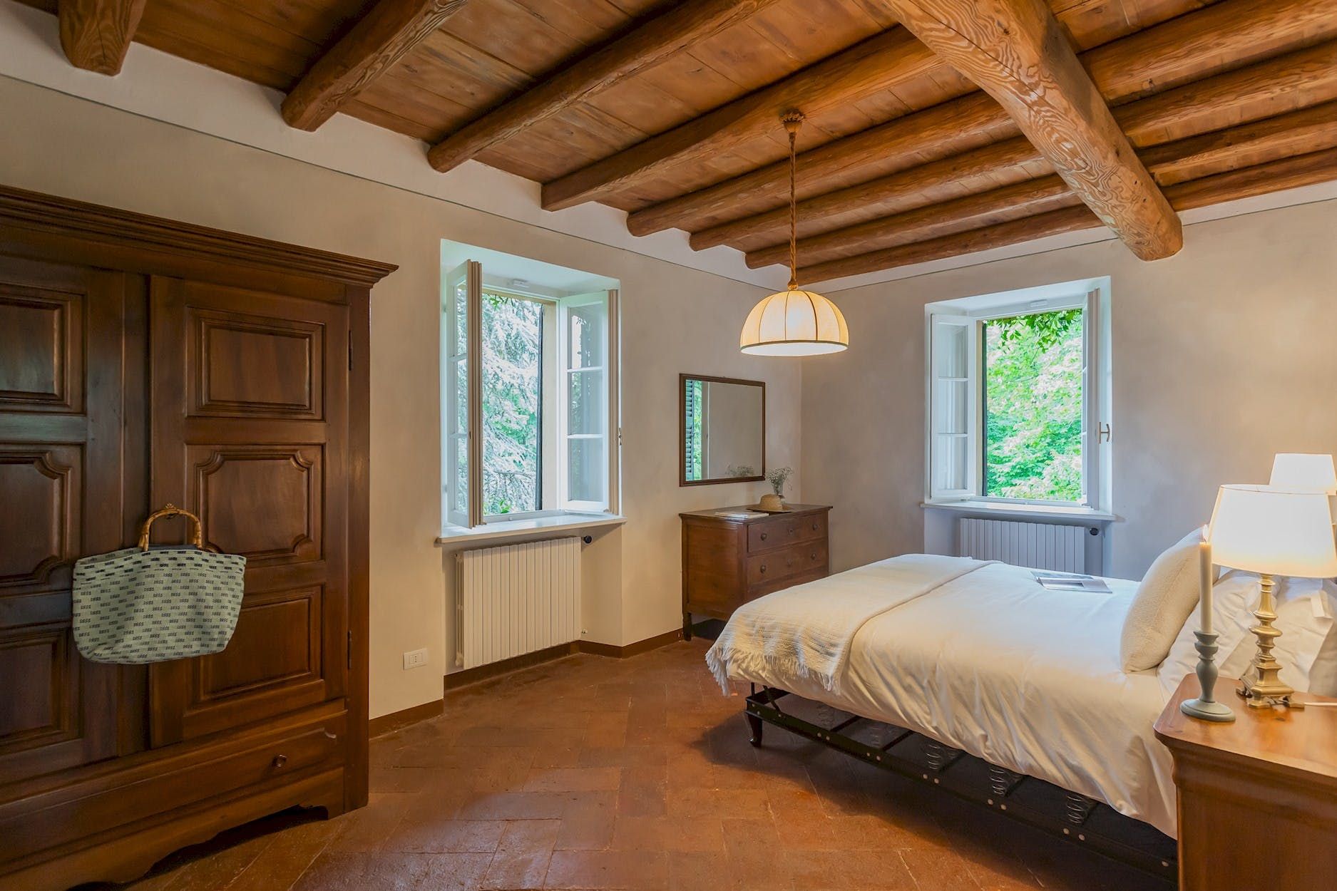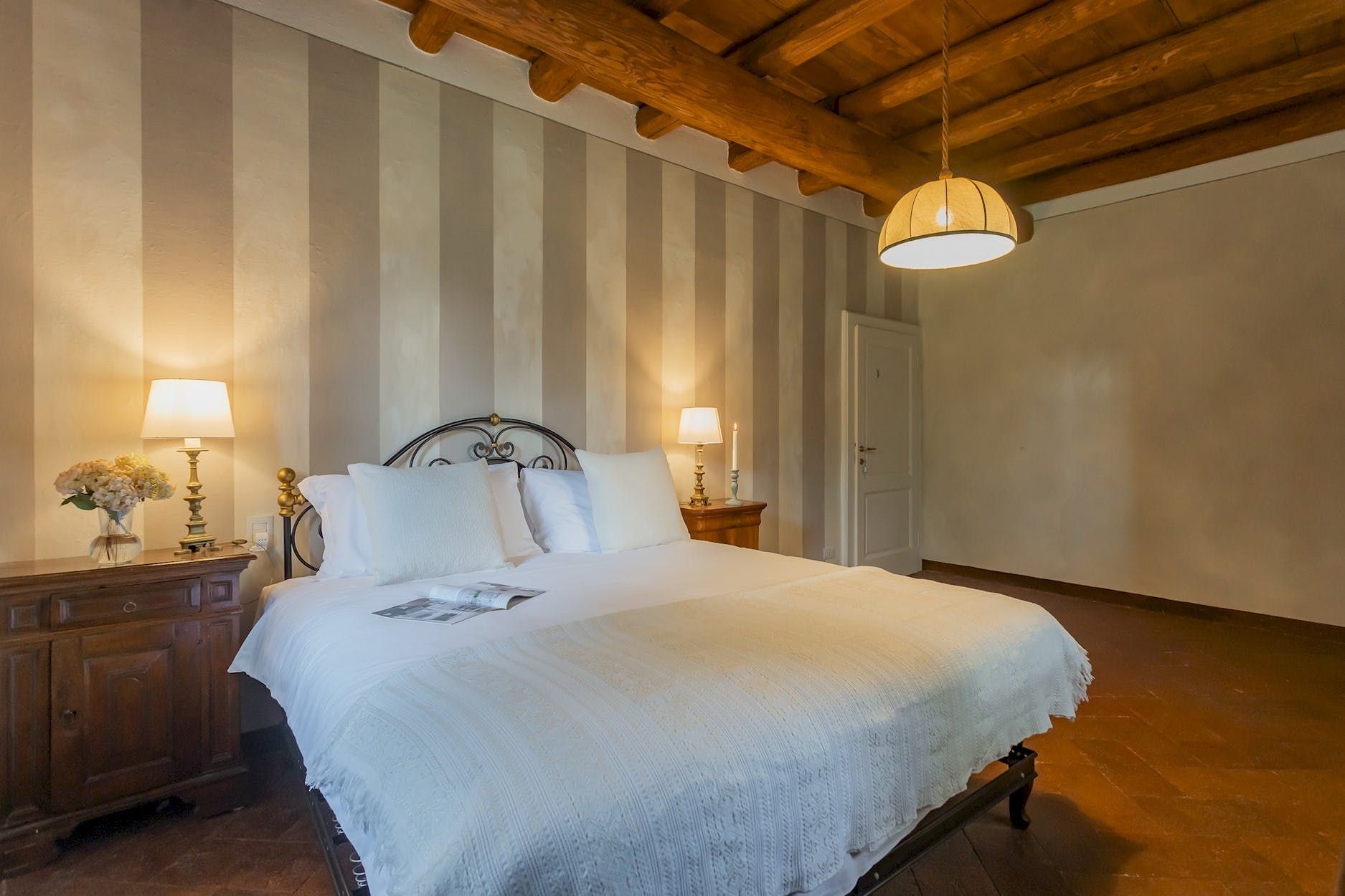 An ivy-covered front and typically green-shuttered windows greet you at the end of a long driveway. Inside, terracotta floors keep things cool underfoot and wooden ceilings are reminiscent of the old world. A huge stone fireplace crowns the main lounge, complete with the villa’s old family crest. There are plenty of seating nooks tucked away in this home to hide with a good book. Chefs will love the traditionally Italian kitchen, which has been upgraded from its farmhouse days with granite worktops, but you can still feels the bones of the old kitchen in the wood-topped hearth (now home to a microwave and working bread oven).