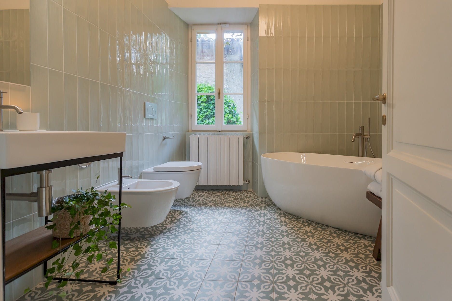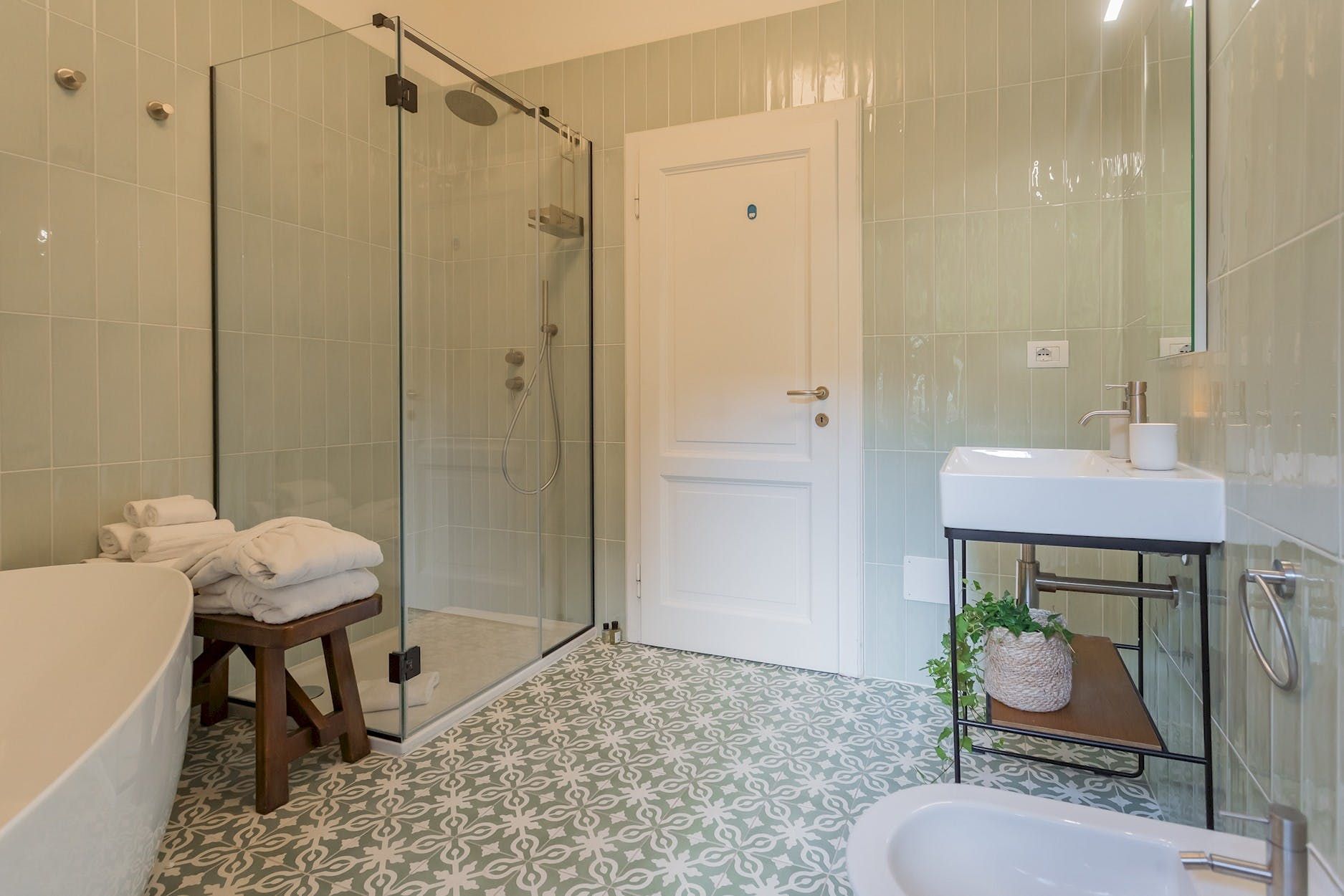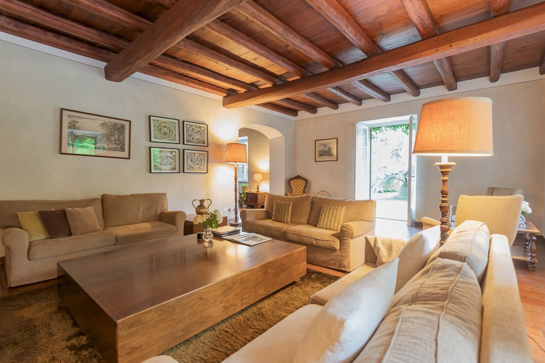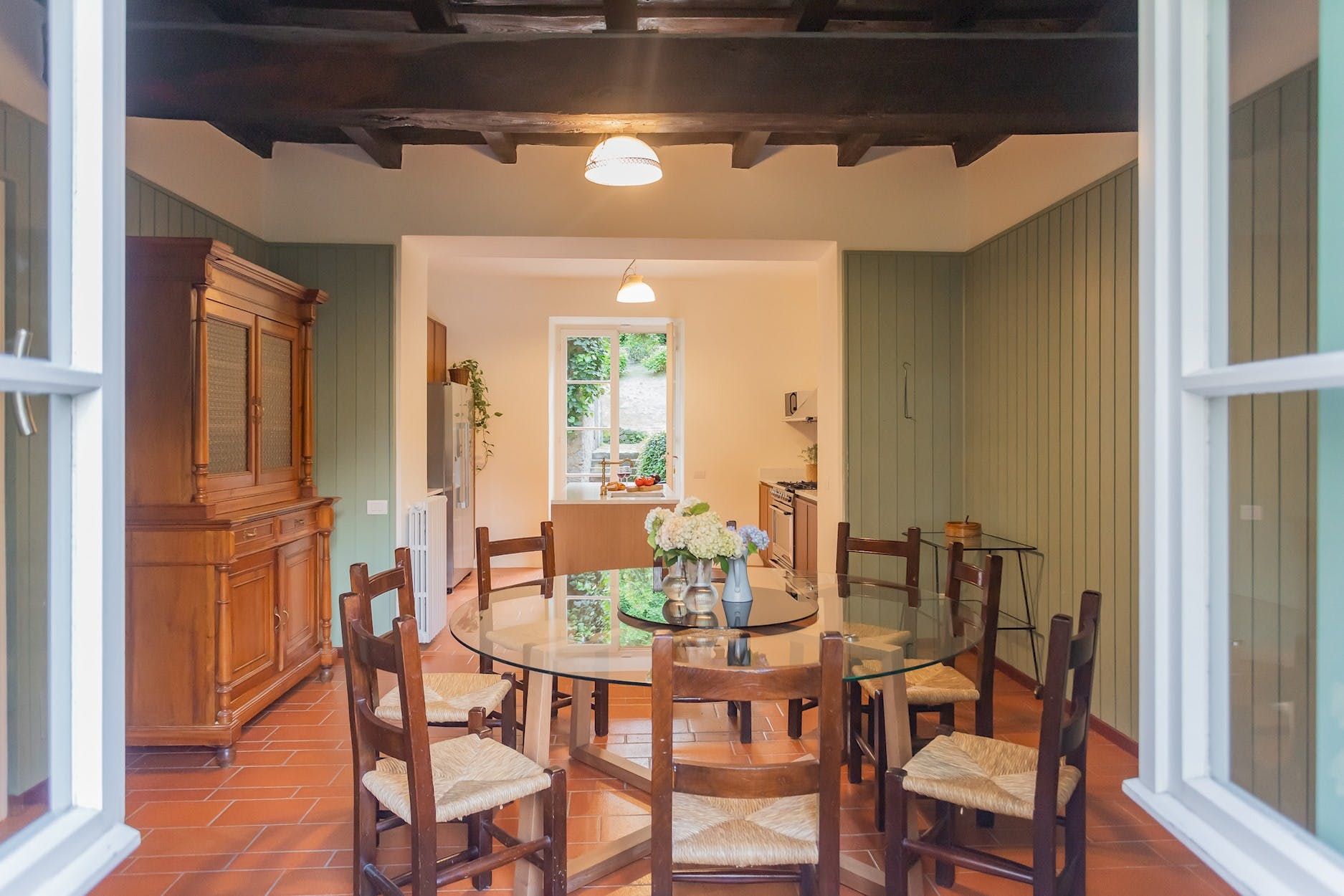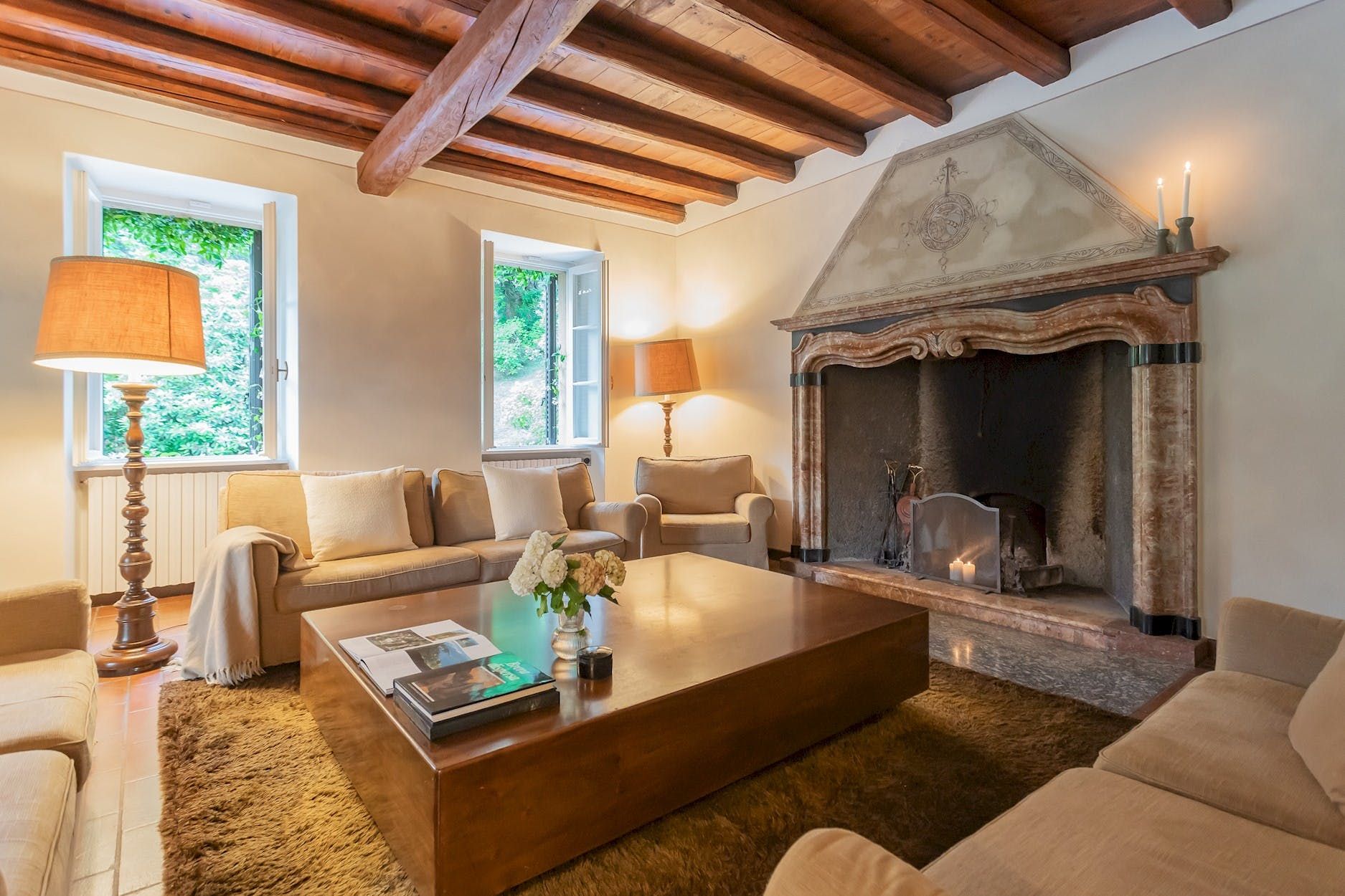 An ivy-covered front and typically green-shuttered windows greet you at the end of a long driveway. Inside, terracotta floors keep things cool underfoot and wooden ceilings are reminiscent of the old world. A huge stone fireplace crowns the main lounge, complete with the villa’s old family crest. There are plenty of seating nooks tucked away in this home to hide with a good book. Chefs will love the traditionally Italian kitchen, which has been upgraded from its farmhouse days with granite worktops, but you can still feels the bones of the old kitchen in the wood-topped hearth (now home to a microwave and working bread oven).