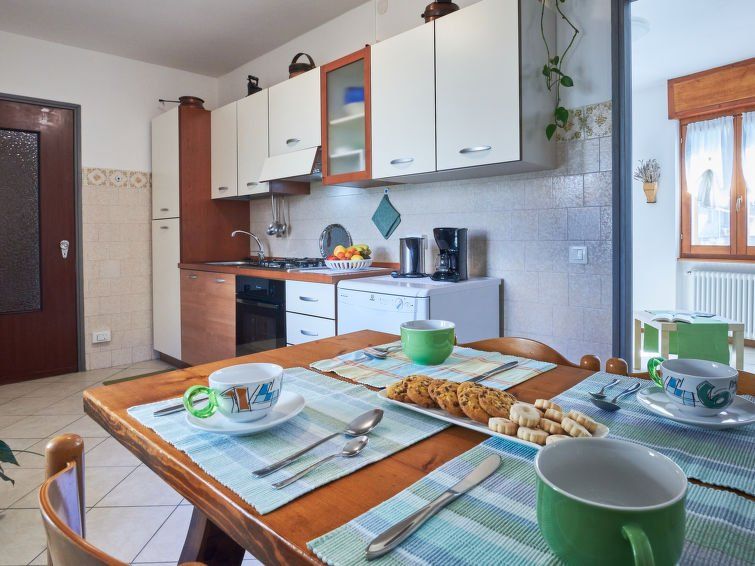 "Livo (GRV556)", 3-room apartment 62 m2, on the upper ground floor, east facing position. Bright, practical furnishings: living/sleeping room with 1 sofabed, 1 pull-out bed and satellite TV. 1 room with 1 french bed (160 cm). 1 room with 1 x 2 bunk beds. Kitchen (oven, dishwasher, 4 gas rings, toaster, kettle, microwave, freezer, electric coffee machine) with dining table.