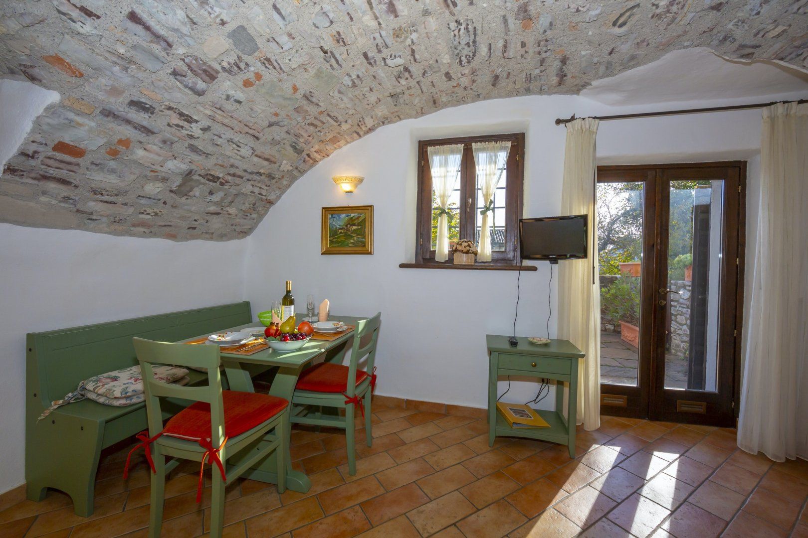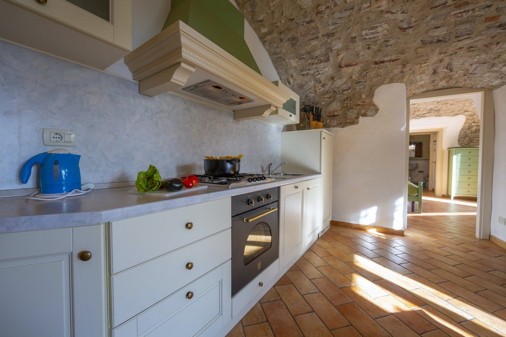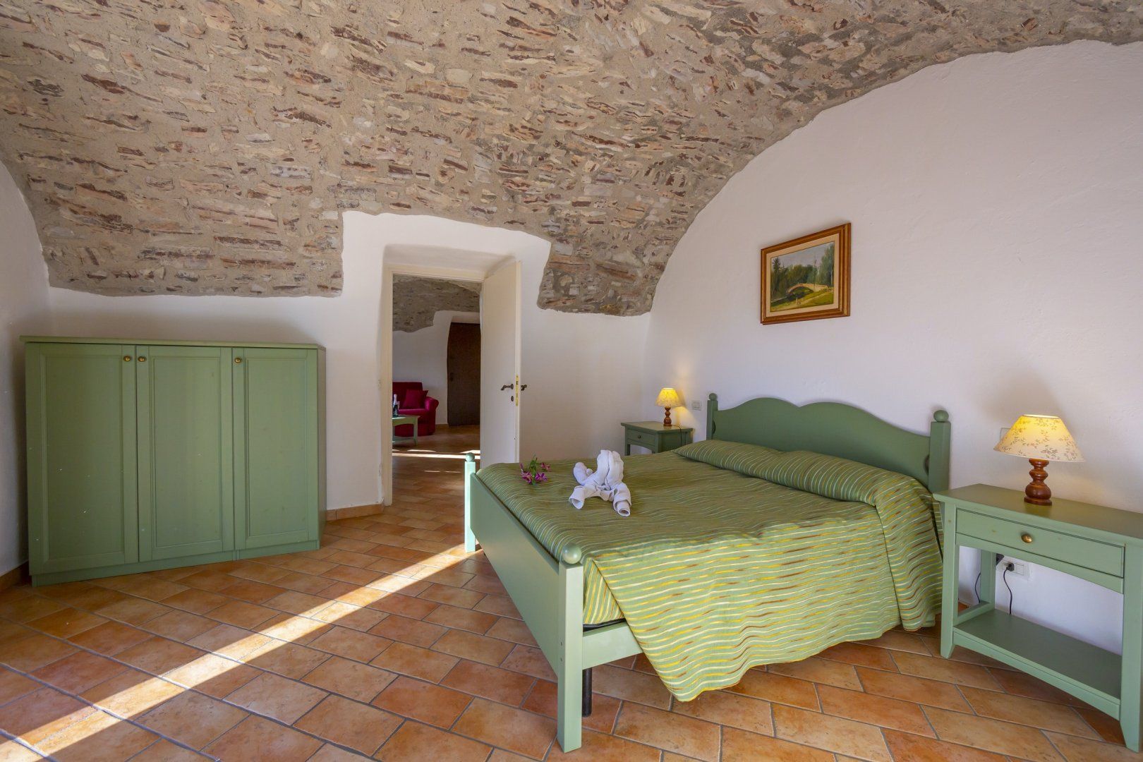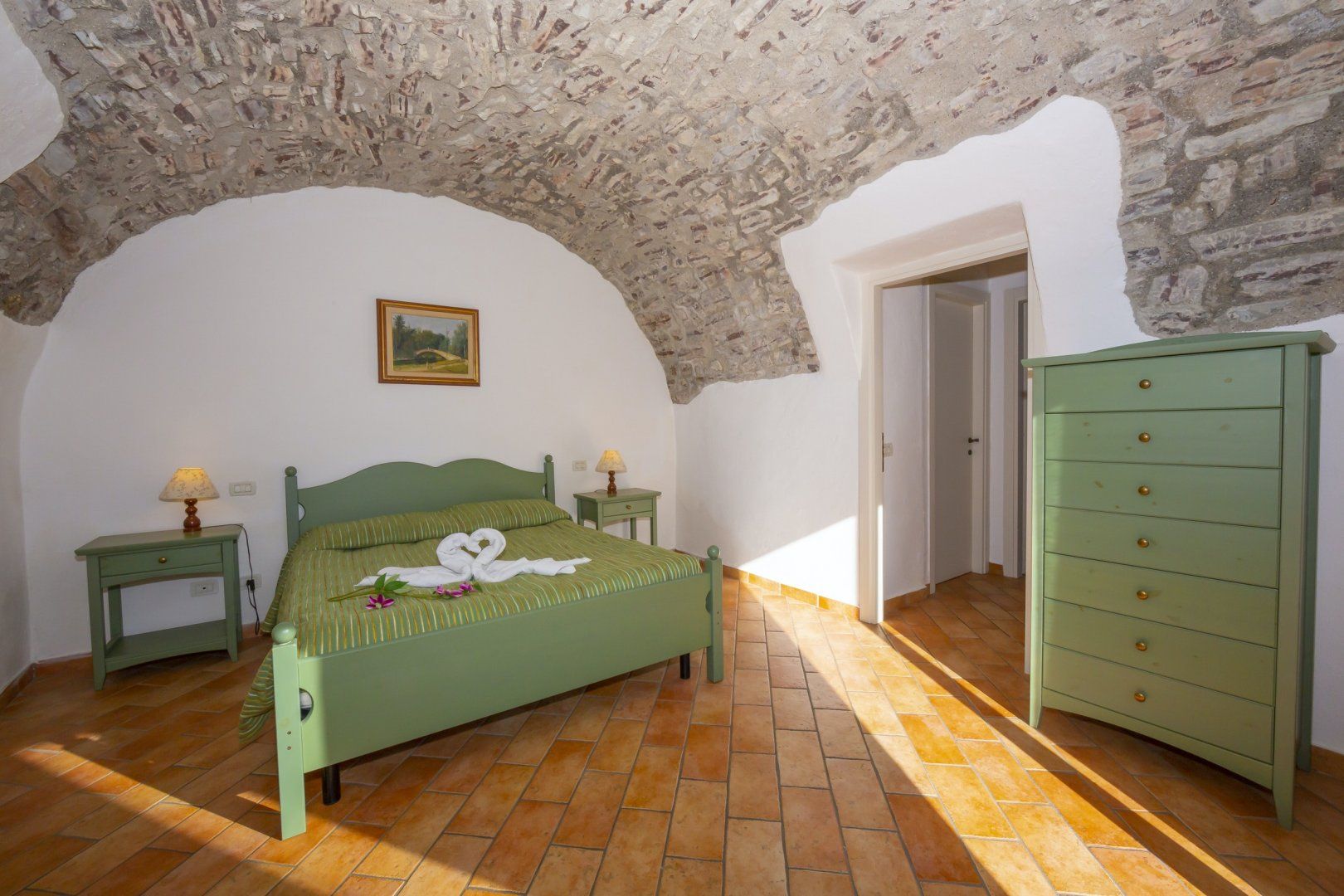 Inside, the characterful home has been traditionally decorated with red and green accents (all we can see is the Italian flag!) letting the striking exposed stone ceiling do the talking. In the homely bedroom, double doors lead directly onto the terrace, so you can wake up and immediately step out into the morning sun.