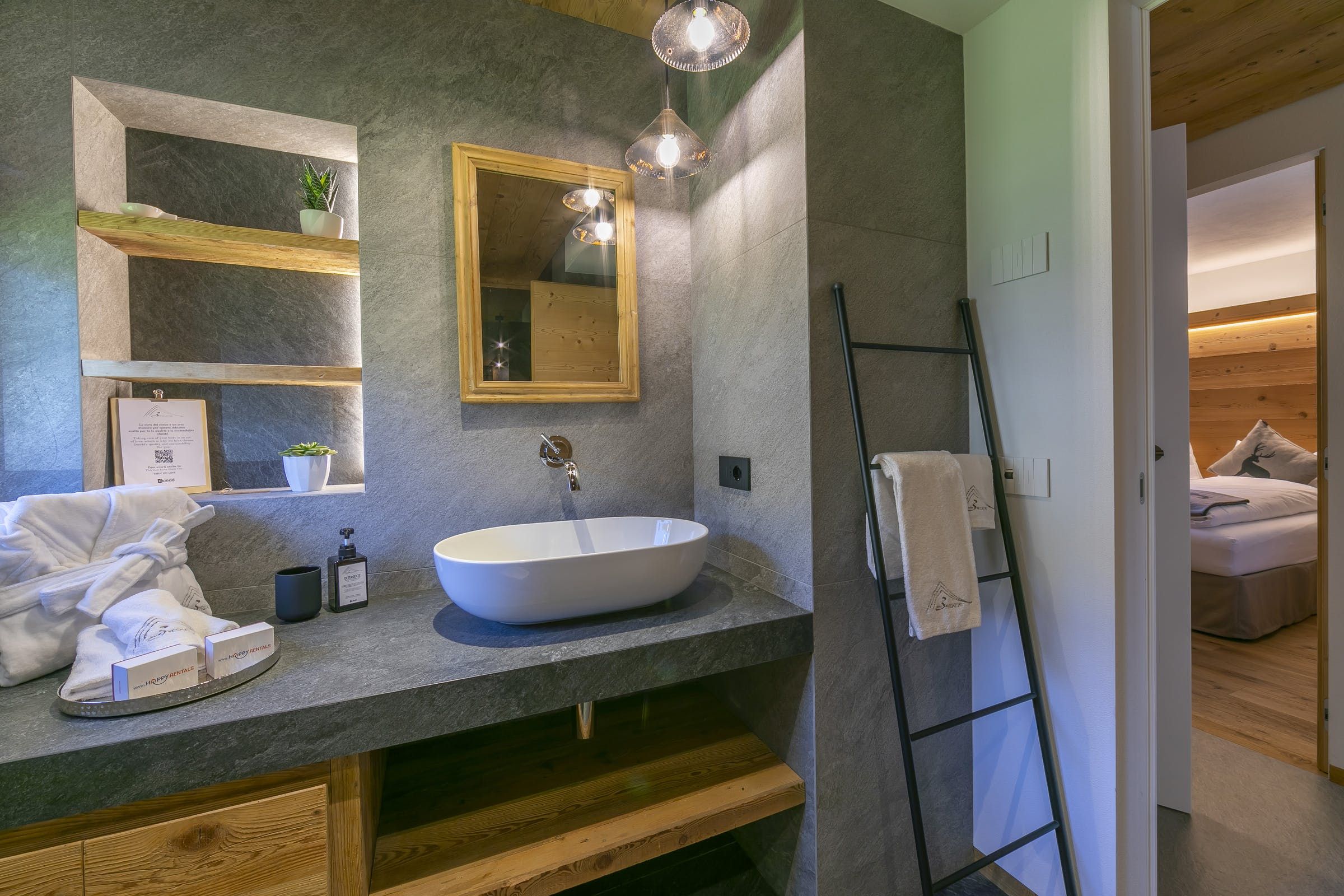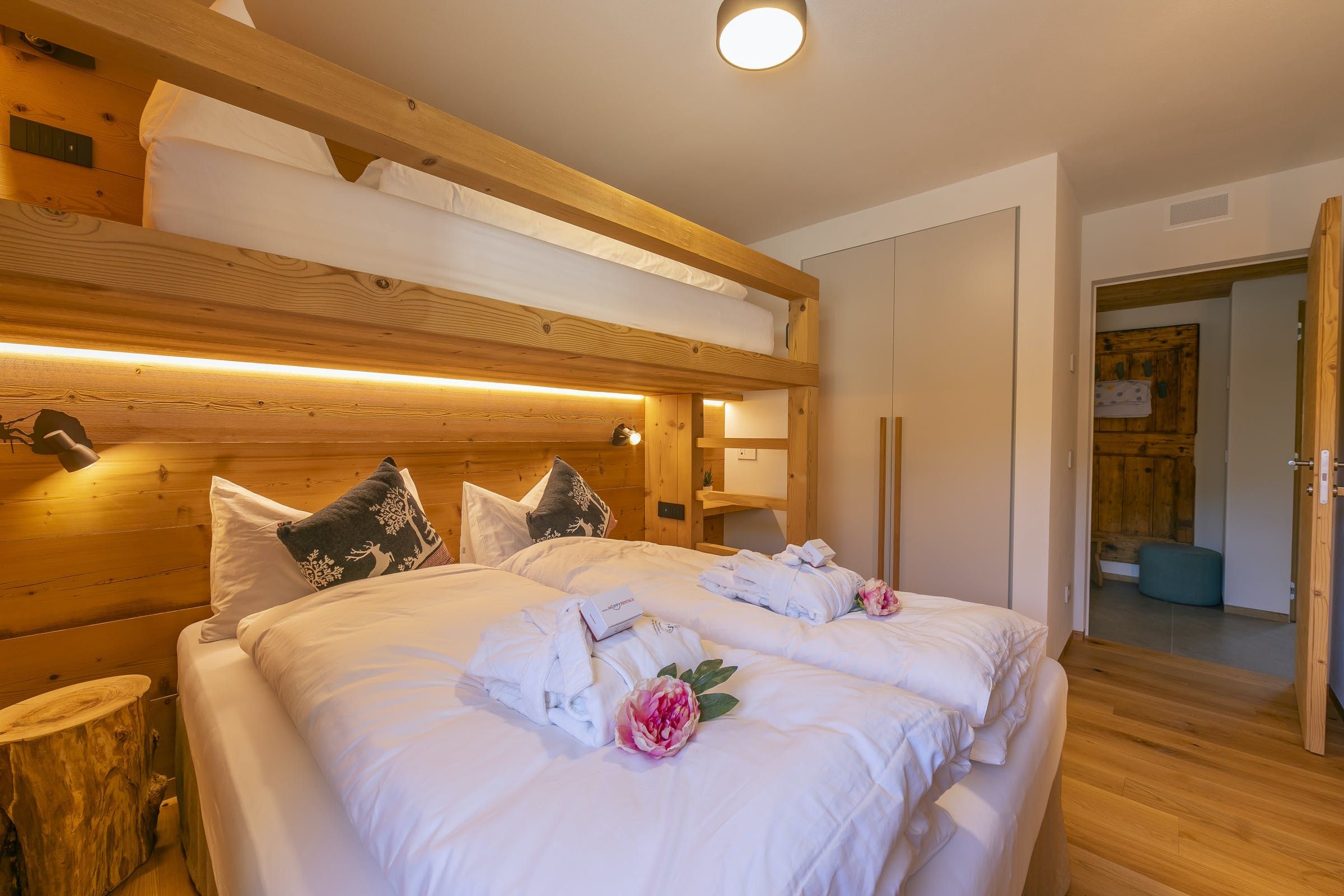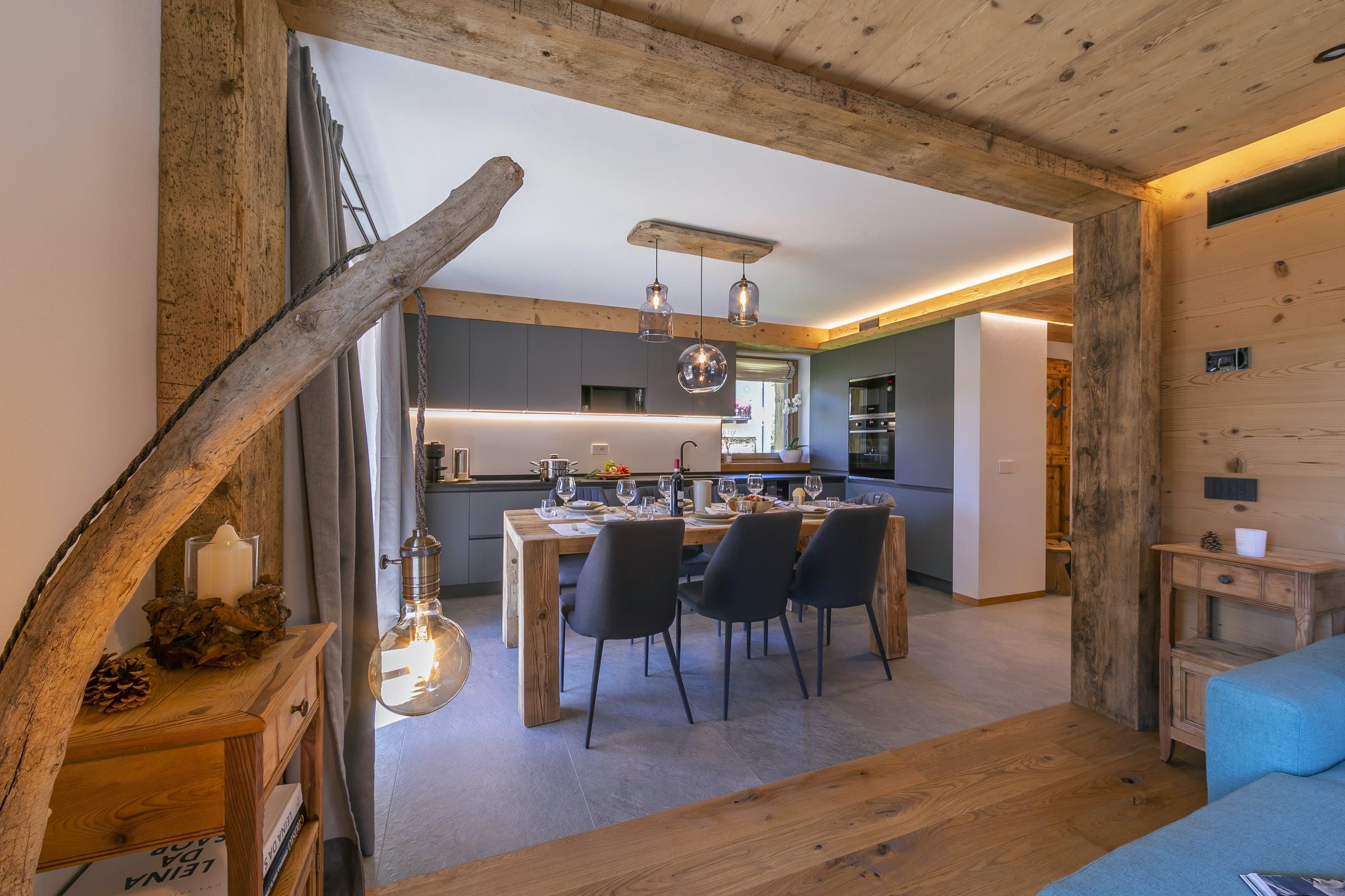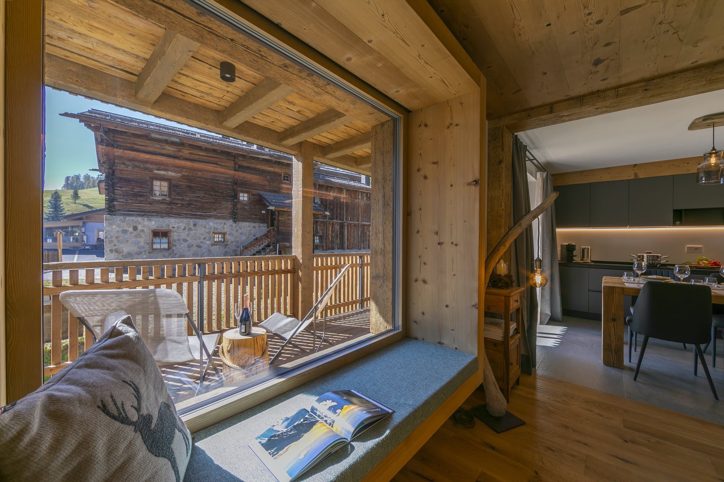 This home offers a cosy, yet classy vibe for you to stay in while enjoying the balcony with views for days over the mountainous greenery, or even snowy mountains, ready for gliding down on your set of skis during the winter. Sit on the bay window cushions with your morning bowl of delight and watch the world go by at a much slower pace than the city hustle and bustle. We love how this home emphasises wood throughout for a true lodge feel, but with a modern twist.
