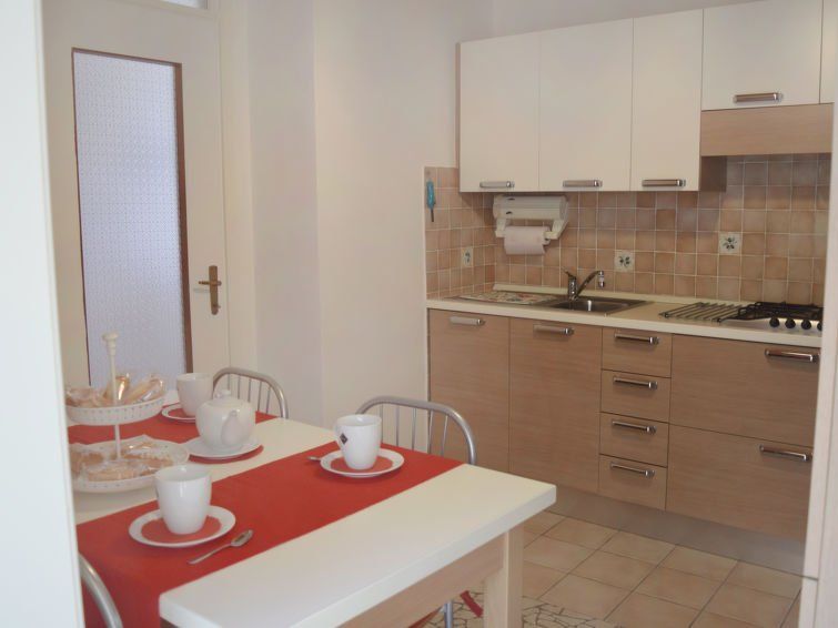 2-room apartment 50 m2 on 2nd floor. Tasteful furnishings: living/dining room with 1 double sofabed and satellite TV. 1 double bedroom. Kitchen (4 hot plates, oven, dishwasher, microwave, freezer, electric coffee machine). Exit to the patio. Shower/bidet/WC. Gas heating. Heating available only from 15.