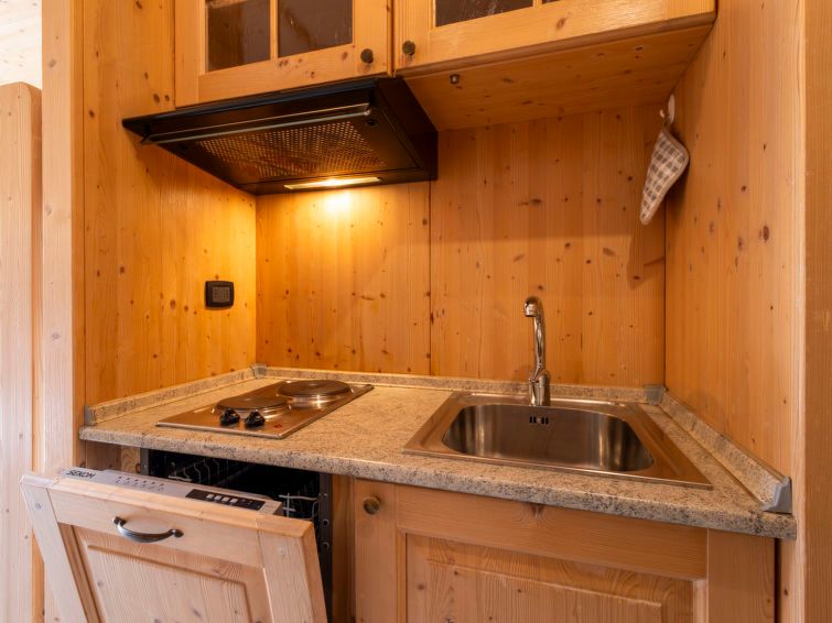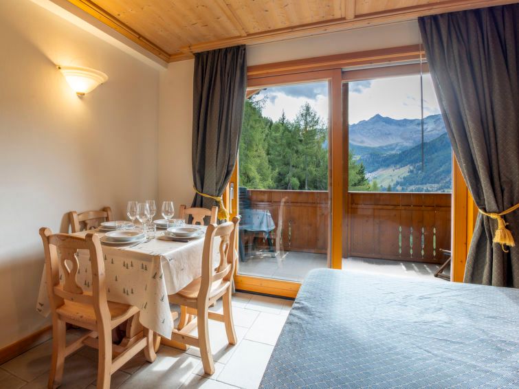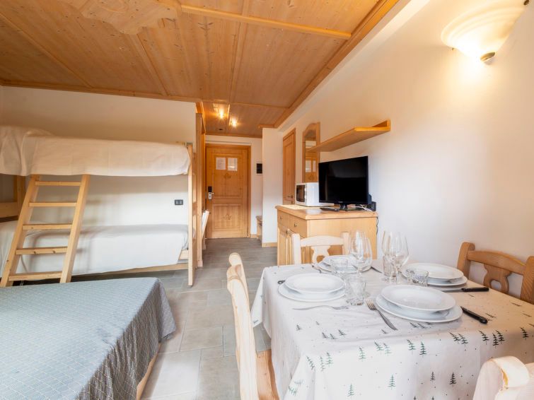 1-room apartment 30 m2 on 1st floor, south facing position. Bright, comfortable furnishings: living/dining room with panoramic window with 1 x 2 bunk beds, 1 double bed, dining table and TV. Exit to the terrace. Small kitchenette (2 hot plates, dishwasher, toaster, kettle, microwave, freezer, electric coffee machine, Capsules for coffee machine (Nespresso) free).