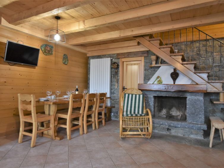 4-room chalet 65 m2 on 2 levels, south facing position. Partly with sloping ceilings, comfortable and wooden furniture furnishings: large living/dining room with open-hearth fireplace (only for decoration), dining table, TV and wood-burning stove. Exit to the garden. Large kitchenette (dishwasher, 4 gas rings, toaster, kettle, microwave, electric coffee machine, Capsules for coffee machine (Nespresso)).