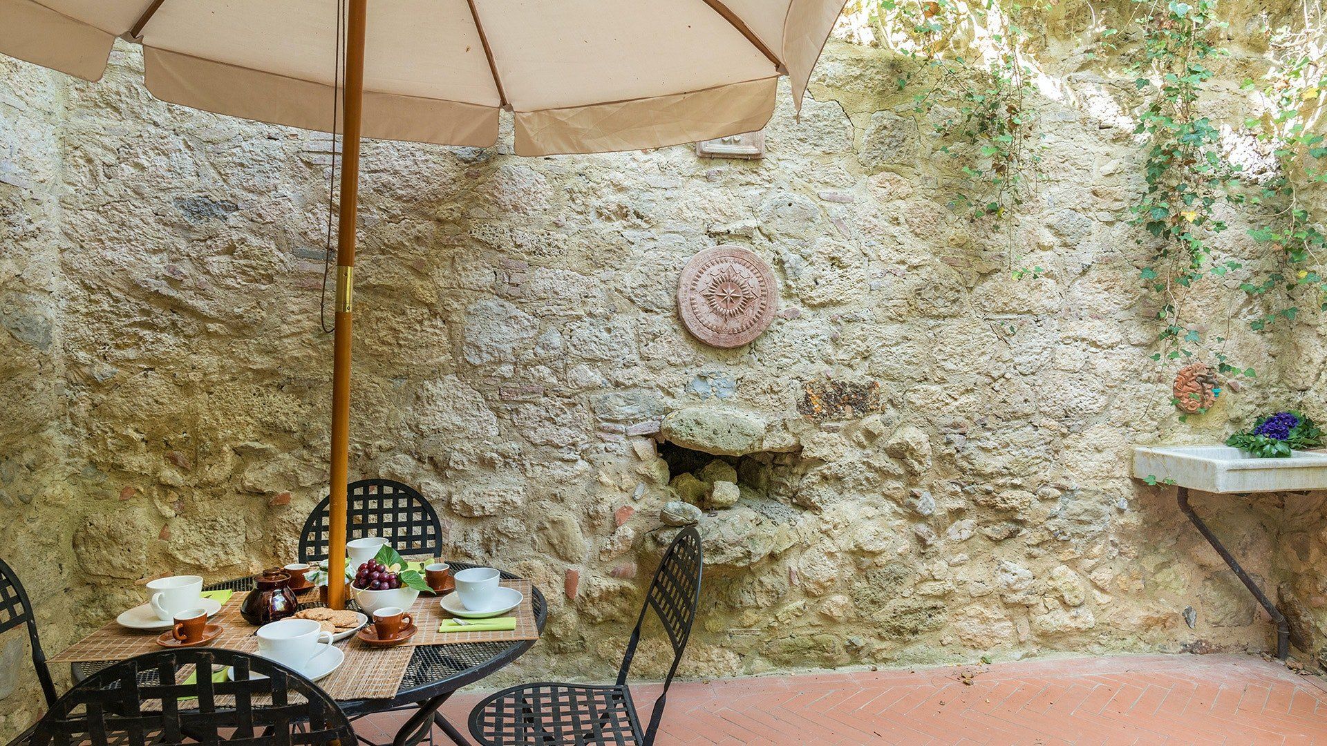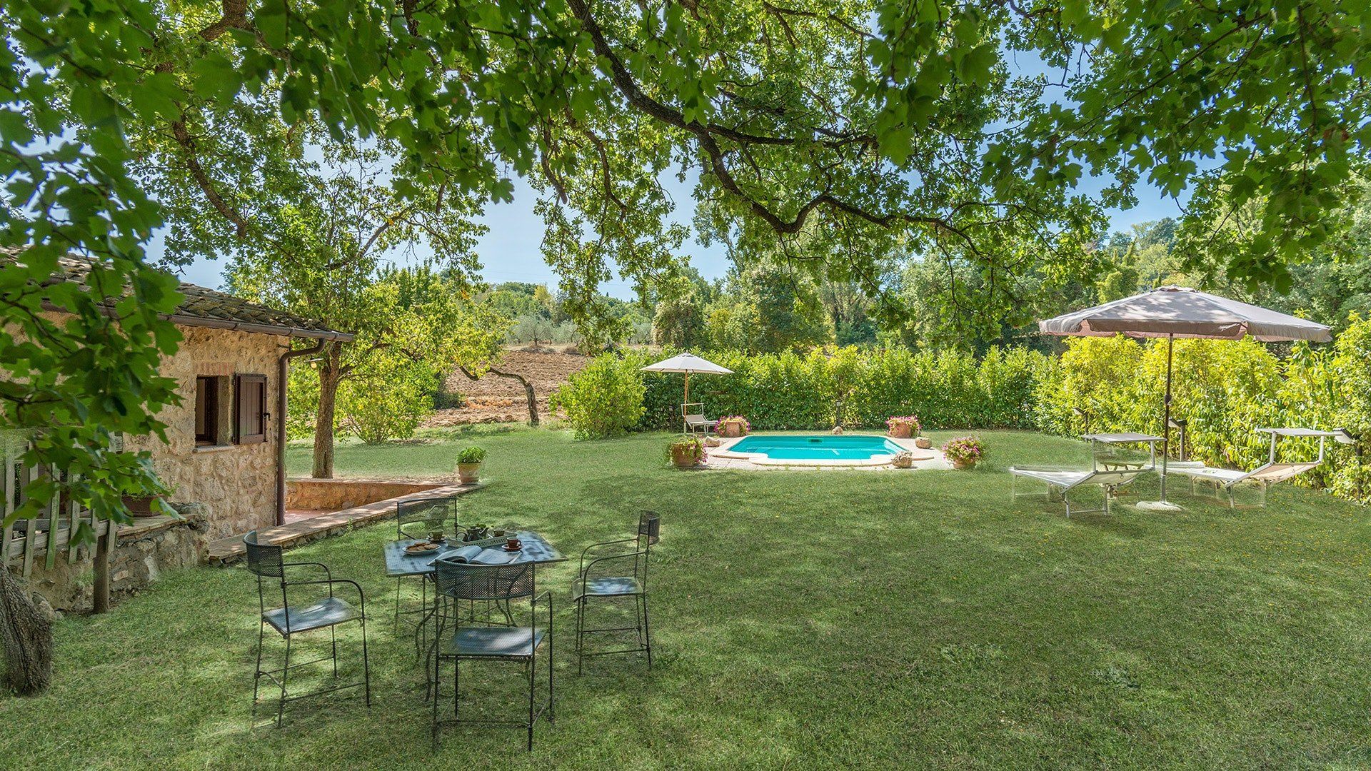 Located just outside Cetona in Tuscany, this picturesque home is the perfect place to find peace and tranquility amidst the region’s renowned rolling hills and forests. A renovated stone mill, its romance is clear the moment you step inside. From its beamed ceilings, traditional kitchen and bright study that leads out in the garden, this compact but comfortable villa feels like an intimate country hideaway made for the sole purpose of your relaxation. And then there’s the bedroom with its forest palette, green gothic headboard and access to the terrace. Wake up and head outside for your morning coffee under a shady oak tree, then while away the hours in the pool or discover the babbling brook just beyond the home’s canopy of trees. The medieval town of Cetona with its sandy-hued piazza and palazzo is also just five minutes away by car. After a day luxuriating by the pool or exploring the nearby sights, come back home for a glass of wine in the stone courtyard before enjoying an intimate meal beneath the stars.