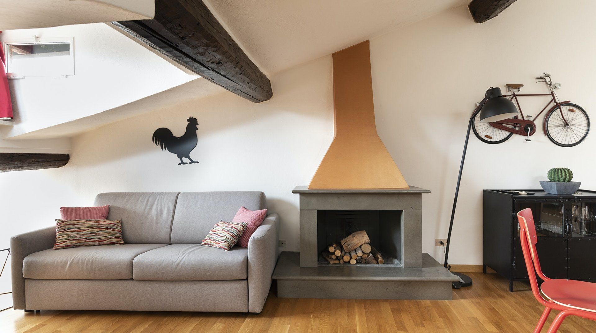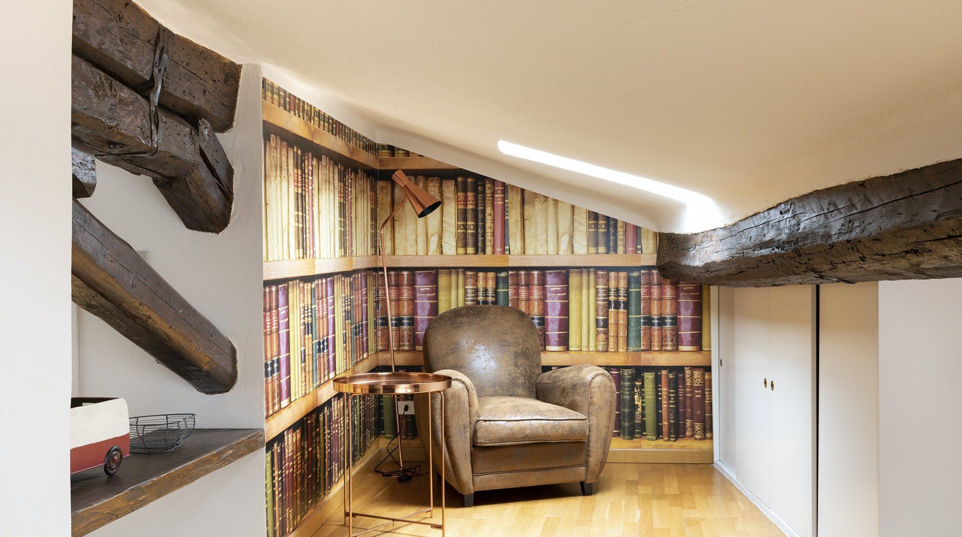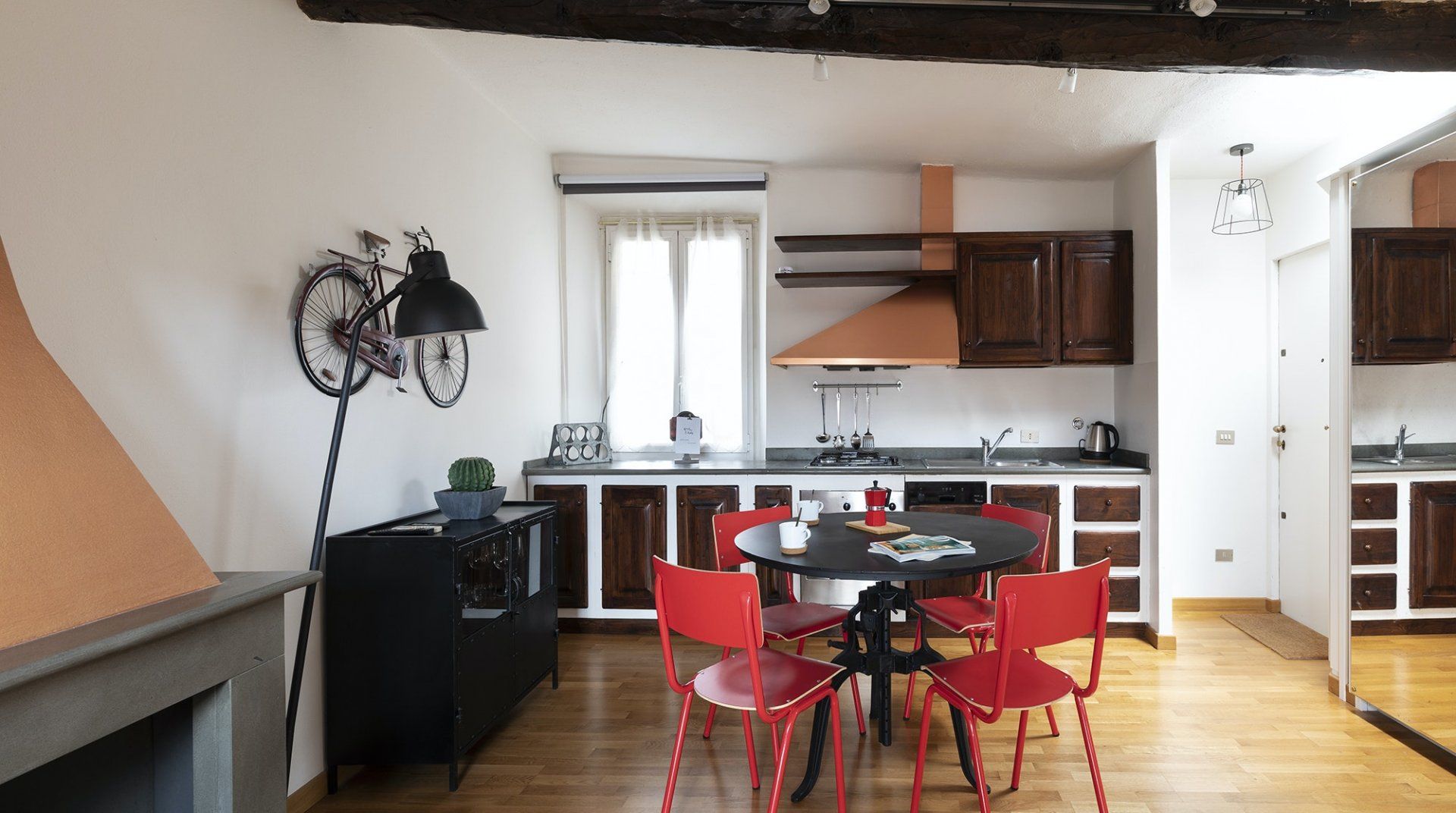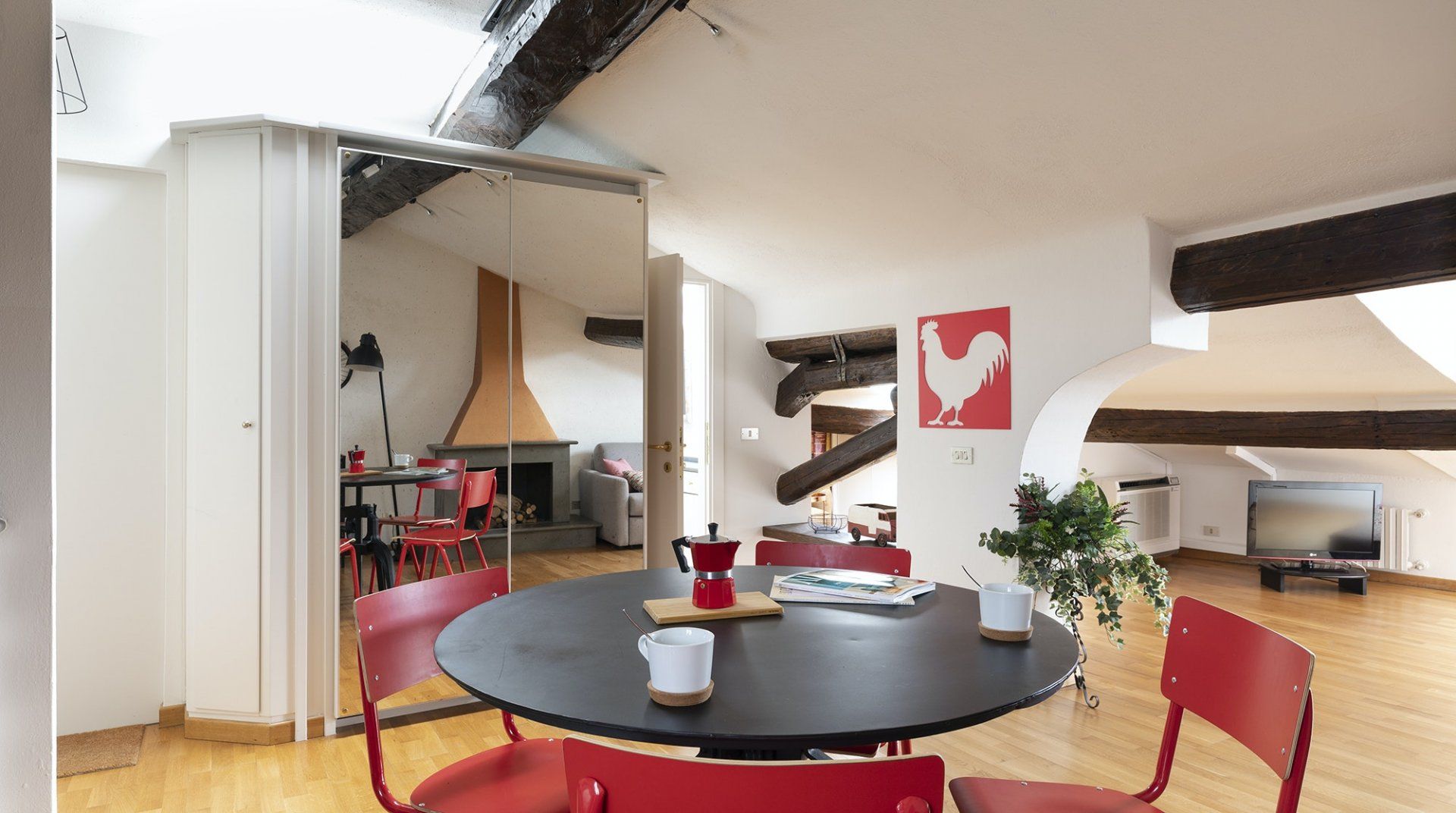 You’ll be surrounded by chic shopping streets in the middle of Brera, just two minutes down the street from the beautiful art gallery Pinacoteca di Brera. You can easily walk to the Duomo di Milano, just fourteen minutes away, or take the twelve-minute saunter to sprawling Parco Sempione. Back at home, you’ll be neatly tucked under the eaves, with characterful exposed wooden beams and bright skylights. The open-plan living area makes the most of the small space, and it’s filled to the brim with charm – the wood kitchen, ornamental fireplace and pops of red that adorn the walls and furniture. The playful library wallpaper and armchair make a good nook for reading, while the bedroom is especially inviting after a long day of exploring on your feet. Sink into the comfortable sheets, and sleep well to recharge for tomorrow.