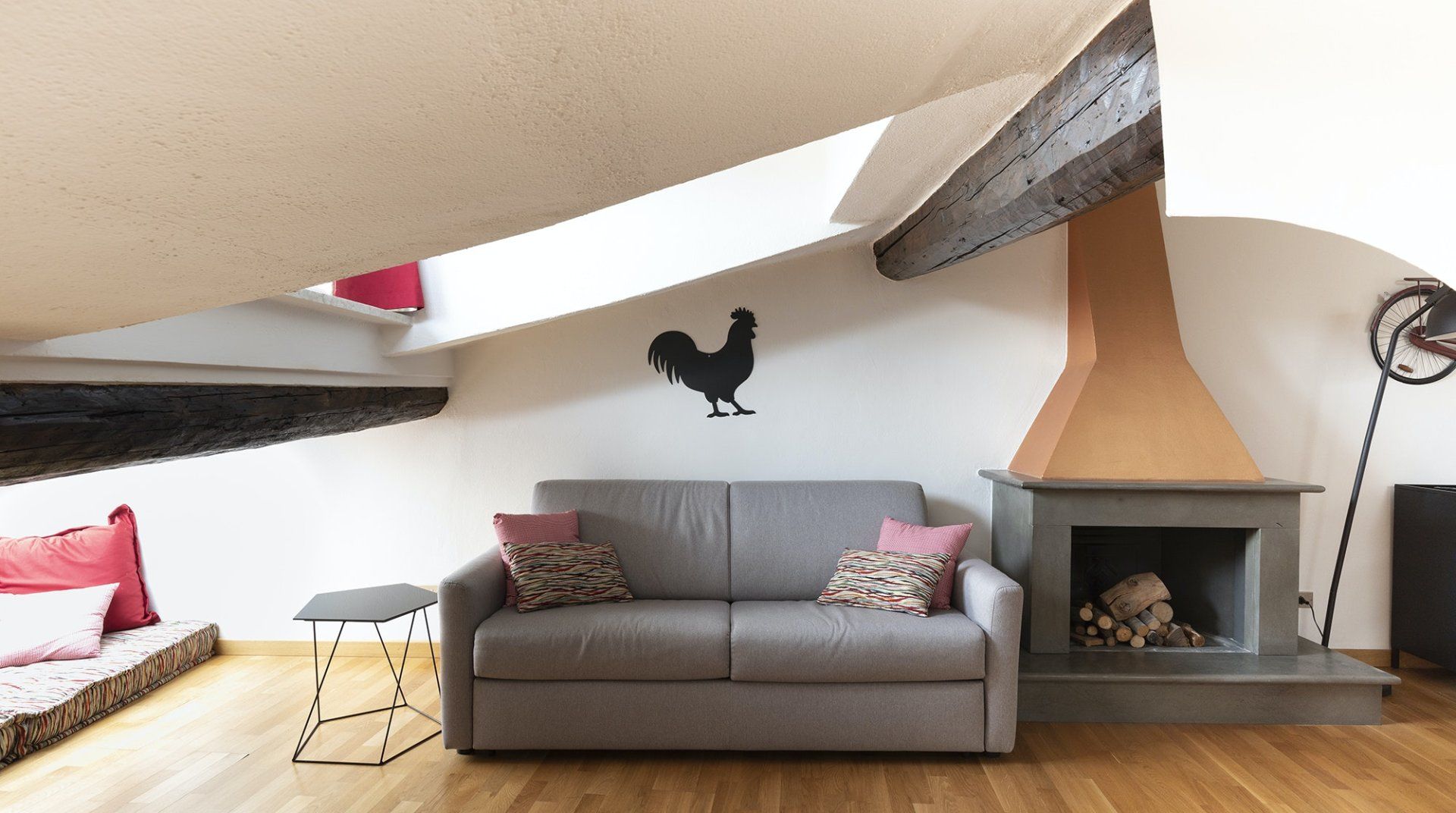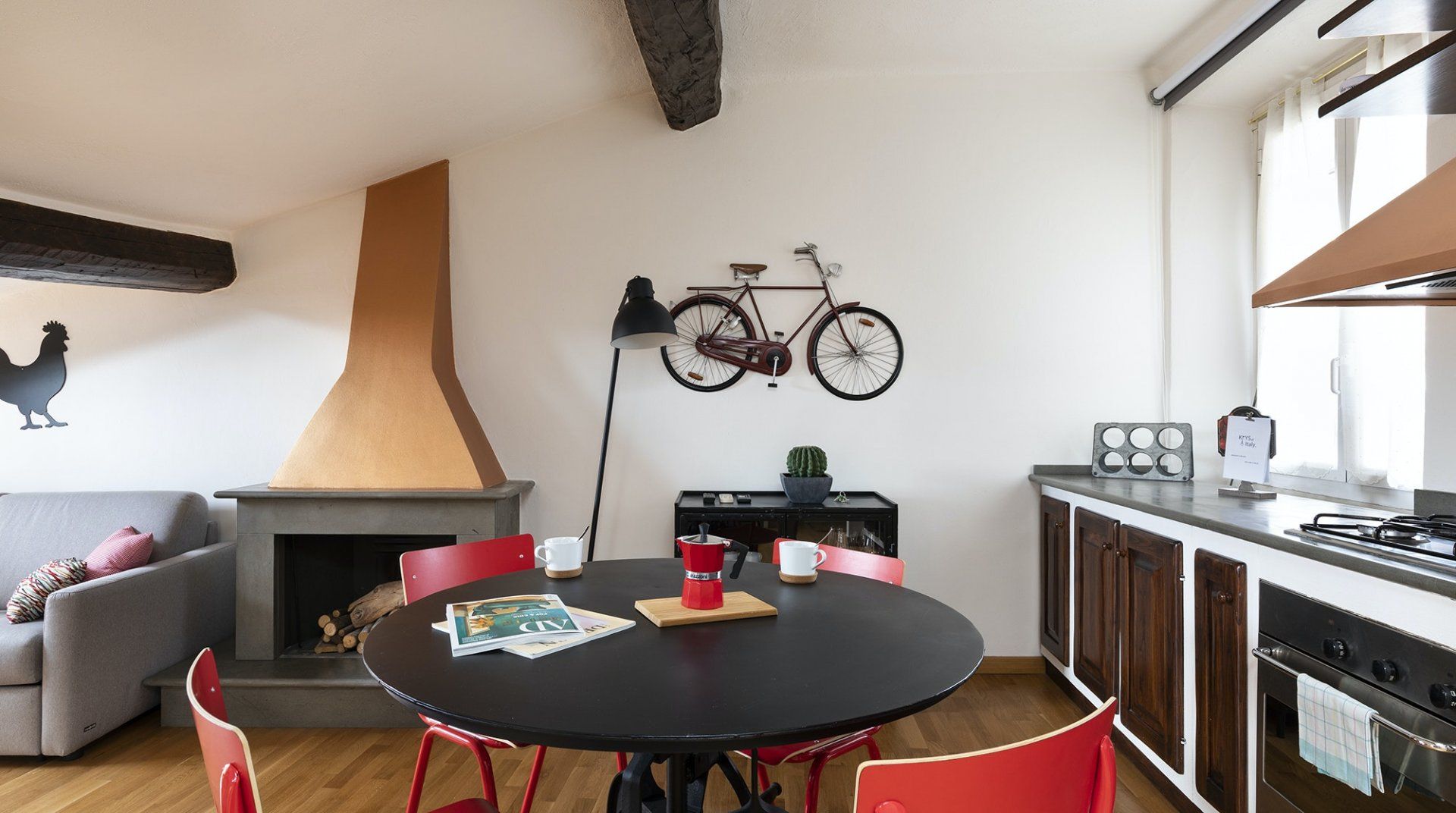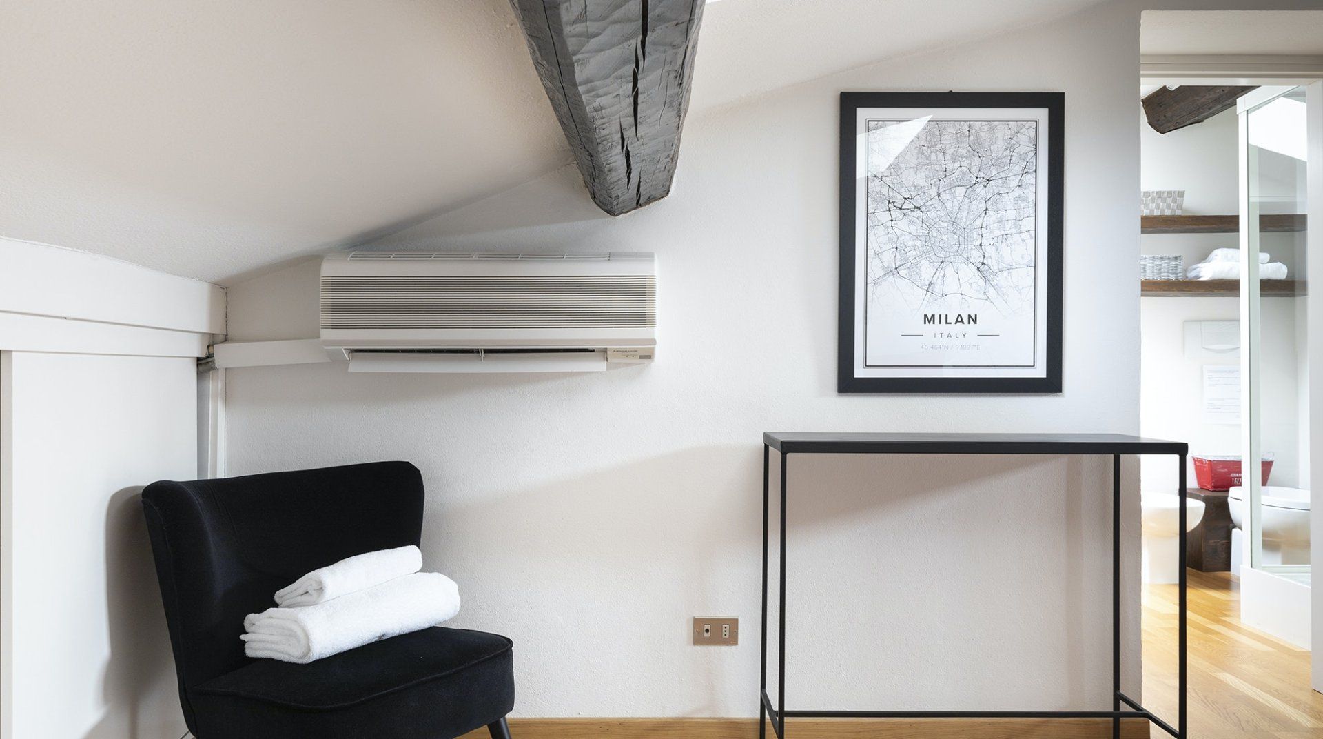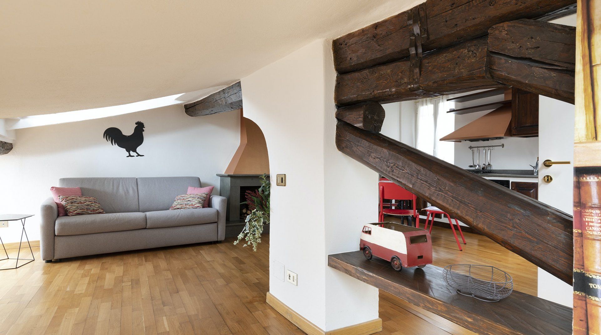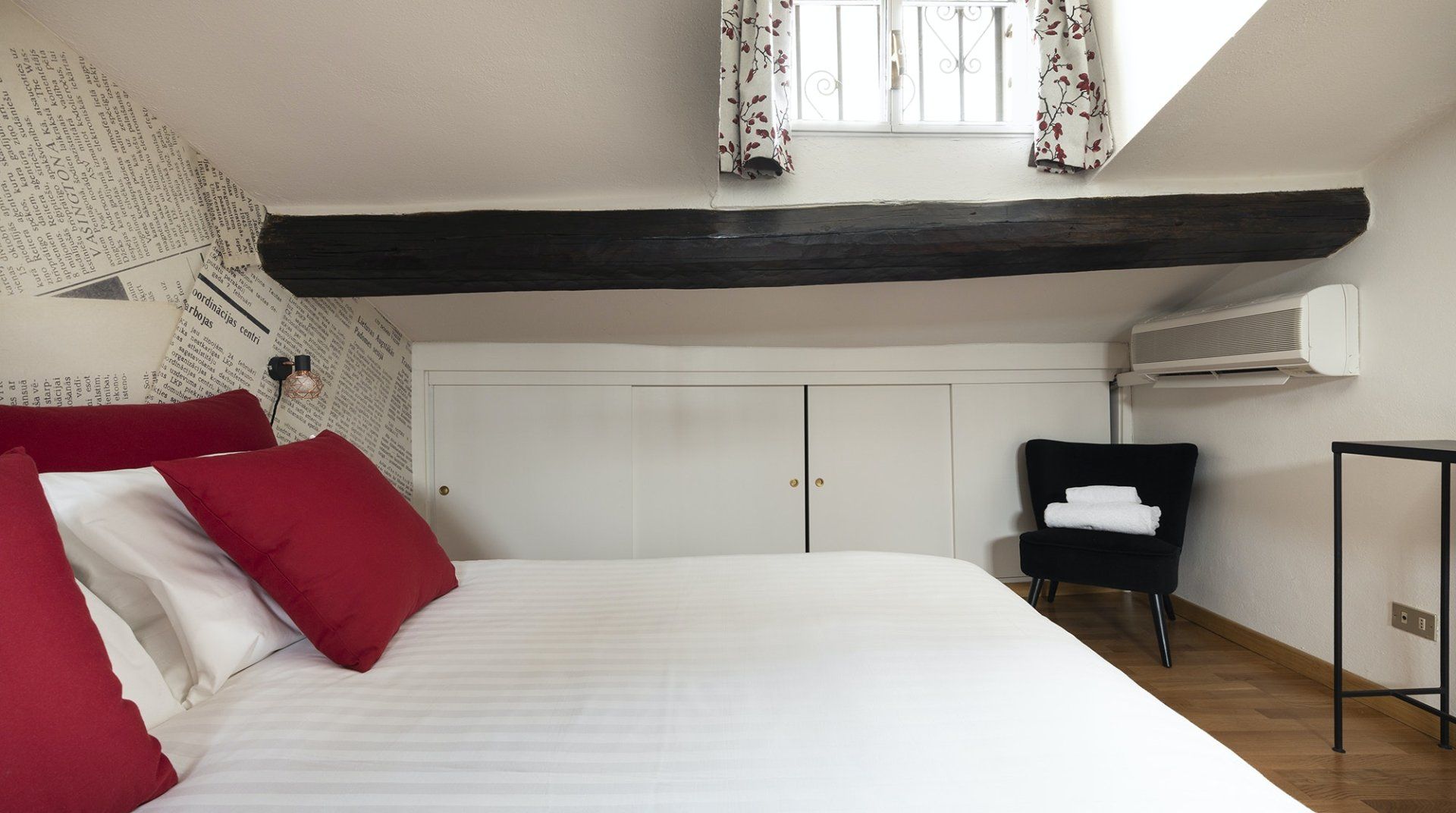 You’ll be surrounded by chic shopping streets in the middle of Brera, just two minutes down the street from the beautiful art gallery Pinacoteca di Brera. You can easily walk to the Duomo di Milano, just fourteen minutes away, or take the twelve-minute saunter to sprawling Parco Sempione. Back at home, you’ll be neatly tucked under the eaves, with characterful exposed wooden beams and bright skylights. The open-plan living area makes the most of the small space, and it’s filled to the brim with charm – the wood kitchen, ornamental fireplace and pops of red that adorn the walls and furniture. The playful library wallpaper and armchair make a good nook for reading, while the bedroom is especially inviting after a long day of exploring on your feet. Sink into the comfortable sheets, and sleep well to recharge for tomorrow.