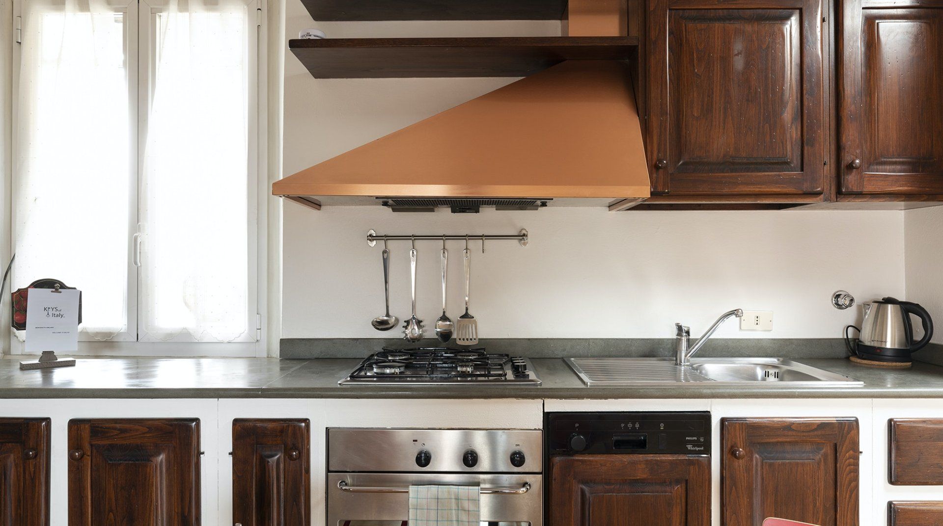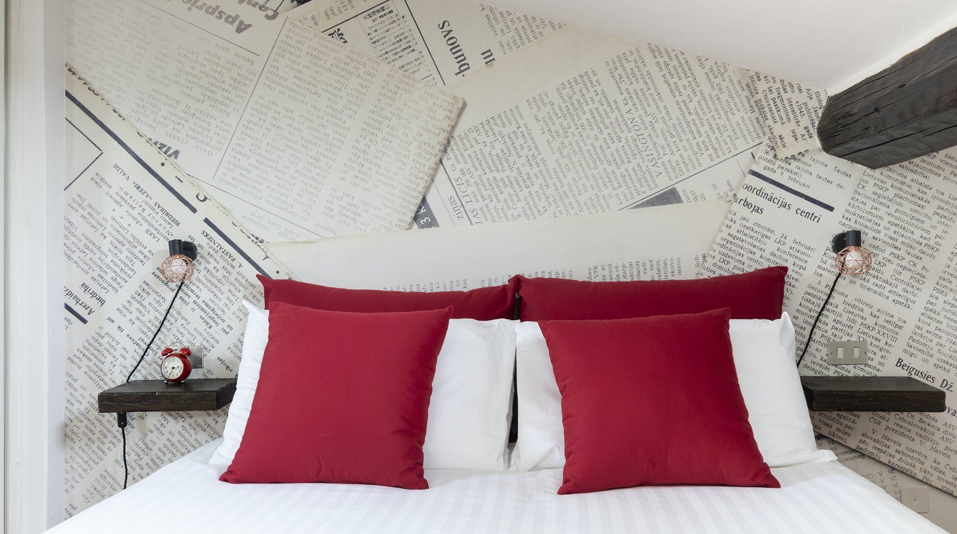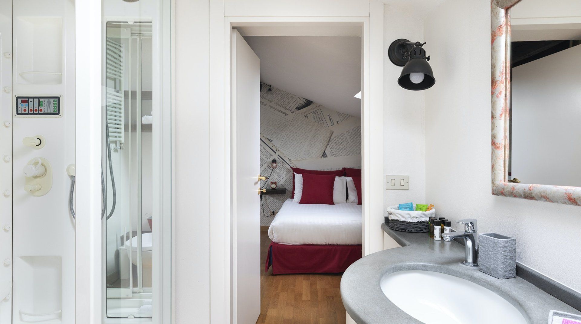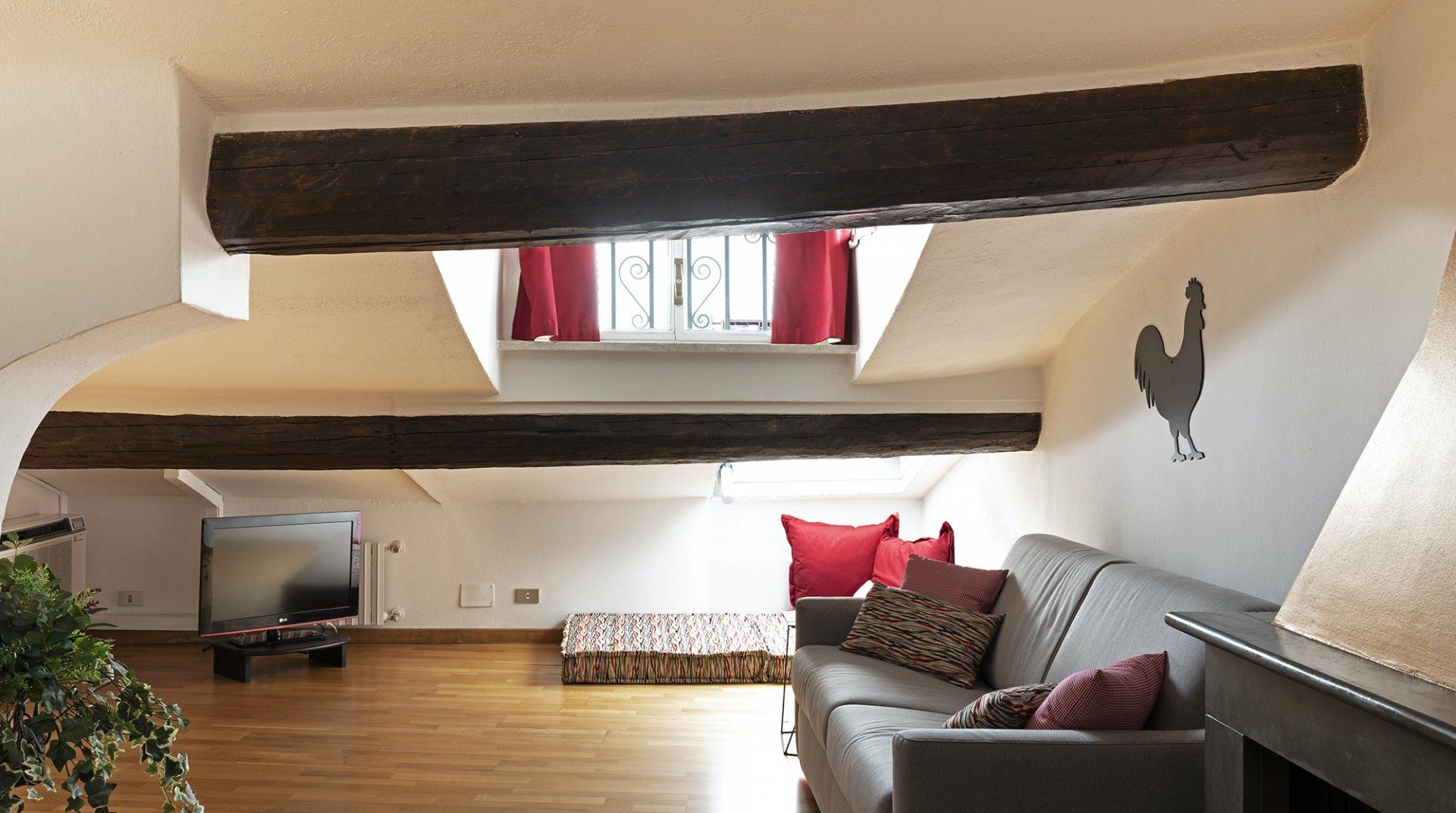 You’ll be surrounded by chic shopping streets in the middle of Brera, just two minutes down the street from the beautiful art gallery Pinacoteca di Brera. You can easily walk to the Duomo di Milano, just fourteen minutes away, or take the twelve-minute saunter to sprawling Parco Sempione. Back at home, you’ll be neatly tucked under the eaves, with characterful exposed wooden beams and bright skylights. The open-plan living area makes the most of the small space, and it’s filled to the brim with charm – the wood kitchen, ornamental fireplace and pops of red that adorn the walls and furniture. The playful library wallpaper and armchair make a good nook for reading, while the bedroom is especially inviting after a long day of exploring on your feet. Sink into the comfortable sheets, and sleep well to recharge for tomorrow.
