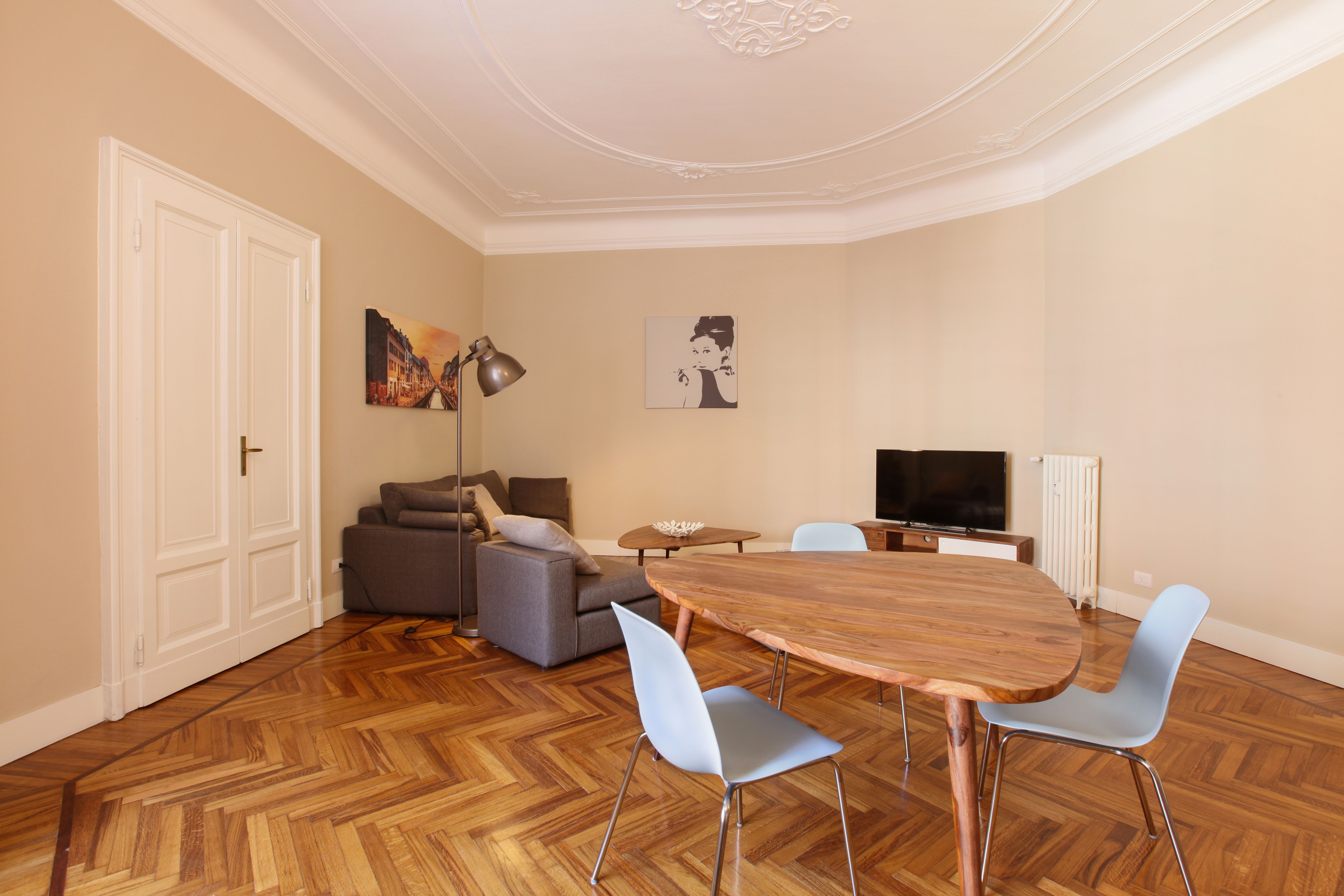 Sforzesco Castle and Parco Sempione are just two of Milan’s attractions within a short walk from this apartment. And with plenty of cafes and restaurants in this sought-after area, you don't have to cook if you don’t want to. We love the elegant period building this apartment is housed in. There's a large open-plan living room here with high ceilings and period features. And there are views over the communal courtyard from the bedroom. With this place, it’s easy to get the most out of Italy’s fashion capital.