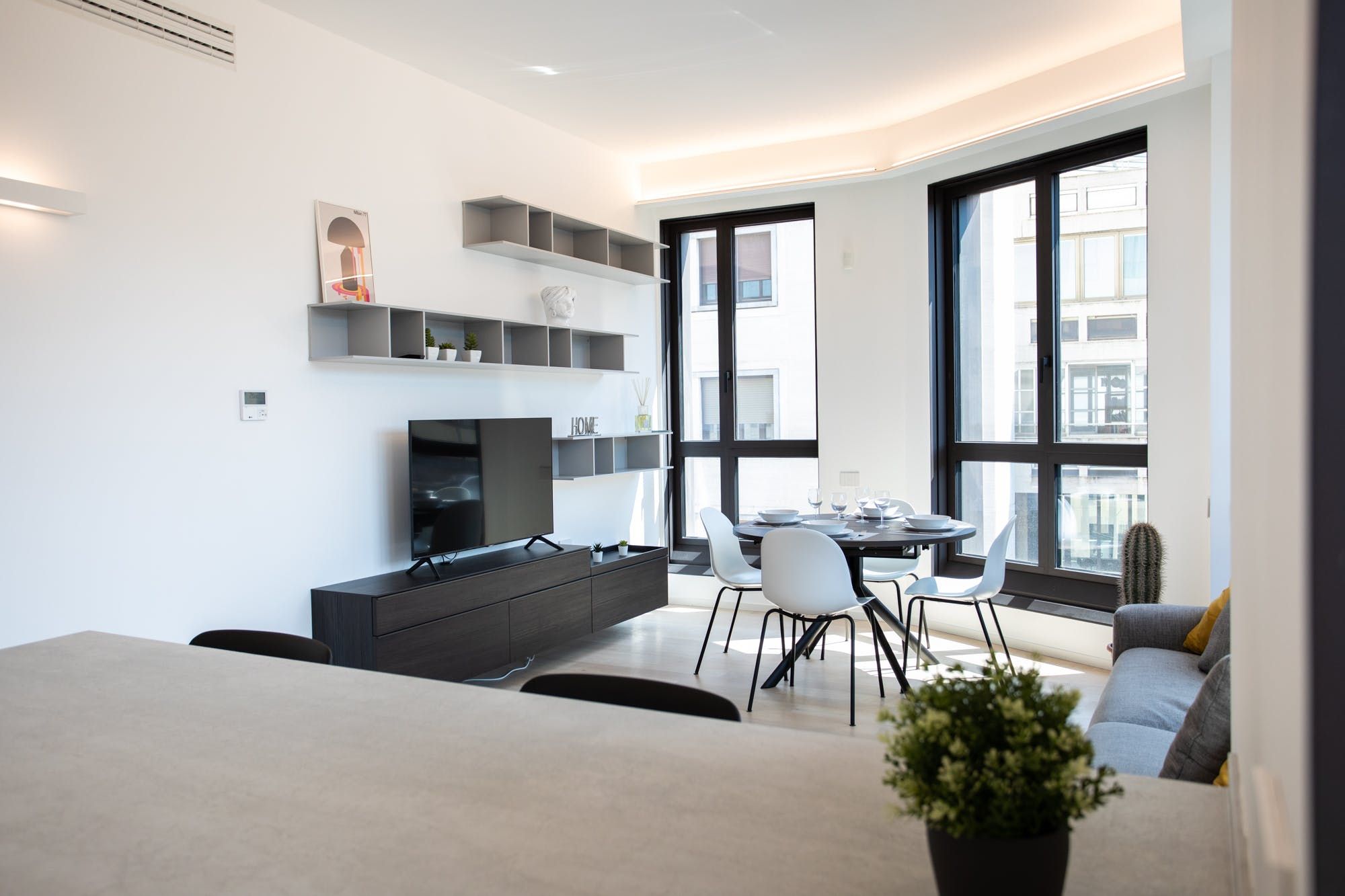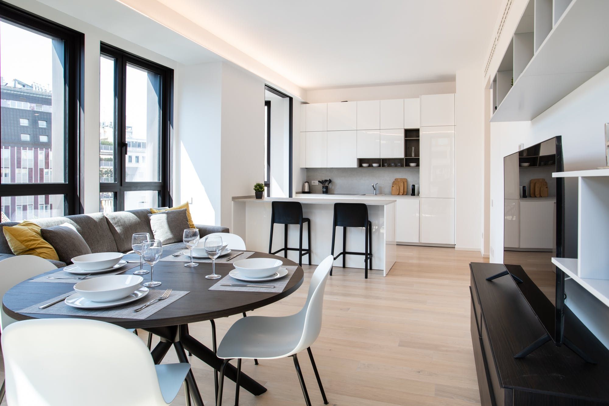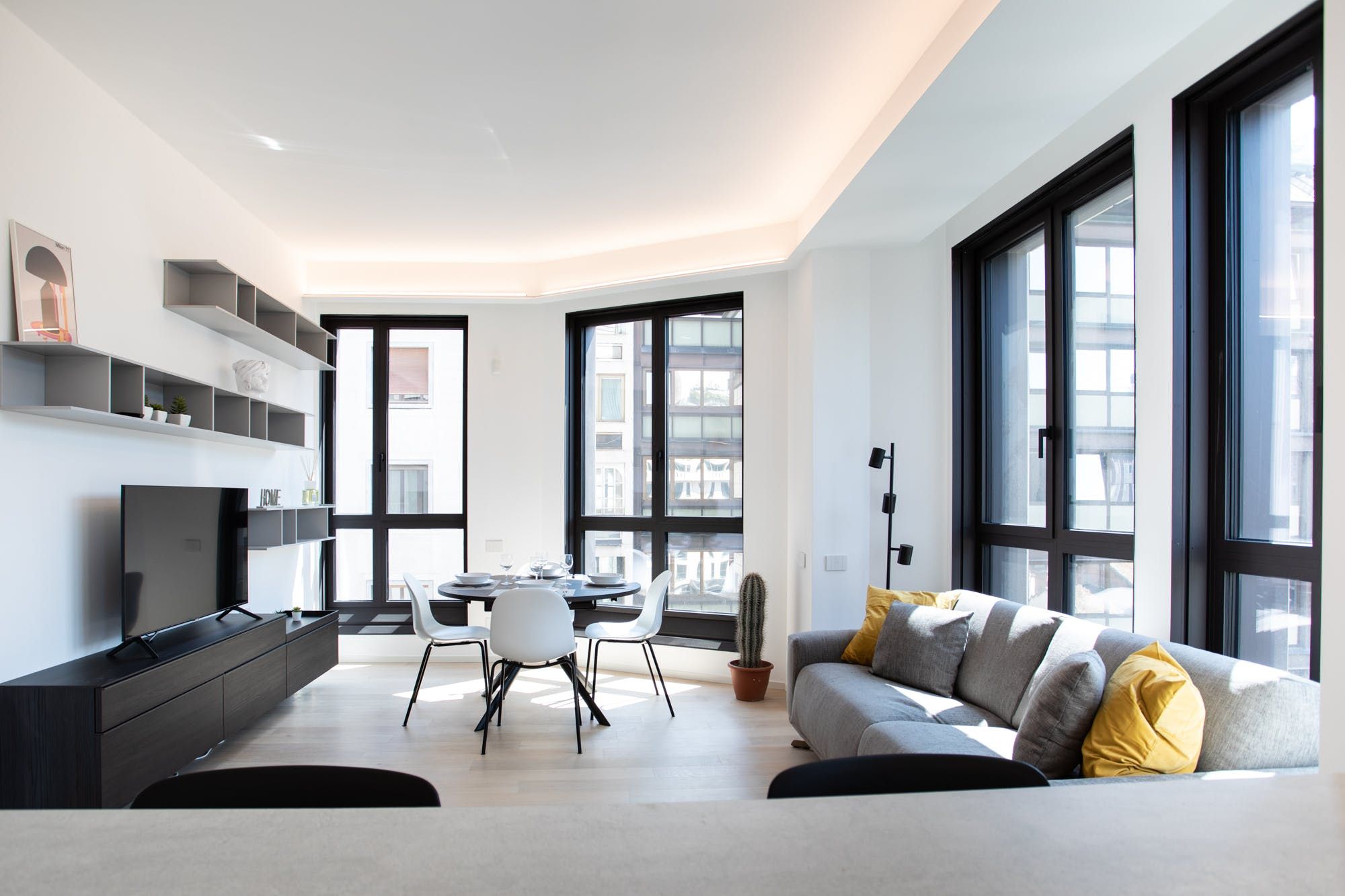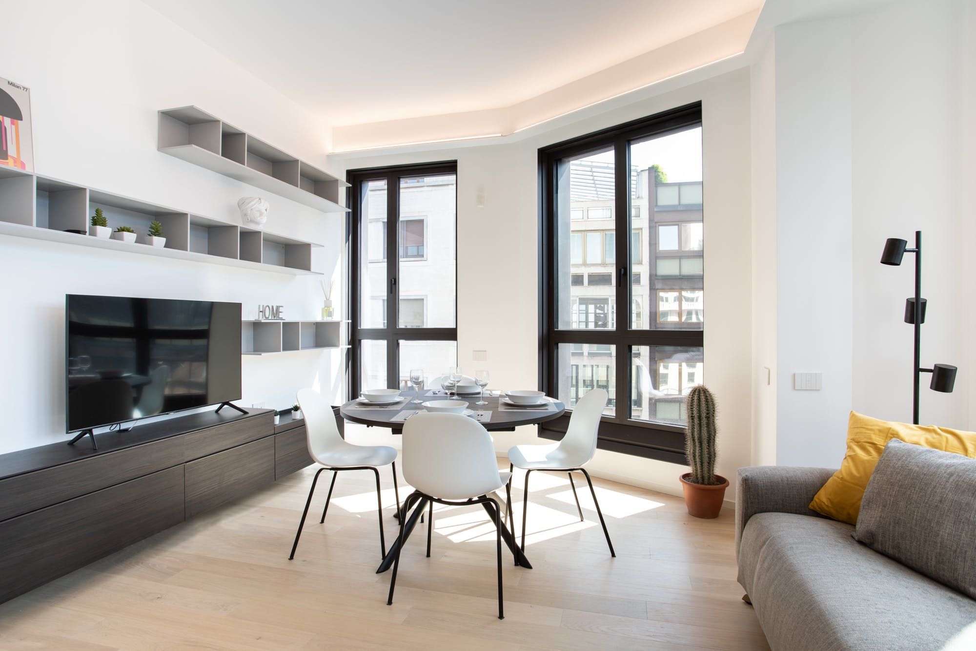 There’s an incredible amount of natural light in this chic, pared-back apartment that makes the whole space dazzle. With its floor-to-ceiling windows on all sides, the open-plan living area gives you privileged views across Milan’s rooftops and a living backdrop to admire from the comfort of the sofa or while enjoying a meal at the stylish round dining table.