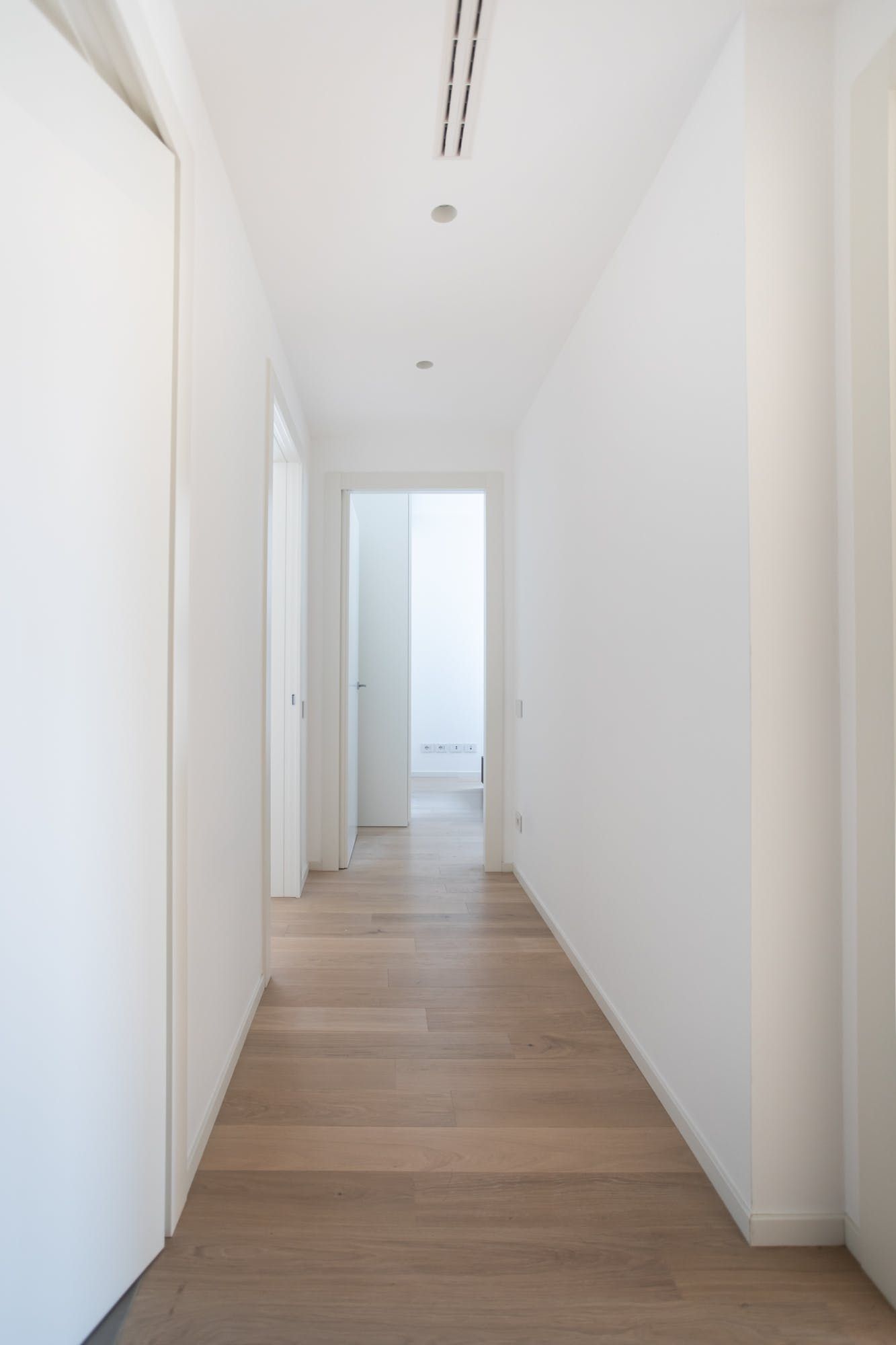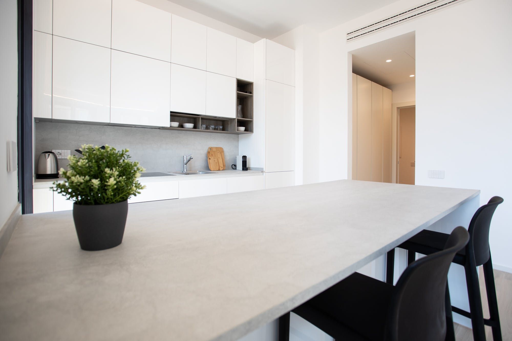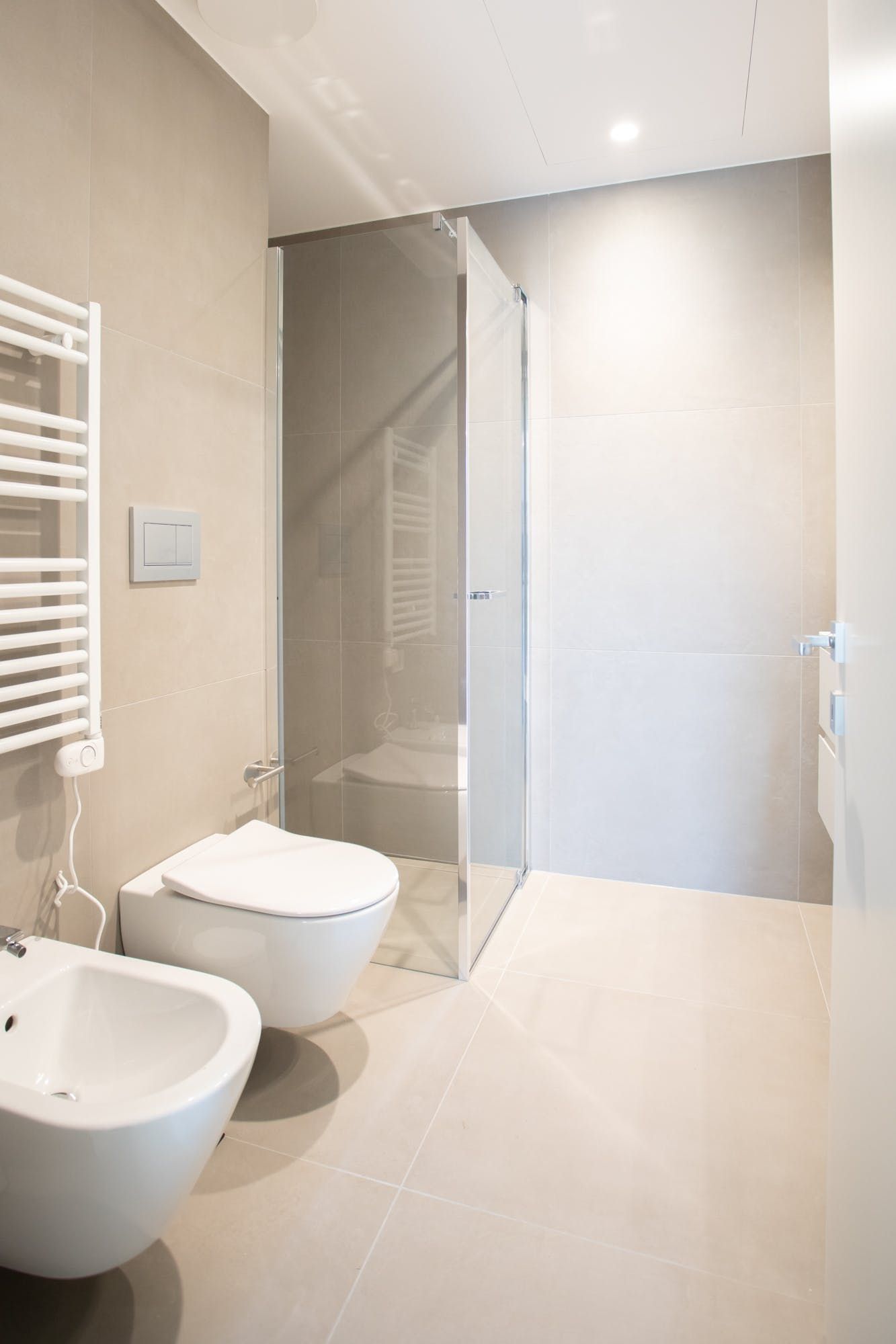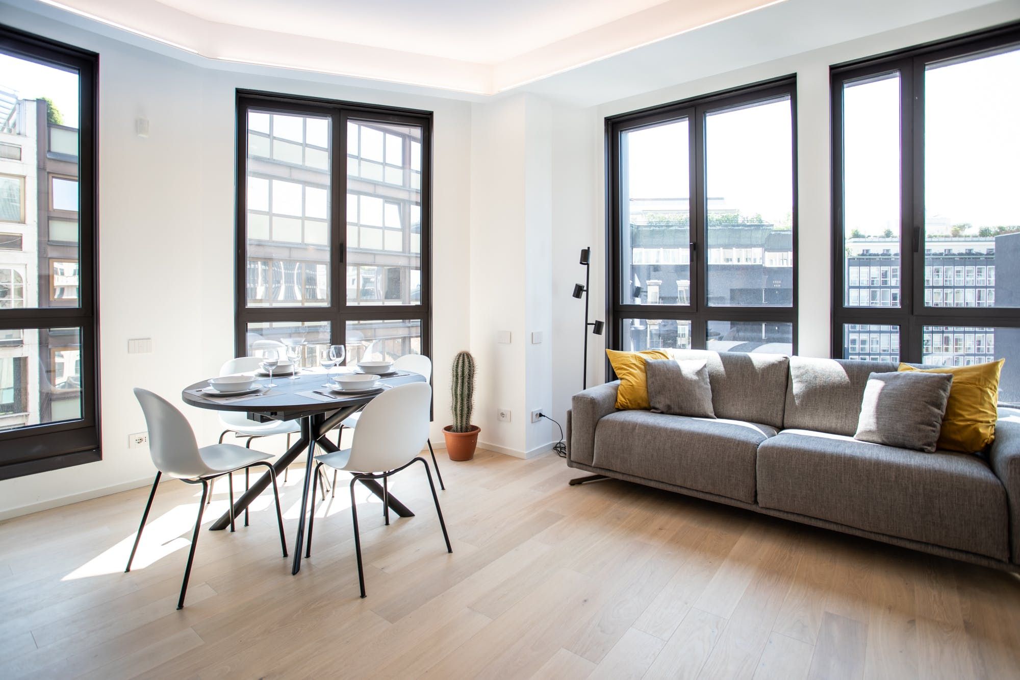 There’s an incredible amount of natural light in this chic, pared-back apartment that makes the whole space dazzle. With its floor-to-ceiling windows on all sides, the open-plan living area gives you privileged views across Milan’s rooftops and a living backdrop to admire from the comfort of the sofa or while enjoying a meal at the stylish round dining table.
