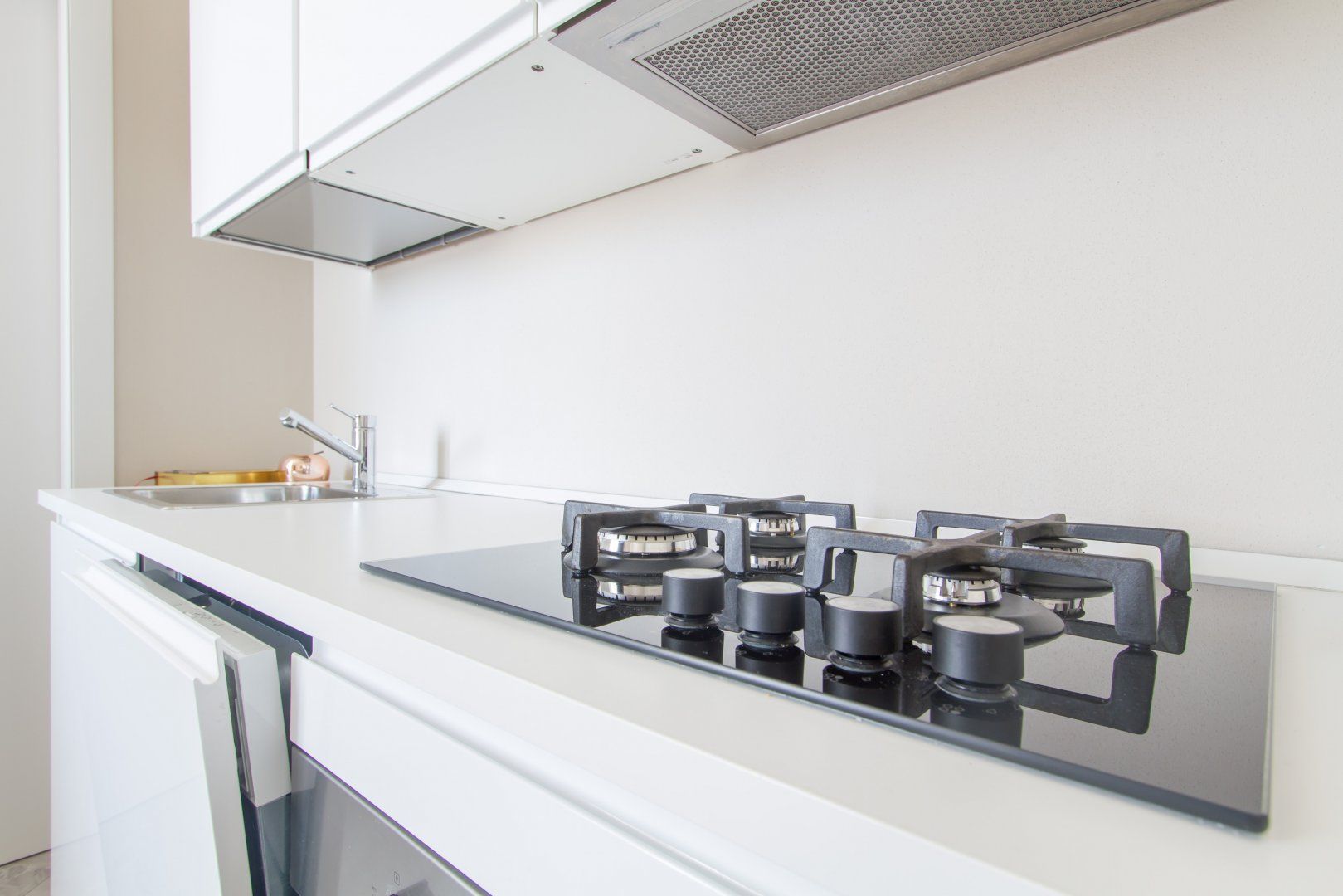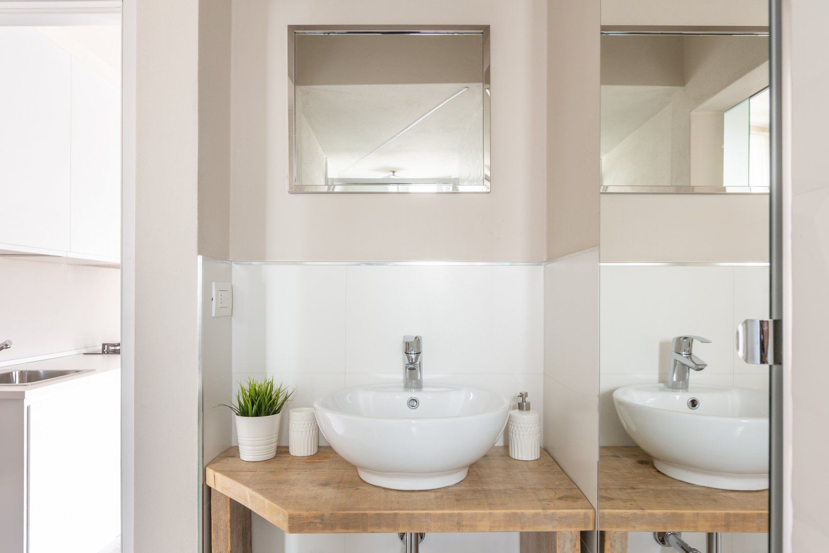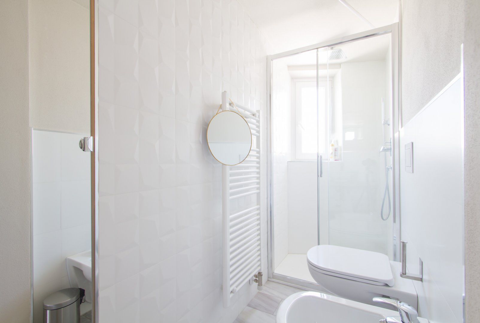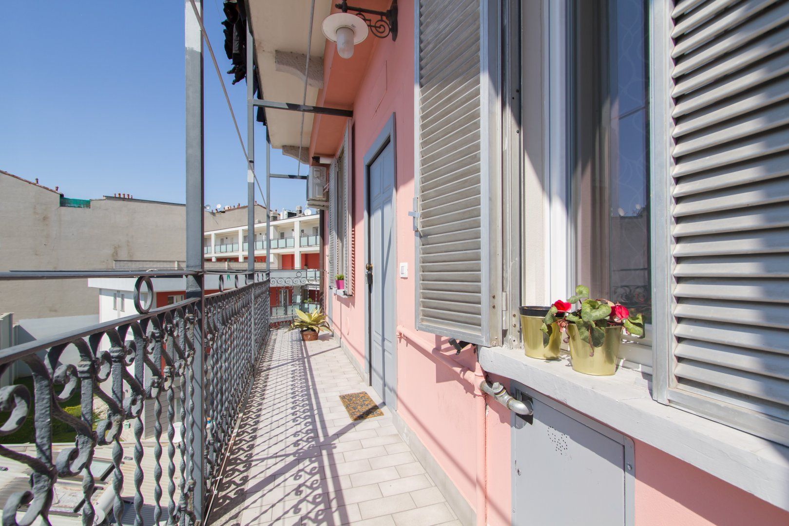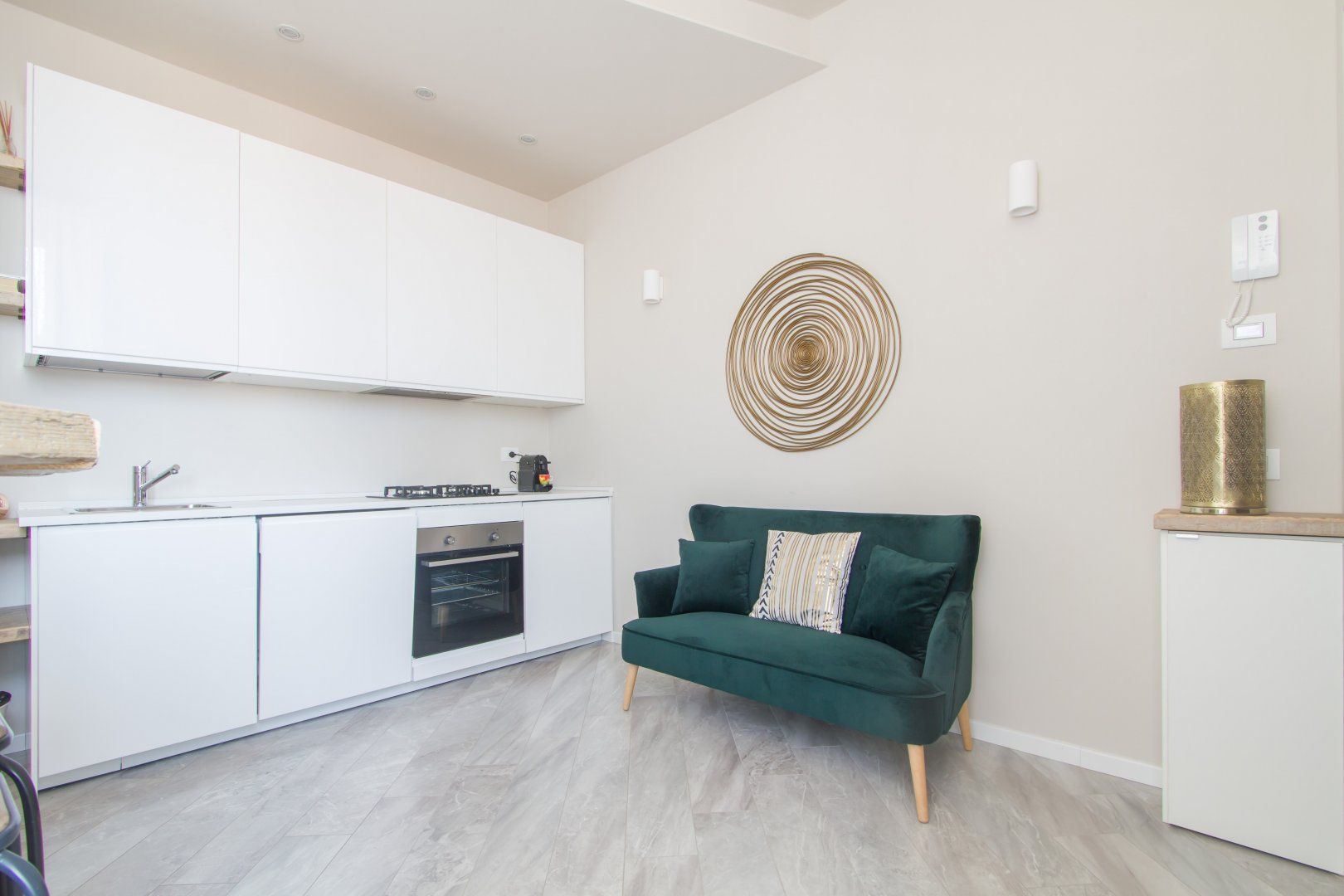 Inside, chic minimalism is the name of the game with an open-plan living area that gets plenty of light, and its sparkling white walls offset by pops of emerald green and gold accents. Make yourself comfortable on the plump loveseat with a glass of Italian wine, or better yet, perch on the shared front balcony with a sundowner as you take in views of the inner courtyard and the surrounding rooftops.