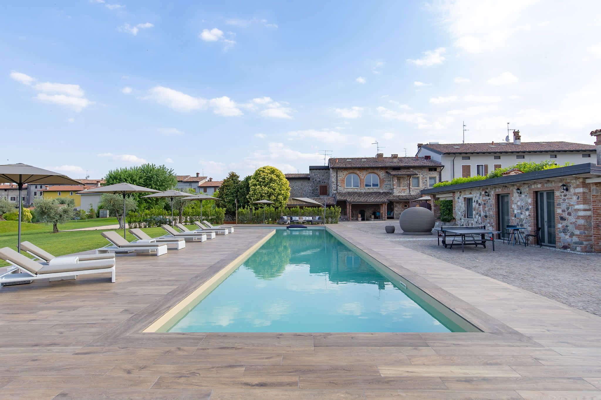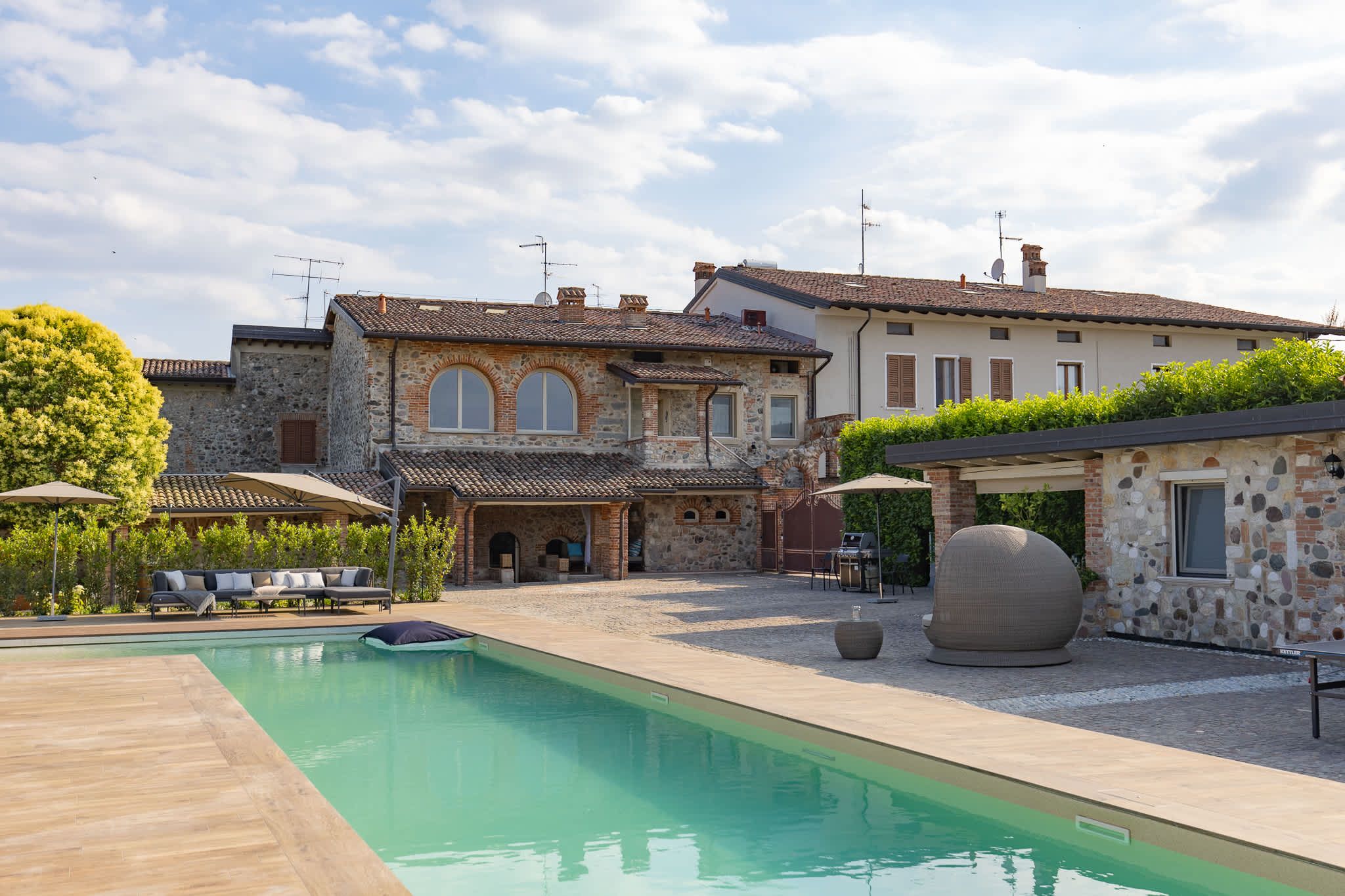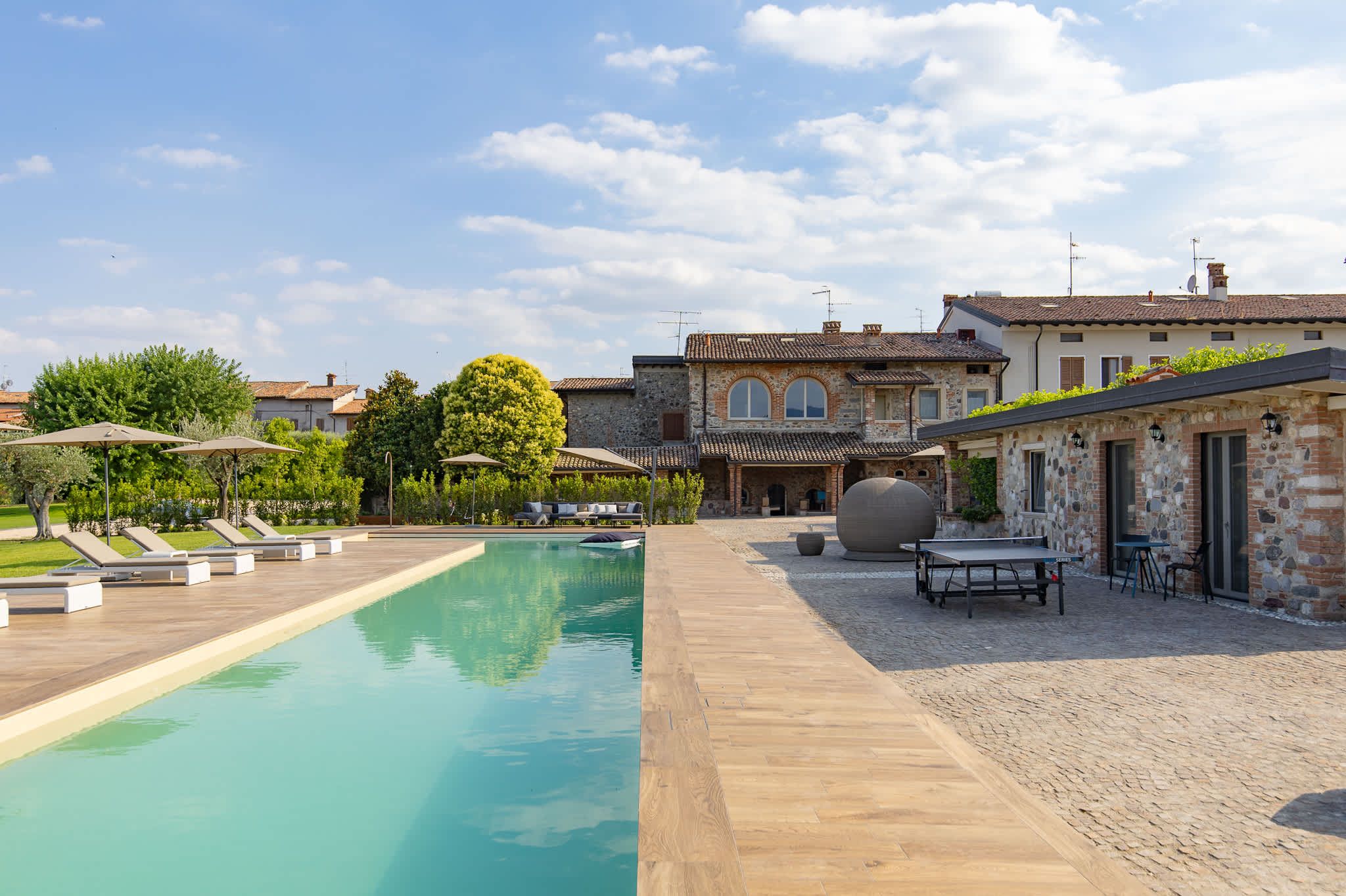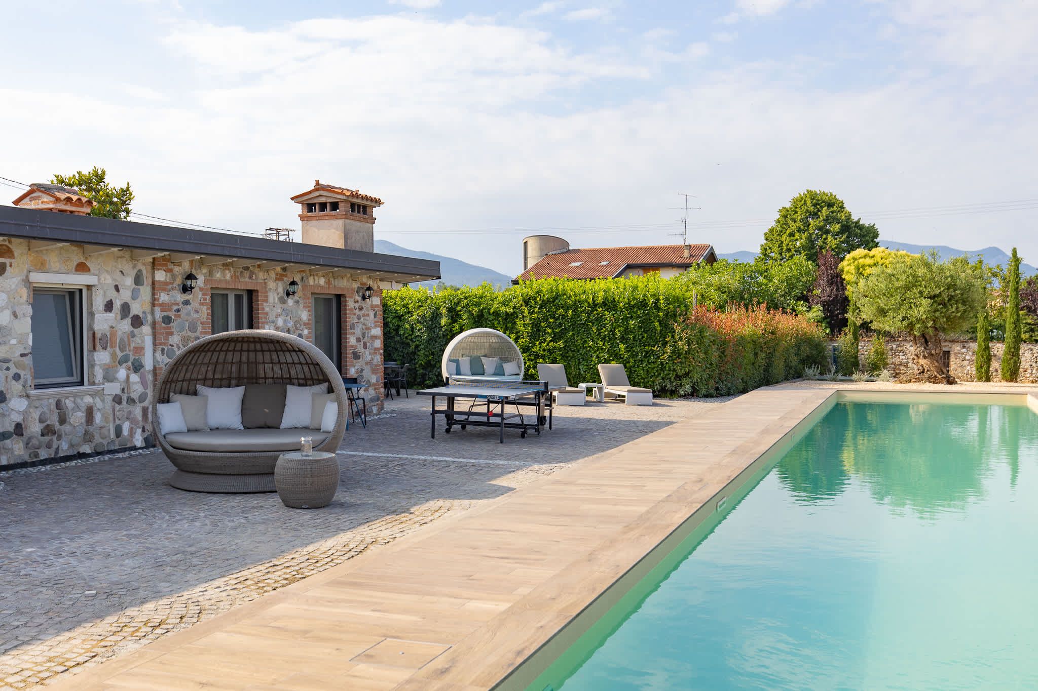 Nestled within the rolling vineyards of the Valtenesi region, this 17th-century home has worn many hats – monastery, winery, private residence, and now a rental retreat. Outside, you’ll find a 25-metre pool, scenic spots for relaxing or dining alfresco, and a hammock strung between the trees. Inside, historic charm meets contemporary living – think soft linens, exposed stone walls, and a sleek kitchen. There’s even a gym in the cellar. Whether you’re here for the wine, nature, or golfing, this spot makes it all feel effortless.