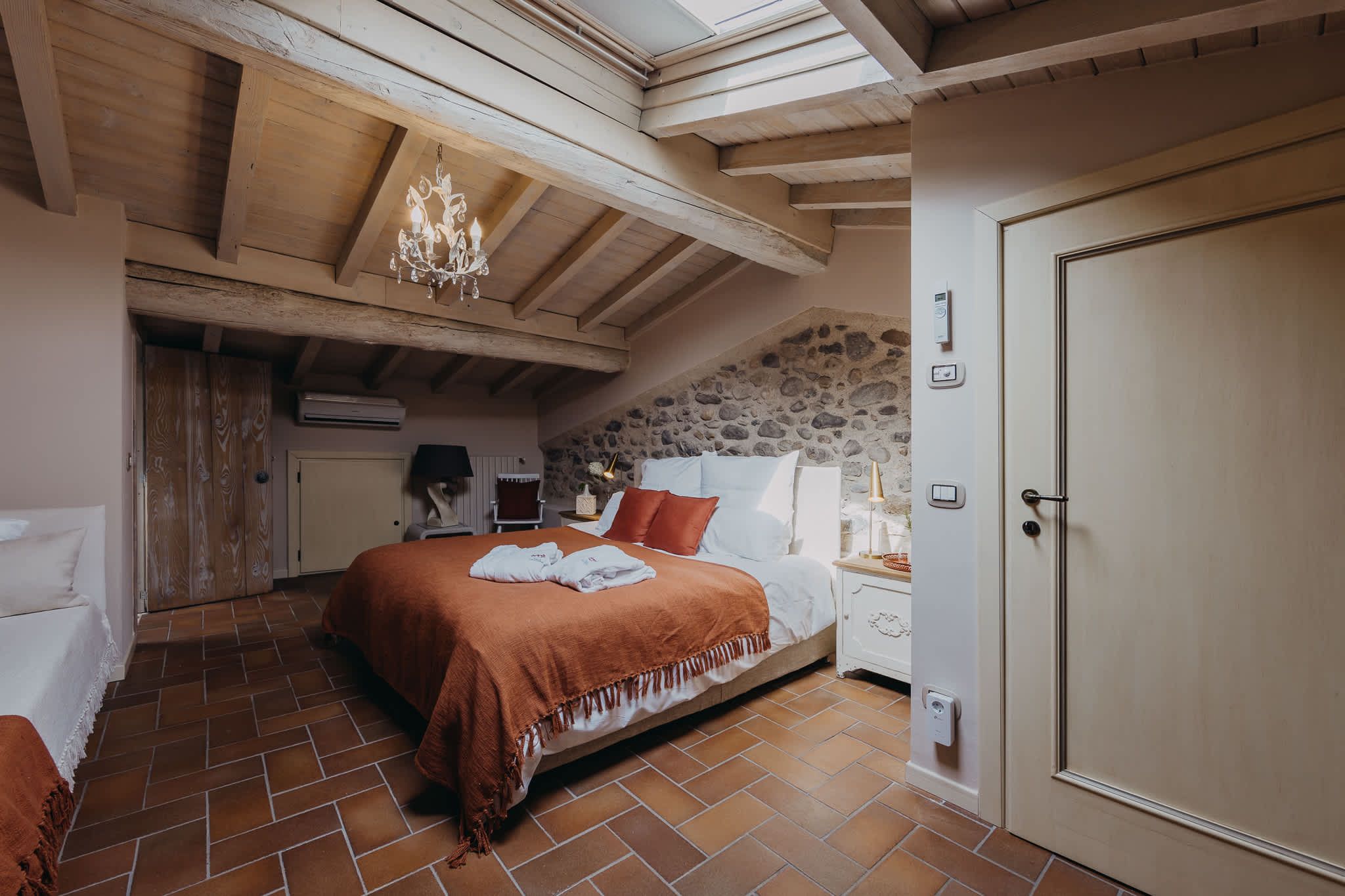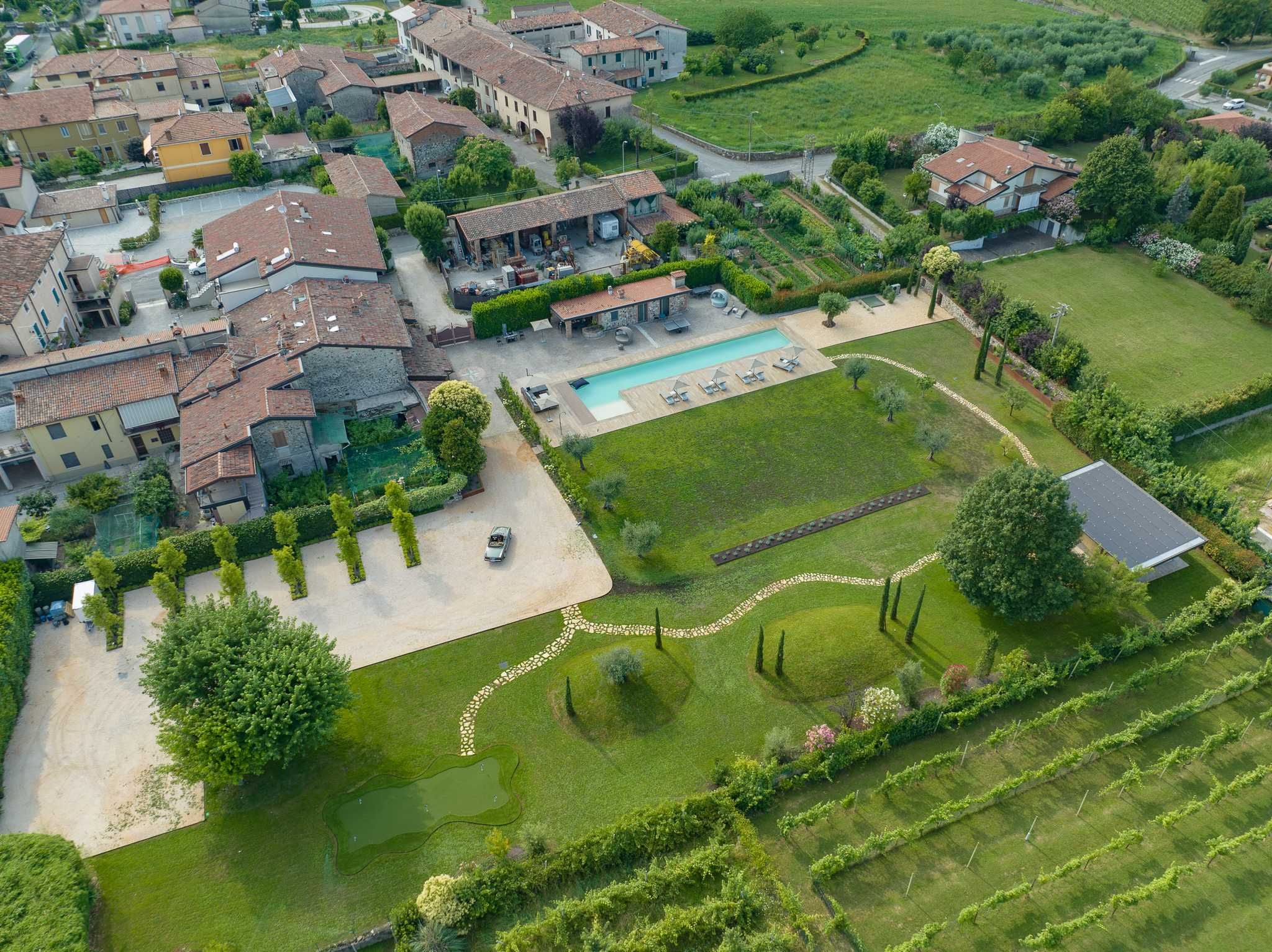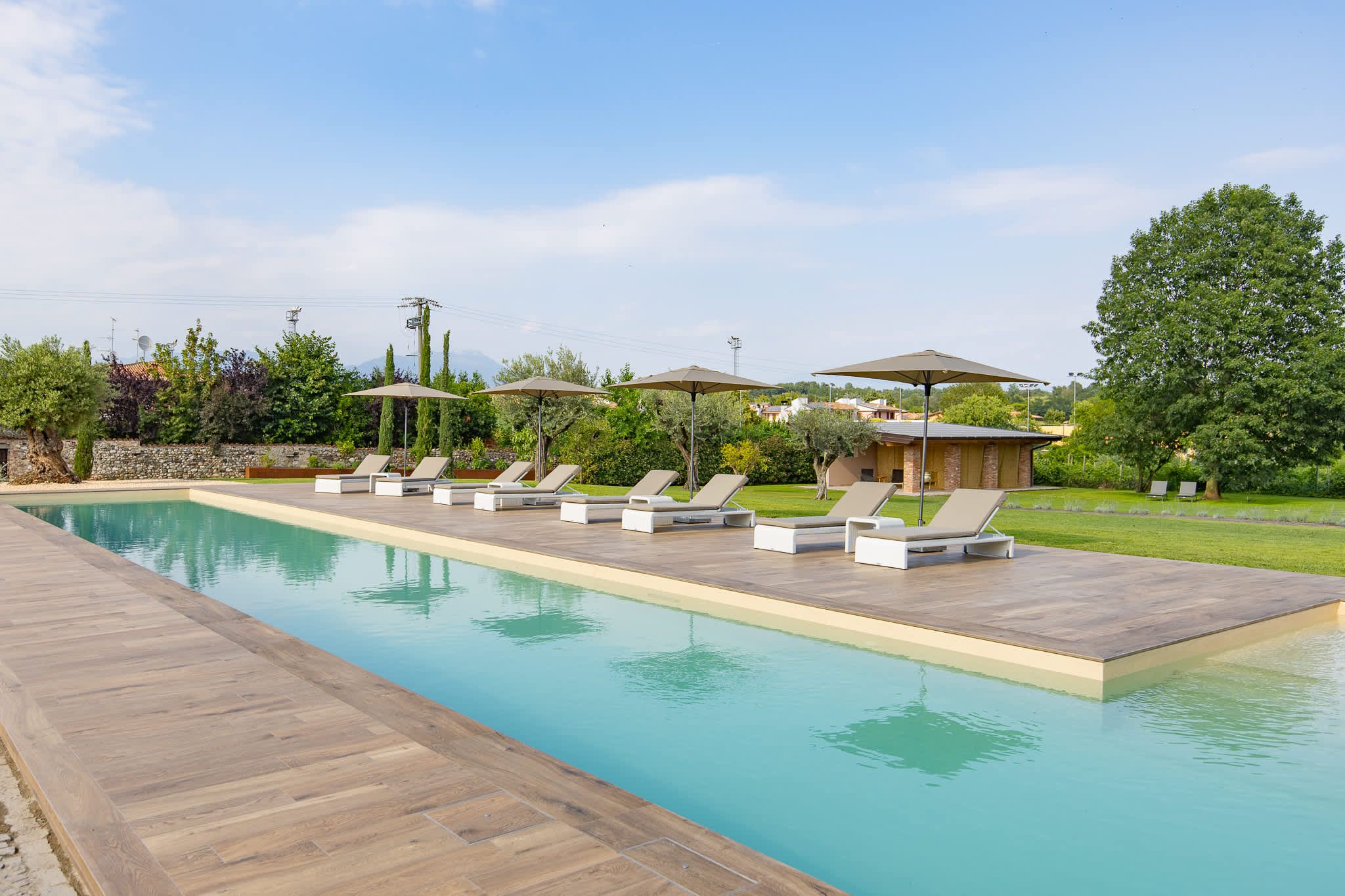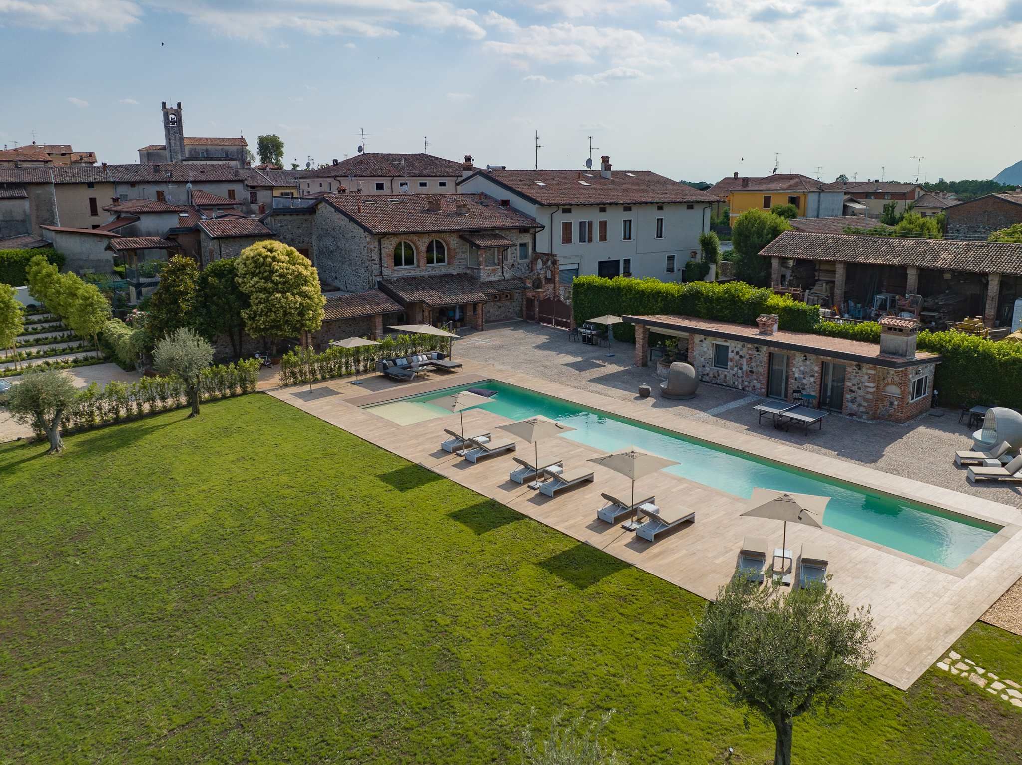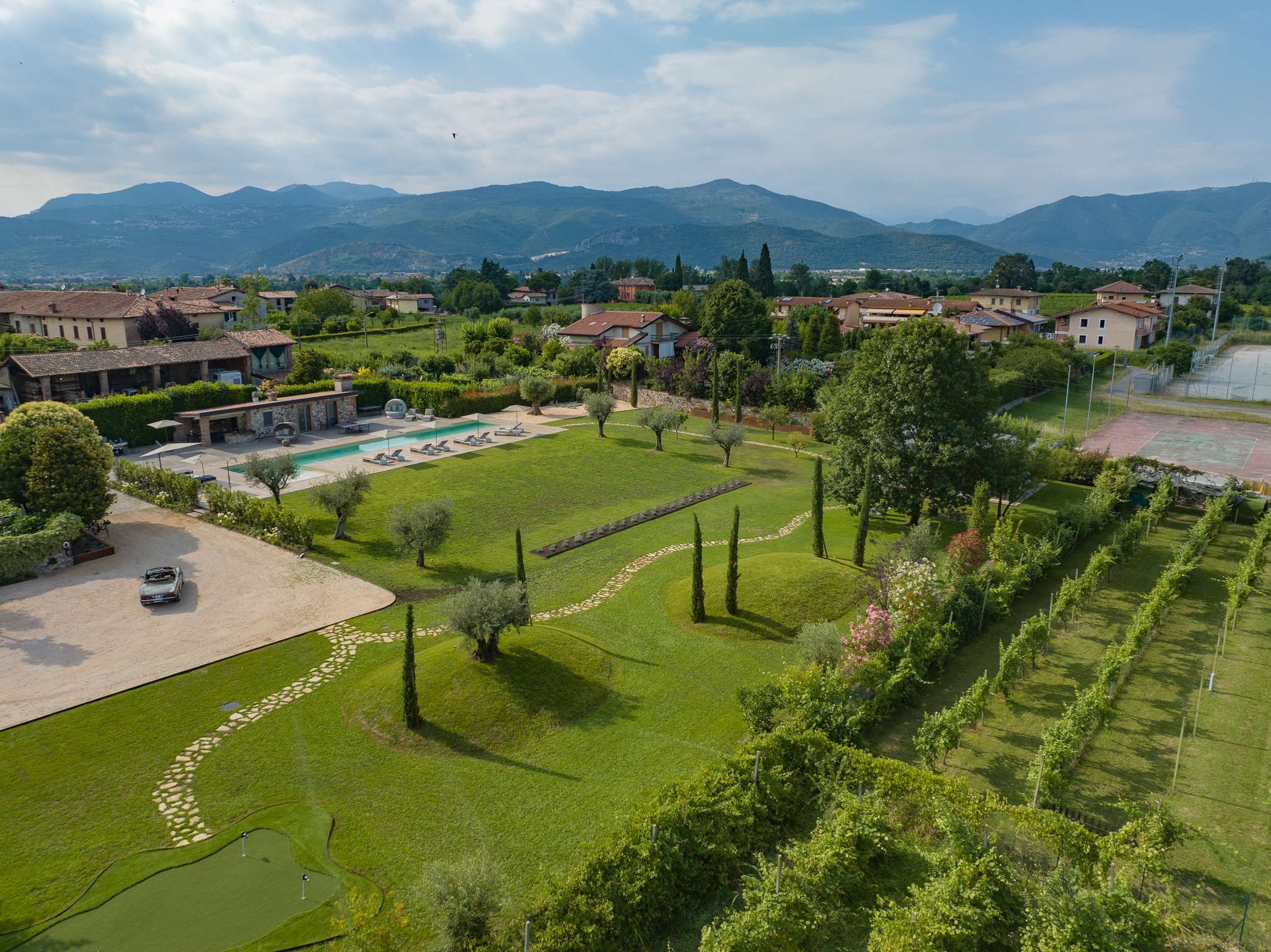 Nestled within the rolling vineyards of the Valtenesi region, this 17th-century home has worn many hats – monastery, winery, private residence, and now a rental retreat. Outside, you’ll find a 25-metre pool, scenic spots for relaxing or dining alfresco, and a hammock strung between the trees. Inside, historic charm meets contemporary living – think soft linens, exposed stone walls, and a sleek kitchen. There’s even a gym in the cellar. Whether you’re here for the wine, nature, or golfing, this spot makes it all feel effortless.