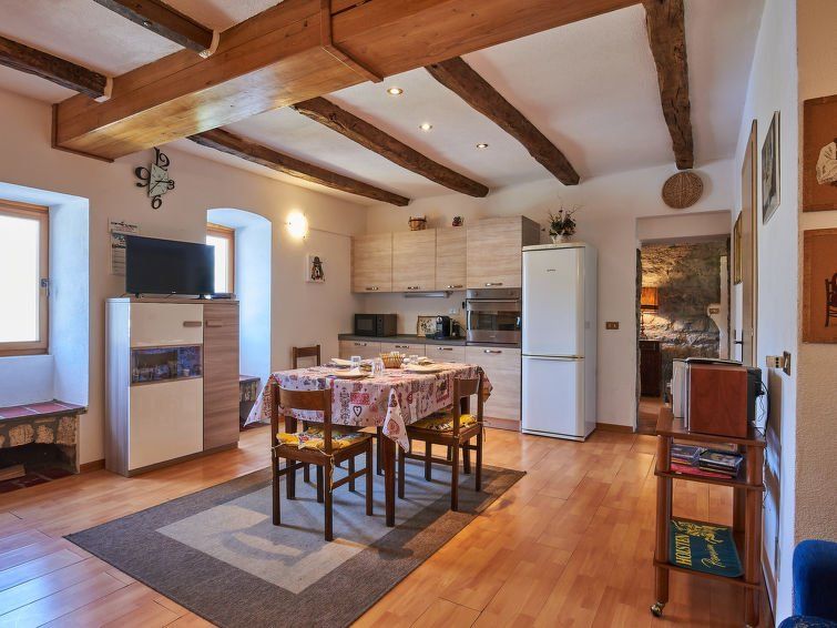 3-room apartment 80 m2 on 1st floor. Practical furnishings: living/dining room with 1 sofabed (140 cm), TV. 1 double bedroom. Walk-through room with 1 x 2 bunk beds. Kitchenette (4 hot plates, oven, dishwasher, microwave, freezer). Shower/bidet/WC. Gas heating. Heating available only from 01.
