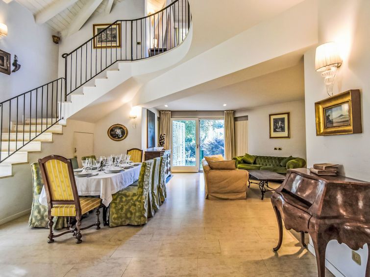 6-room villa 300 m2 on 2 levels. Bright, partly with sloping ceilings, comfortable and stylish furnishings: large living/dining room with sliding door, panoramic window with open-hearth fireplace (only for decoration), dining table and TV. Exit to the garden, to the swimming pool.