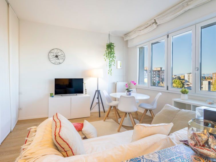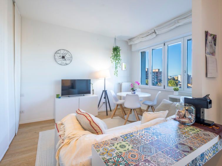 1-room studio 46 m2 on 6th floor, north-east facing position. Spacious and bright, practical and comfortable furnishings: living/dining room with 1 double bed, dining table and TV. Exit to the balcony. Open kitchen (dishwasher, 4 induction hot plates, toaster, kettle, microwave, freezer, electric coffee machine, Capsules for coffee machine (Illy)).