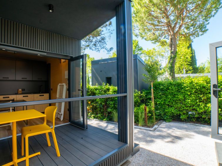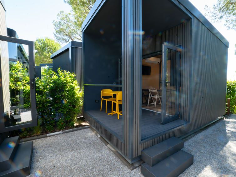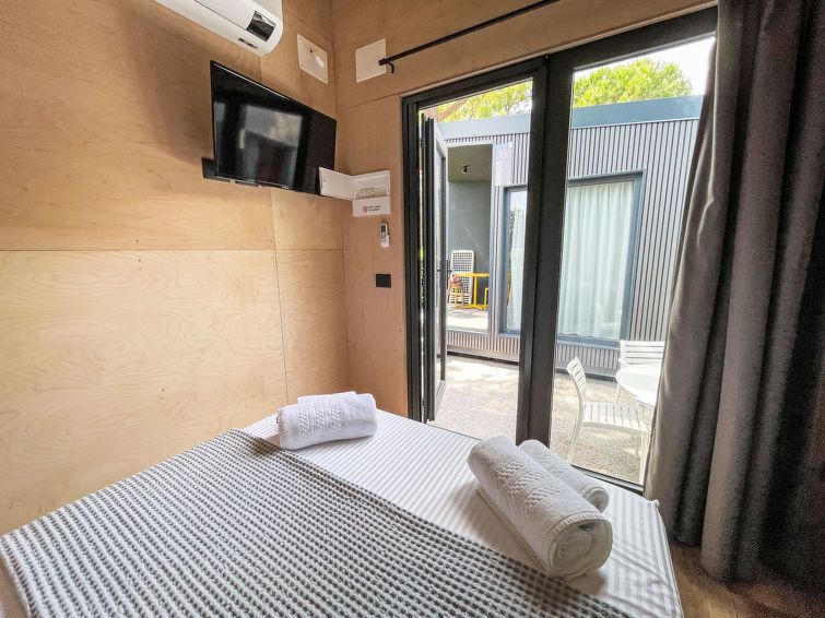"Lodge 4", 3-room mobile home 30 m2. Modern furnishings: living/dining room with dining nook and digital TV. Exit to the terrace. 1 room with 1 french bed (140 cm). 1 room with 1 x 2 bunk beds (70 cm). Kitchenette (4 induction hot plates, freezer) with dining table and TV. Shower/WC.