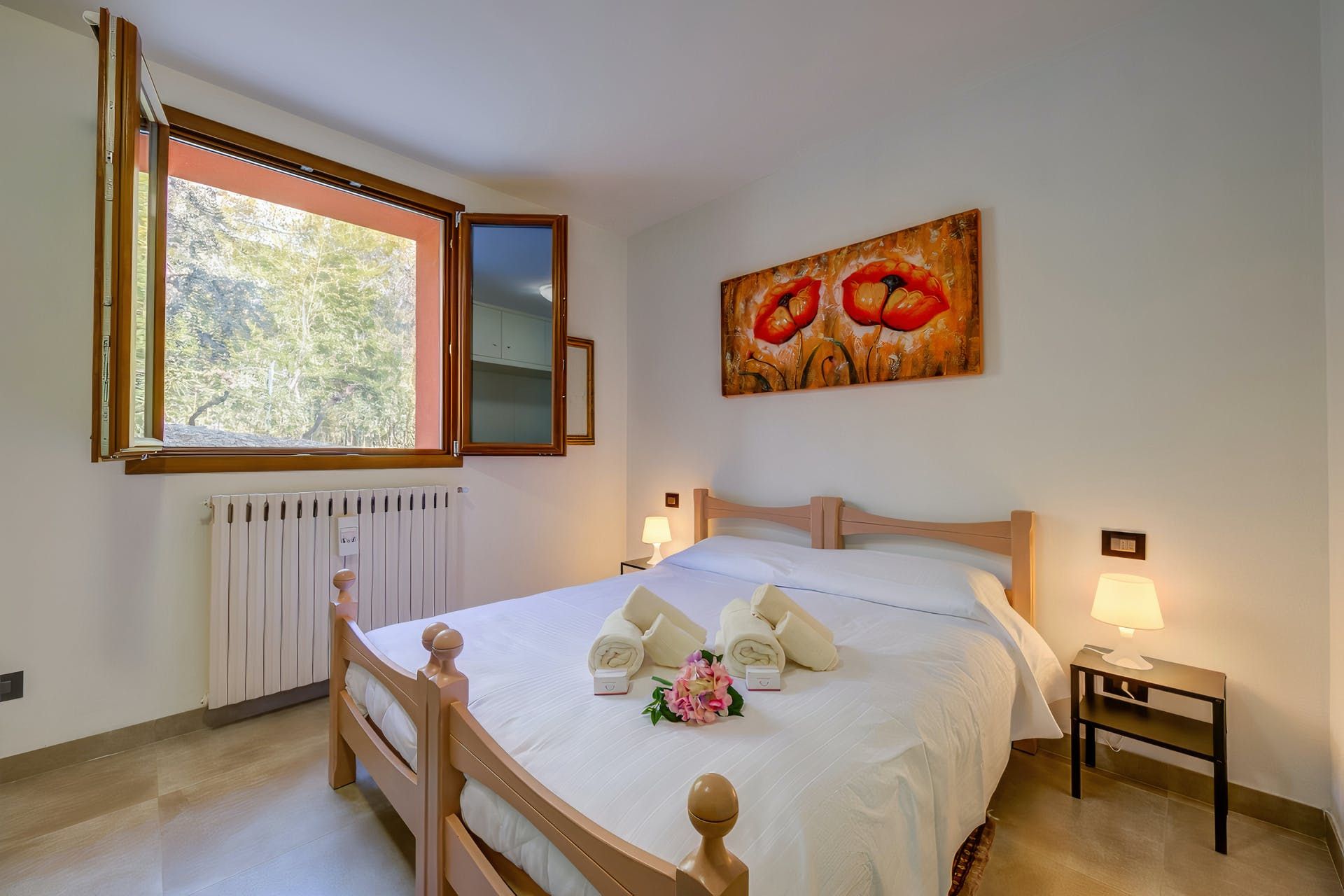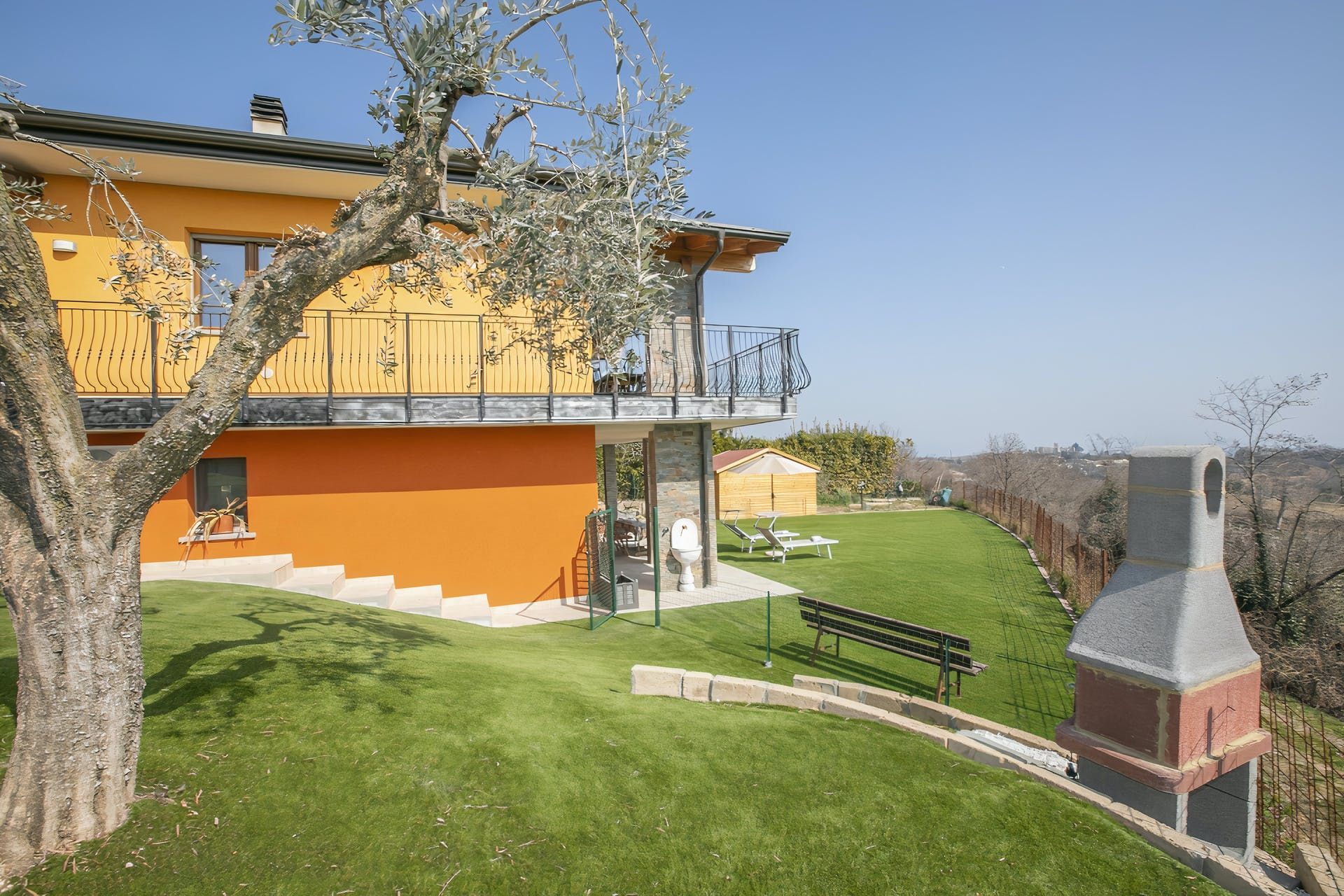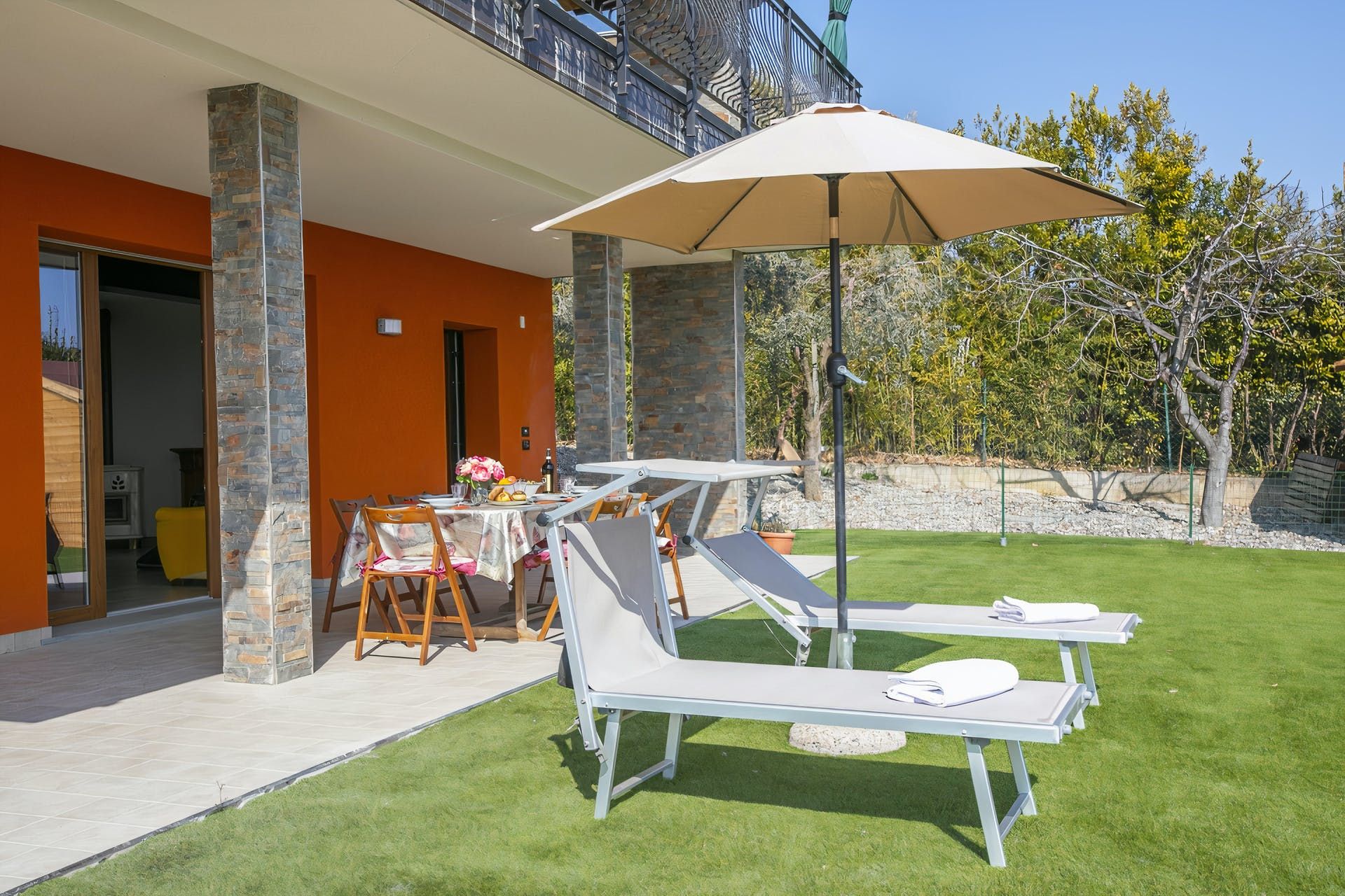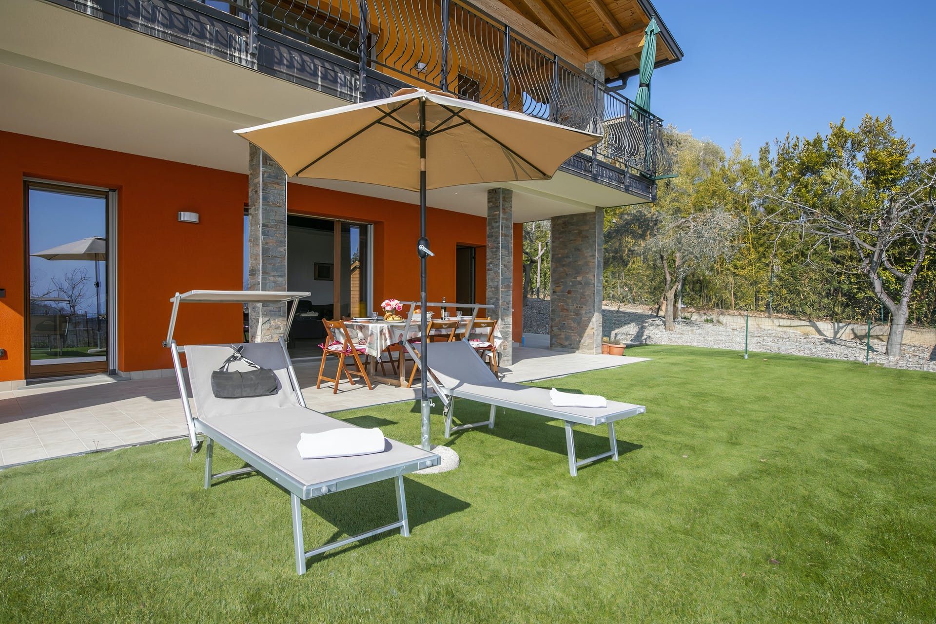 Sharing its outdoor pool with just one other apartment, this modern home sits in large gardens, in a quiet spot overlooking the rolling hills – the blue of Lake Garda just visible across the trees. With lovely lawns, old olive trees and plenty of green all around, it's a comfortable and practical home-from-home.