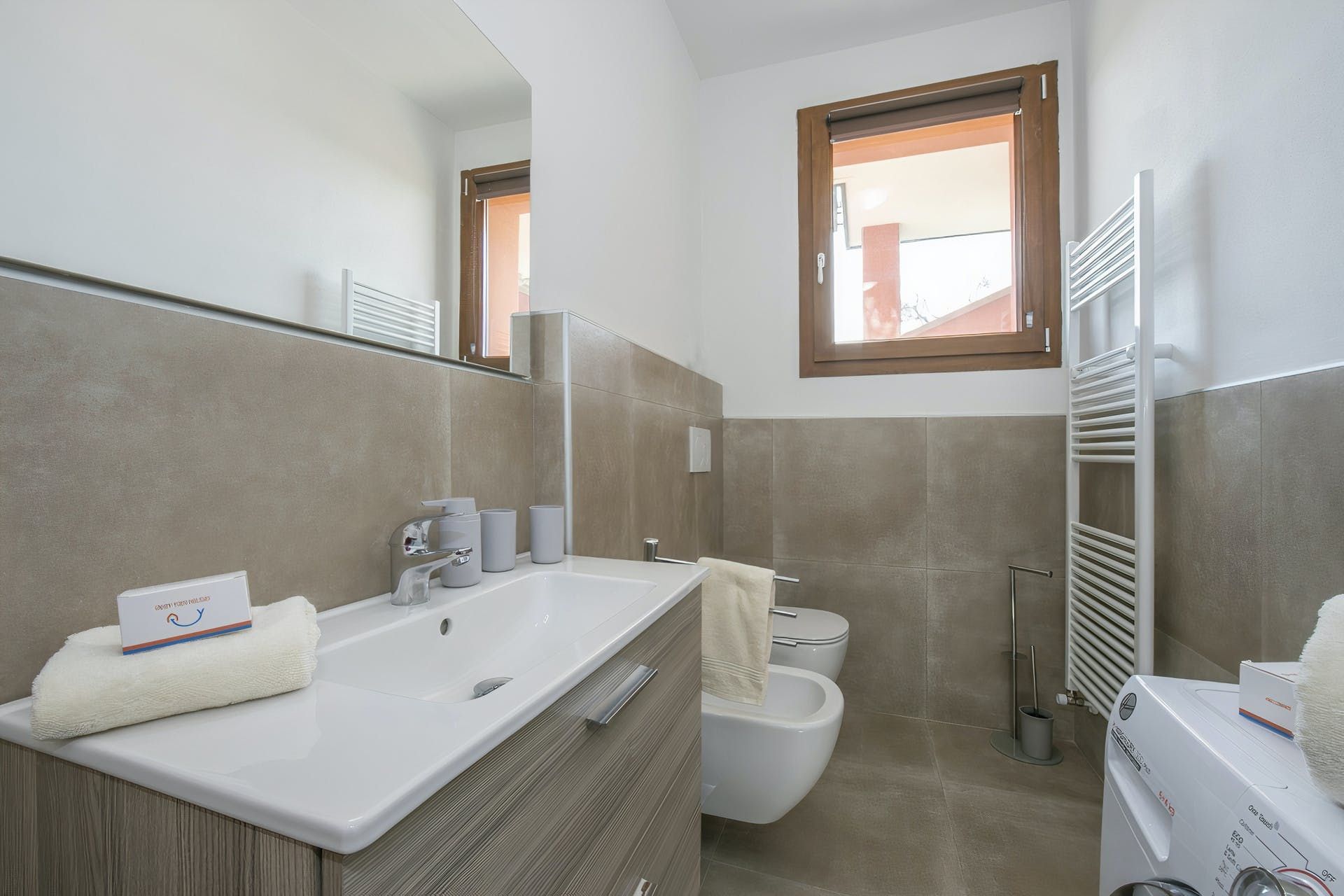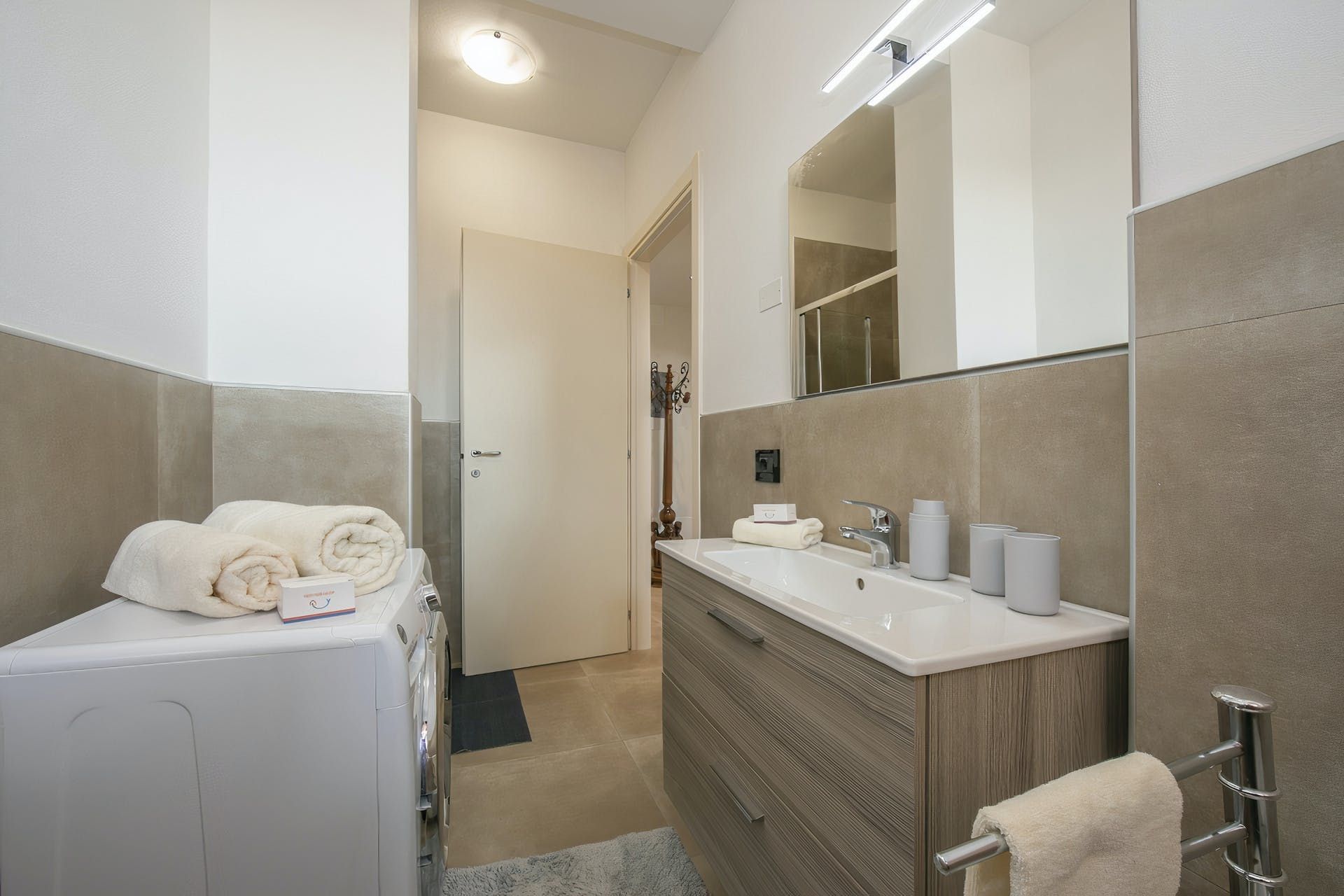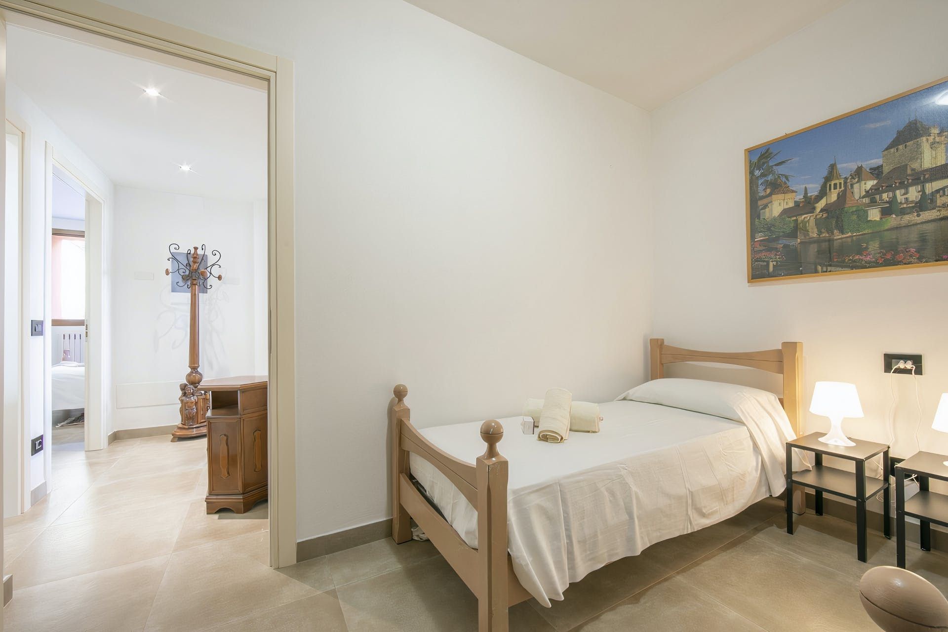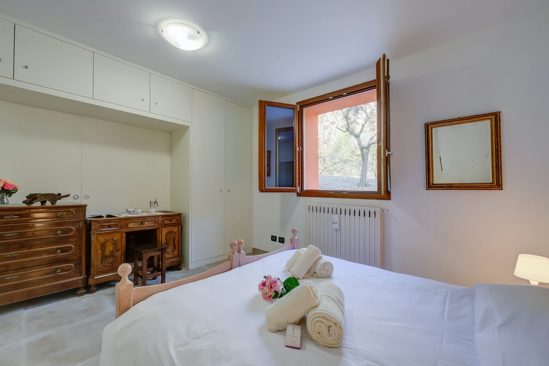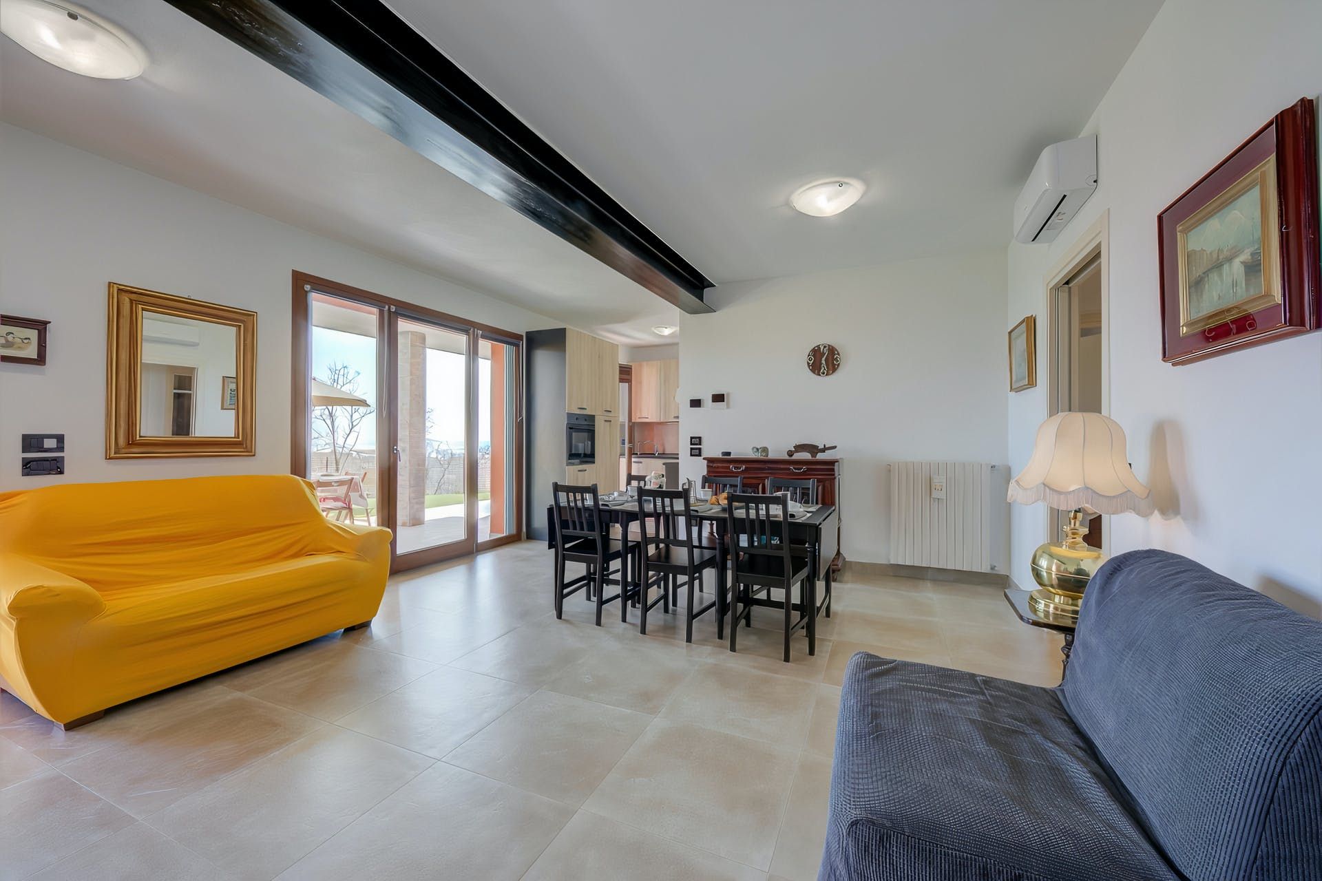 Sharing its outdoor pool with just one other apartment, this modern home sits in large gardens, in a quiet spot overlooking the rolling hills – the blue of Lake Garda just visible across the trees. With lovely lawns, old olive trees and plenty of green all around, it's a comfortable and practical home-from-home.