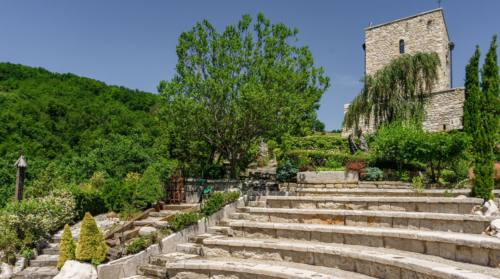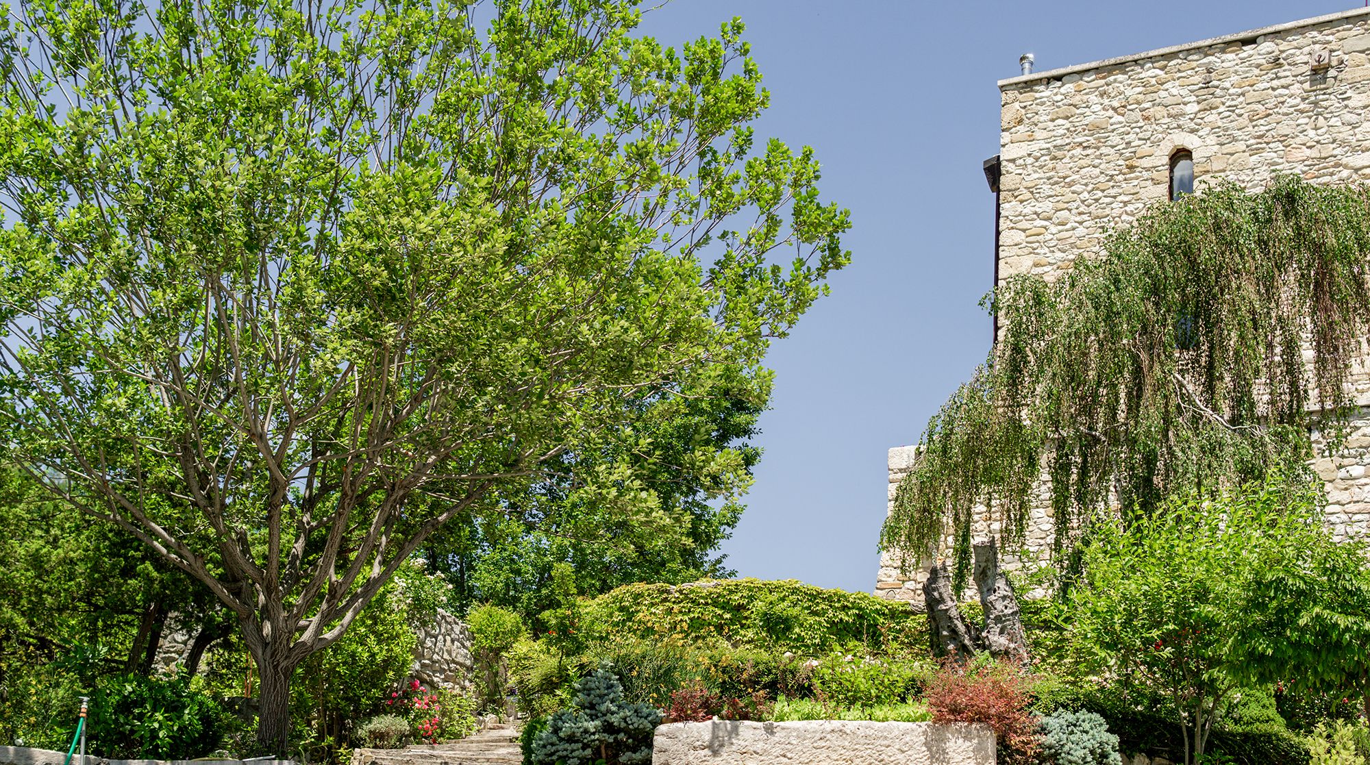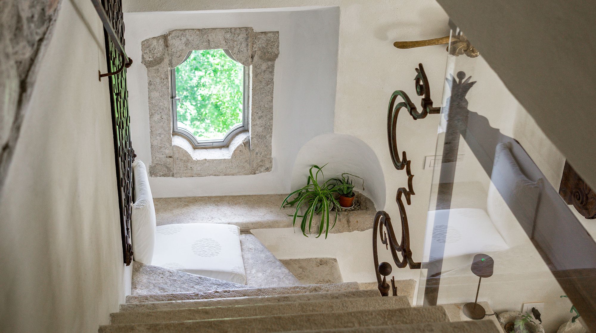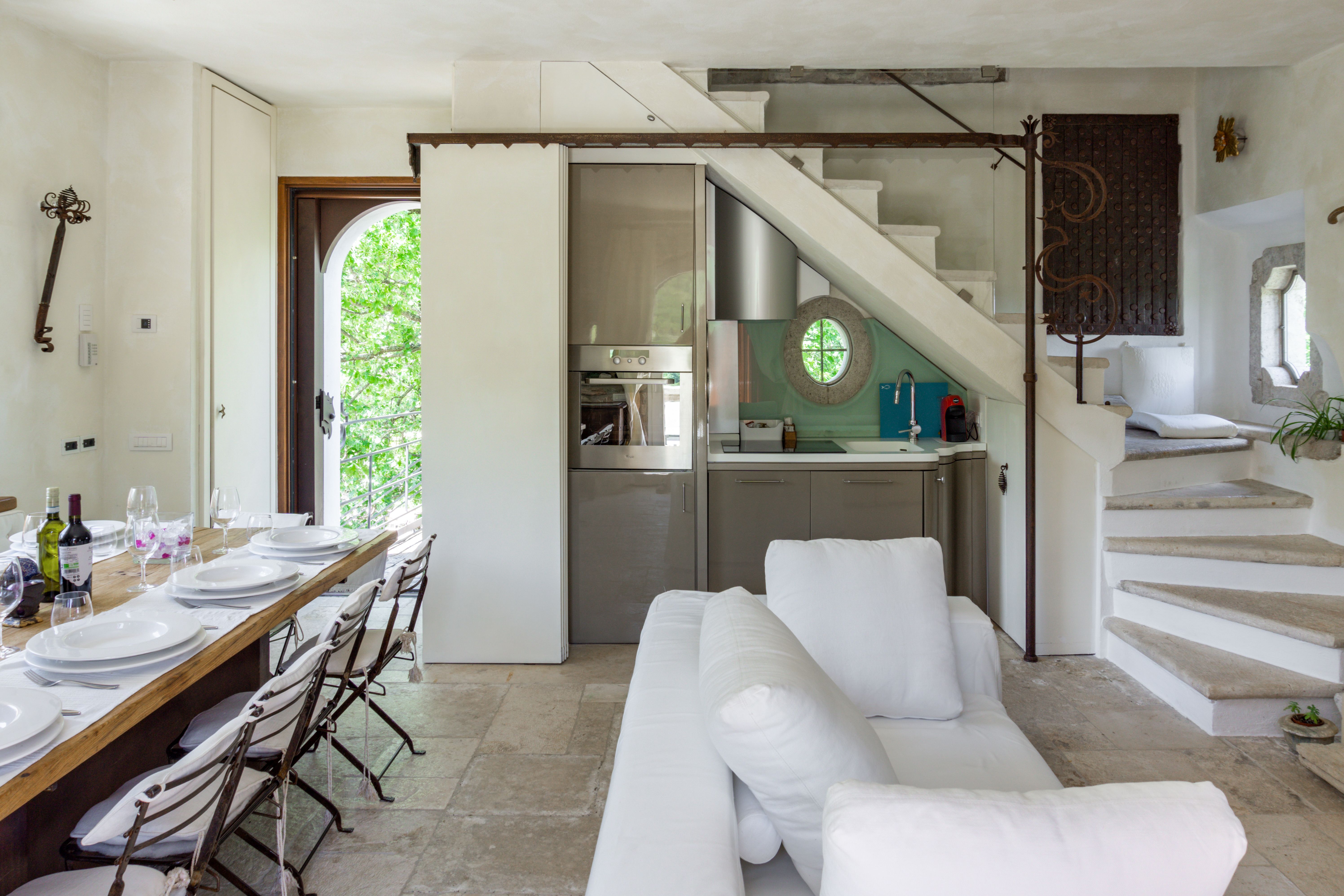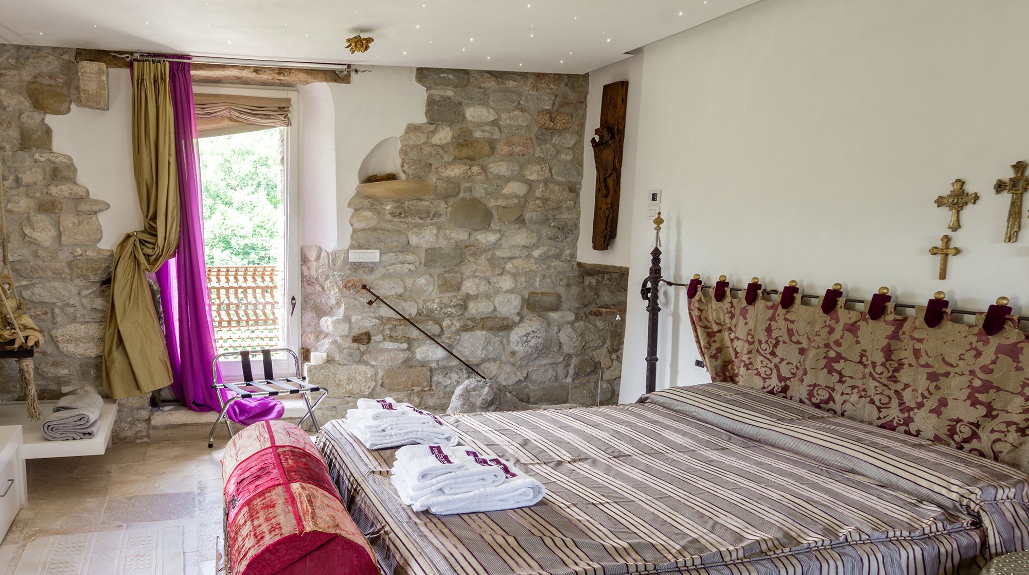 Inside, a sense of the building’s history has been retained with the thick stone walls on displace, vaulted ceilings and grand stone fireplaces filled with candles in both living rooms. The main dining table wouldn’t look out of place in a monastery’s refectory and bedrooms come adorned with religious iconography and tapestries that feel like they’ve been transported from the medieval age. The accommodation is split into two apartments inside the tower, each with its own open-plan kitchen, living and dining room.