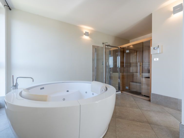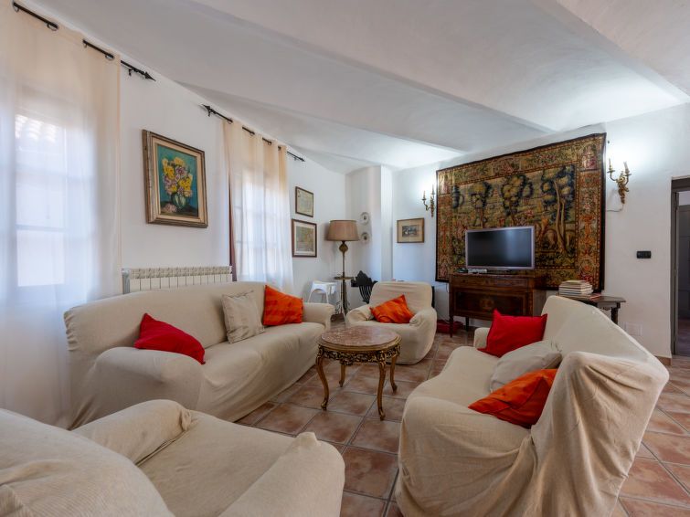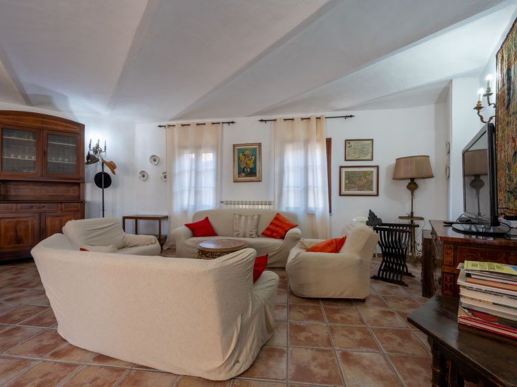 8-room cottage 350 m2 on 3 levels. Rustic and antique furnishings: living/dining room with dining table, TV and air conditioning. Exit to the balcony. 1 double bedroom with 1 french bed (140 cm, length 190 cm), 1 wall-trunk bed and shower/bidet/WC. 1 double bedroom with 1 double bed (160 cm, length 190 cm), shower/bidet/WC and air conditioning.