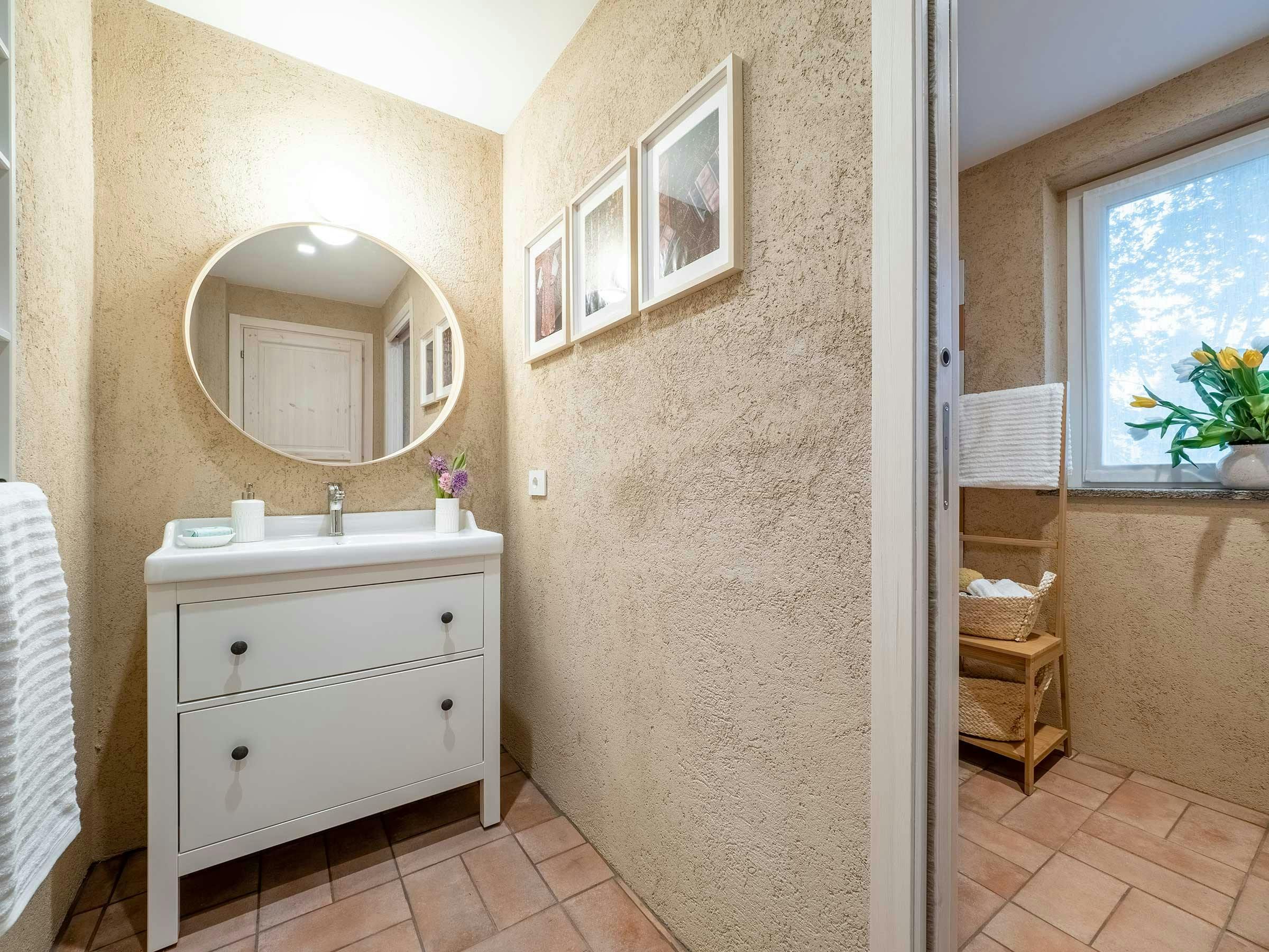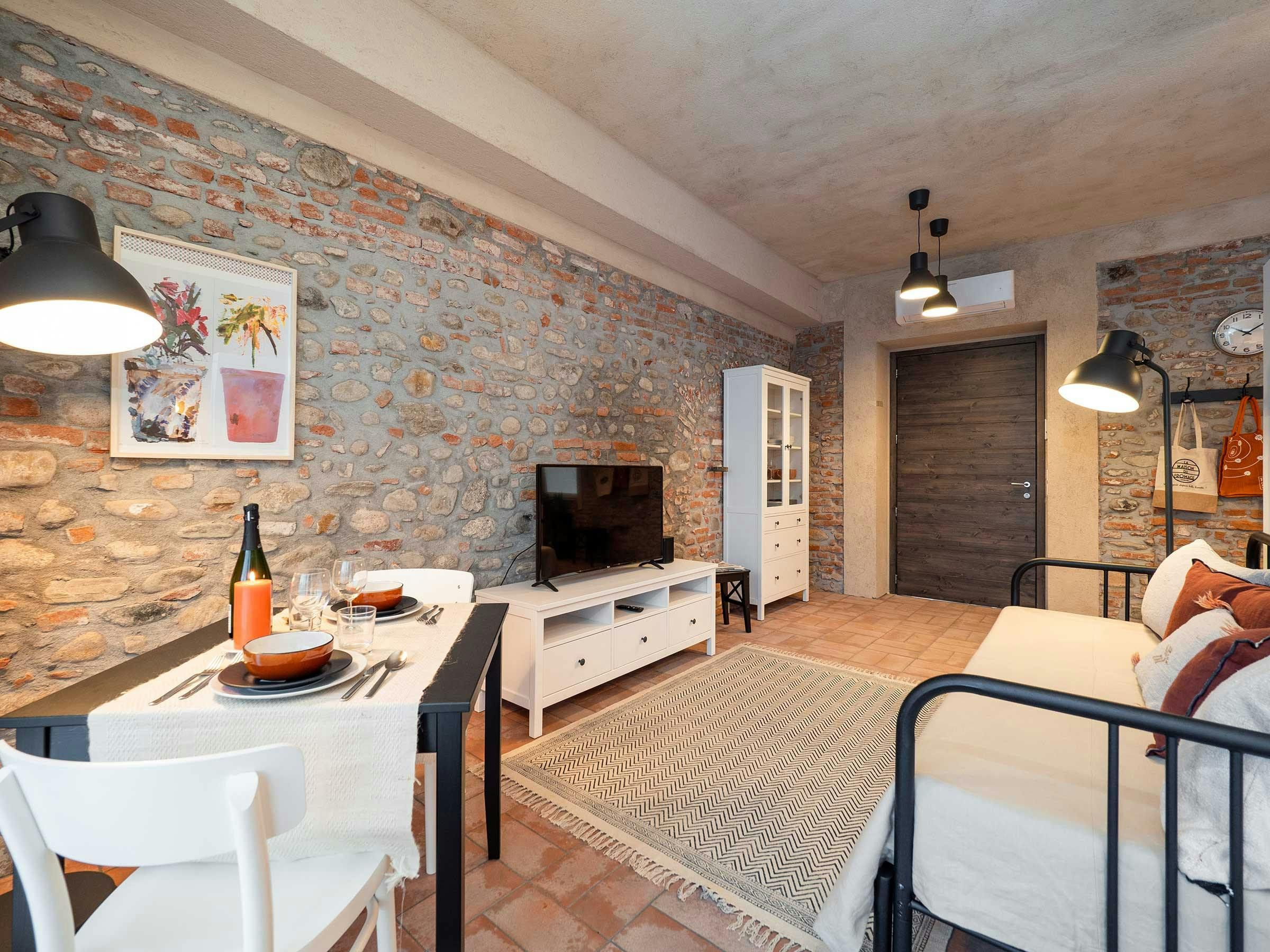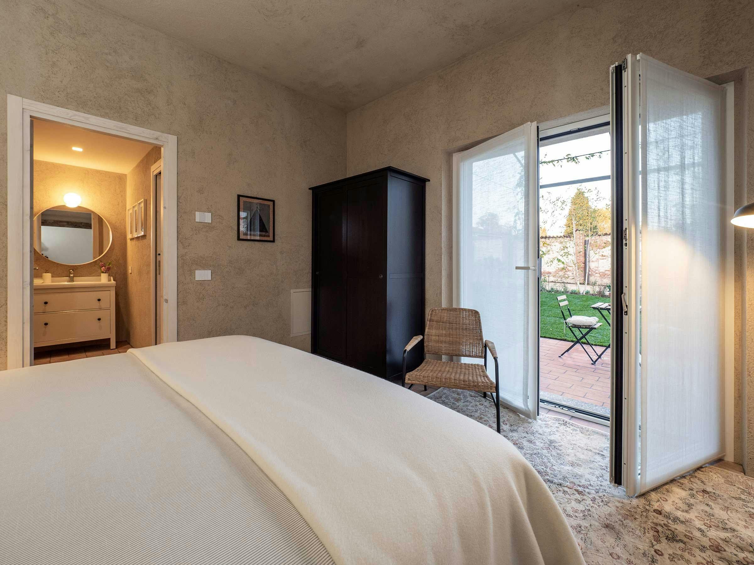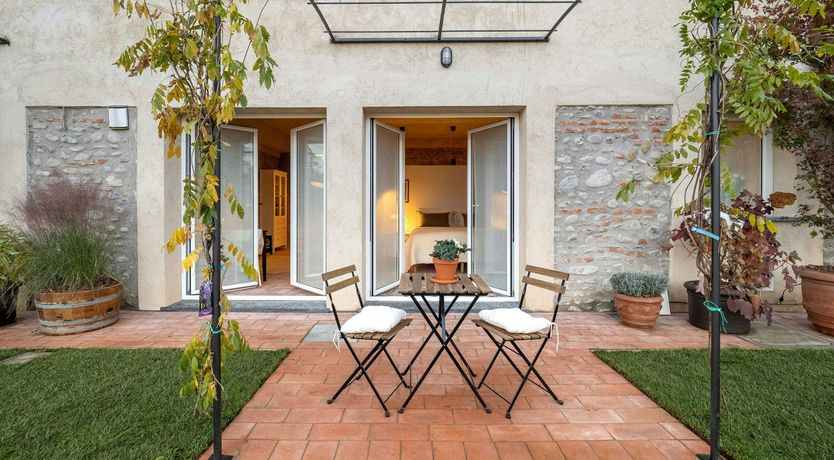 This charming country home is part of a traditional Italian farmhouse, situated next to the Bogogno Golf Club and less than a 30-minute drive from Malpensa Airport. The property features 11 independent serviced apartments, which have undergone a sustainable restoration project completed in 2022. The apartment for rent is located on the ground floor, measuring approximately 60 sqm and includes a spacious living room with a double sofa bed, a bedroom with a king-size bed, and a fully equipped kitchen with modern amenities. Guests can enjoy the beautiful garden view from the large floor-to-ceiling windows in the living room and relax at the table and chairs under the wisteria-draped pergola. The property also includes an air conditioning system, free Wi-Fi, Smart TV, Bluetooth speakers, and other basic electrical appliances. The eco-resort offers luxury hotel-level service with reception office, laundry room, and plenty of communal outdoor spaces for socializing with other guests and local staff. Ideal for singles, couples, or families with children up to four people can comfortably stay in this apartment.