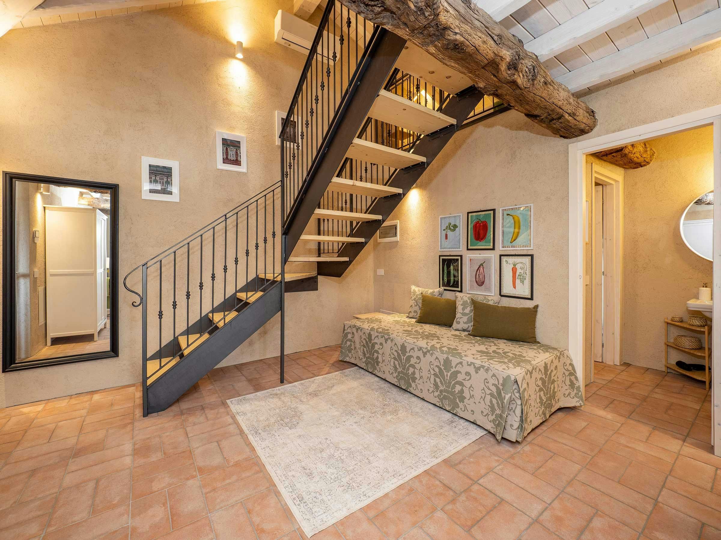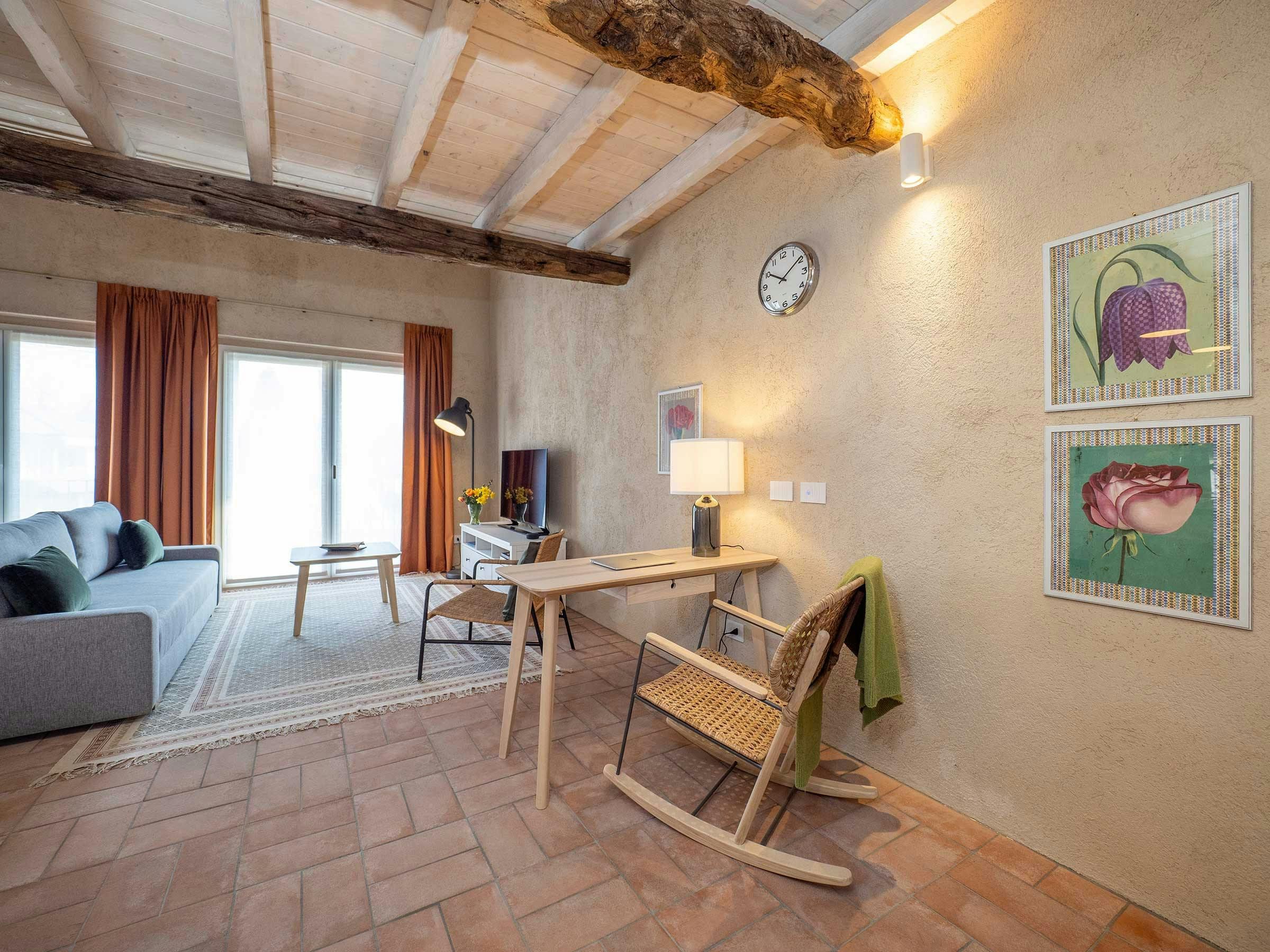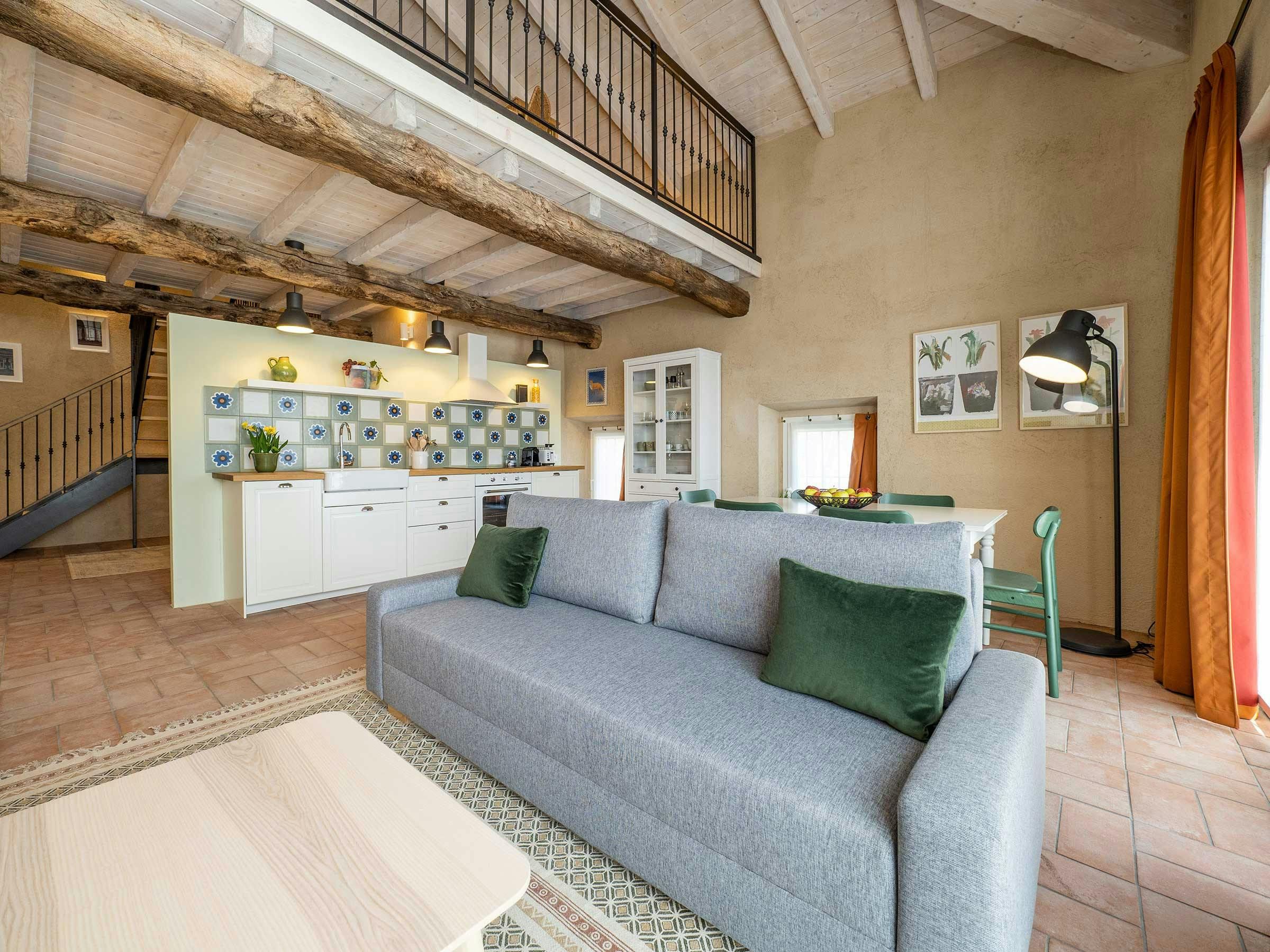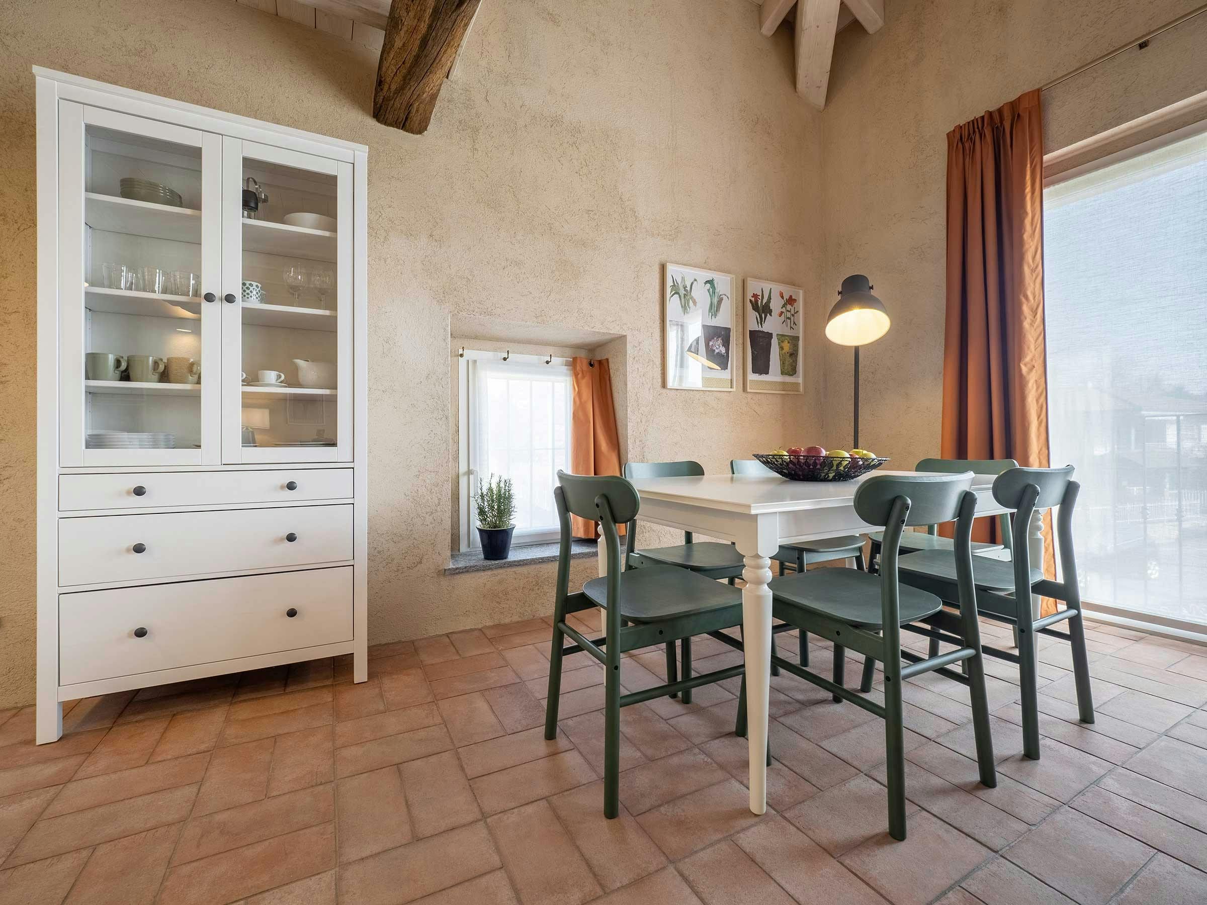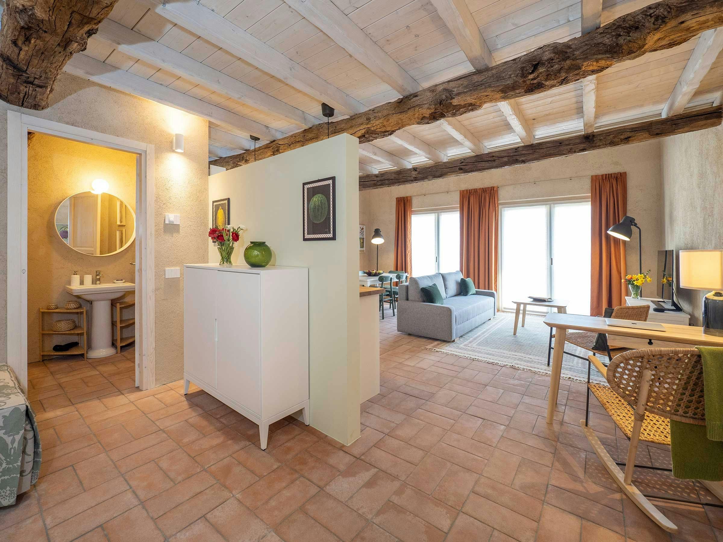 Nestled in an idyllic natural environment at the foot of the Alps, this bright country home is part of a traditional Italian farmhouse, known as a Cascina. The property has undergone an innovative restoration project using environmentally sustainable practices while salvaging and celebrating the building's historical features. This charming unit spans across two levels, featuring high ceilings and large full-height windows that open onto the garden and bring a lot of natural light into the apartment all year round. The apartment comprises an entrance room with a daybed and desk, a large living room with a double sofa-bed, dining area for six people, open-plan kitchen, bathroom with large Italian shower, and mezzanine floor with a king-size bed and single bed. Amenities include air conditioning, independent heating system, free Wi-Fi, Smart TV, Bluetooth speakers, free car parking, reception office, laundry facilities and large common outdoor areas designed to socialize with other guests and local staff. Conveniently located next to the renowned Bogogno Golf Club and less than a 30-minute drive from Malpensa Airport and Lago Maggiore. Ideal for small families and can accommodate up to five people for short stays or three people for longer stays.