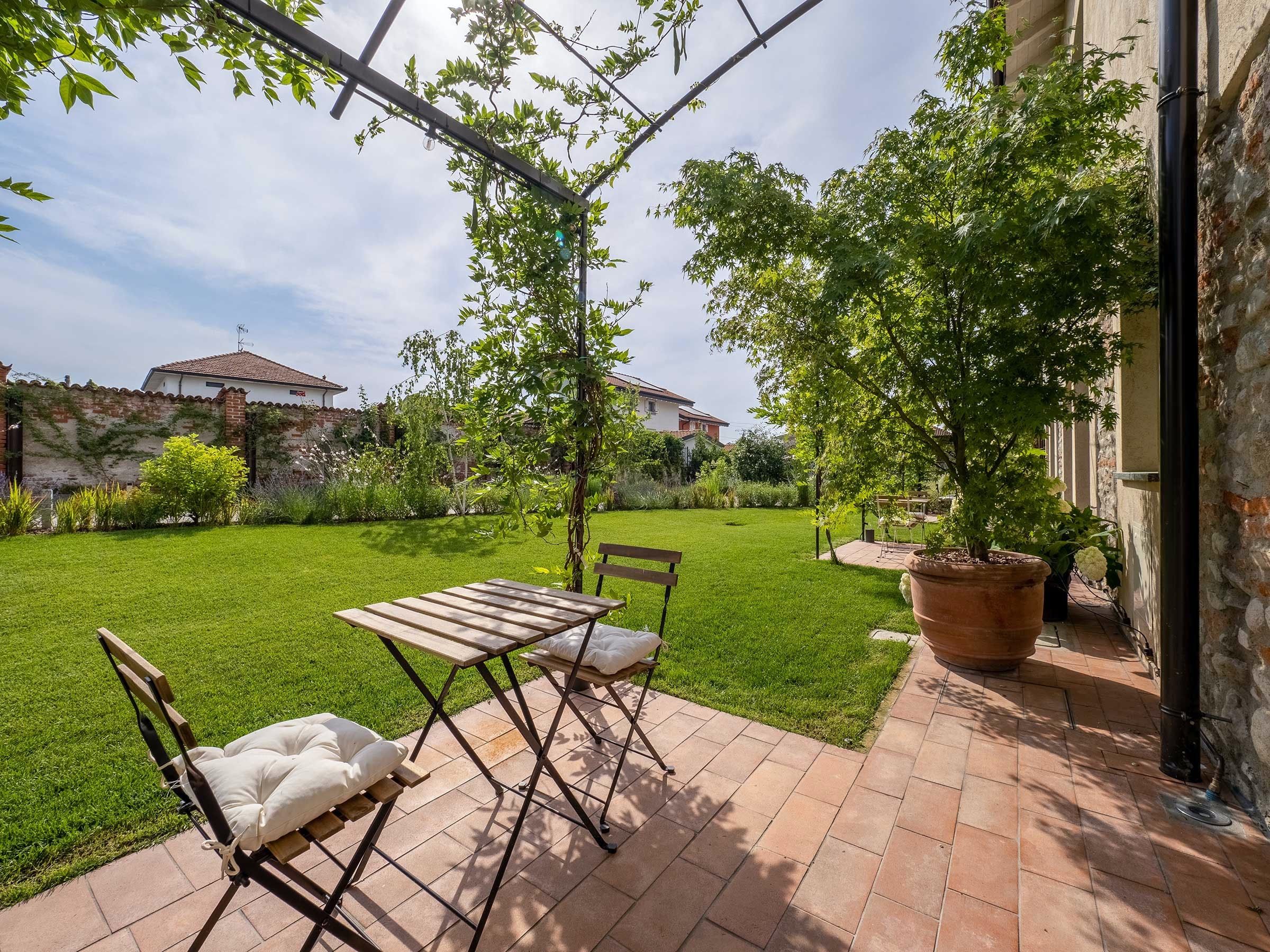 *You'll have access to the garden here. It's shared with the building's other residents. You’ll also have your own patio area, shaded by a wisteria-covered pergola.