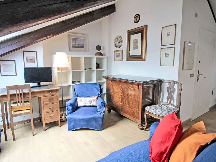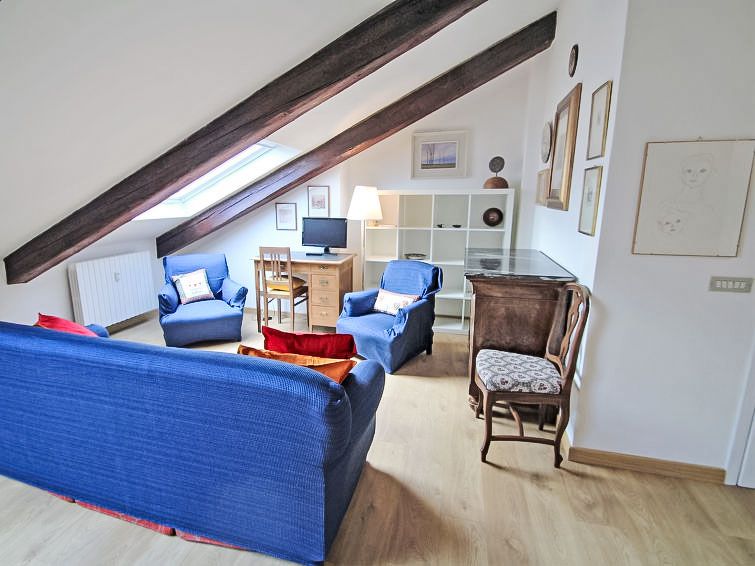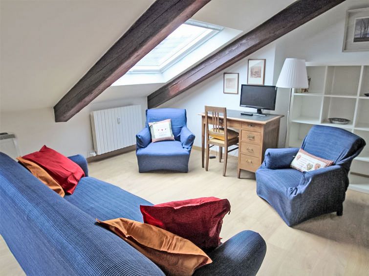"13", 2-room apartment 60 m2 on 3rd floor. With sloping ceilings, comfortable furnishings: living/dining room with 1 double sofabed, dining table, TV and air conditioning. 1 double bedroom. Small kitchen (dishwasher, 4 induction hot plates, kettle, microwave, electric coffee machine).
