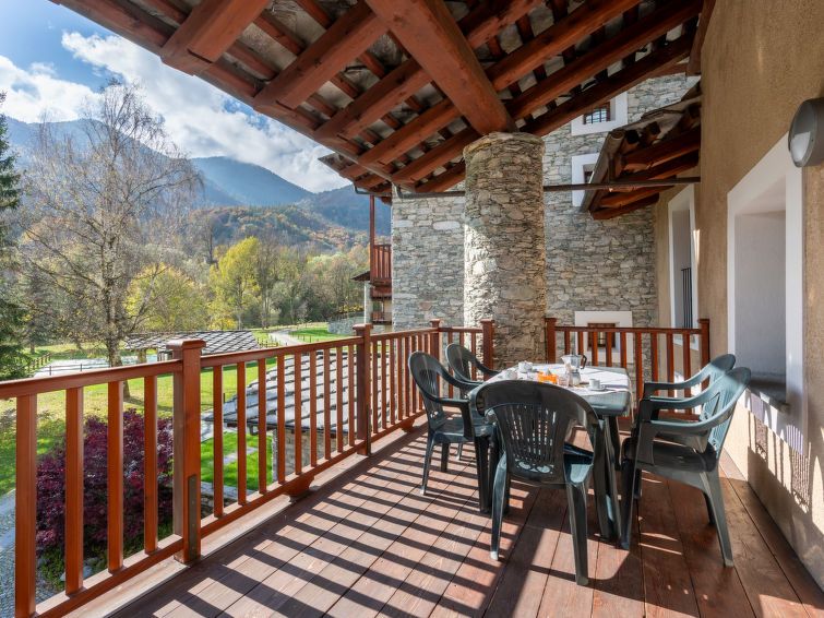 "La Borgata", 2-room apartment 63 m2 on 2 levels on 2nd floor. Tasteful and cosy furnishings: living/dining room with open-hearth fireplace, dining table and TV. Exit to the terrace. 1 room with 1 double bed. Open mezzanine with 2 beds. Small, open kitchen (4 gas rings, microwave).