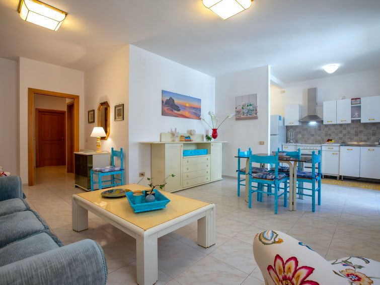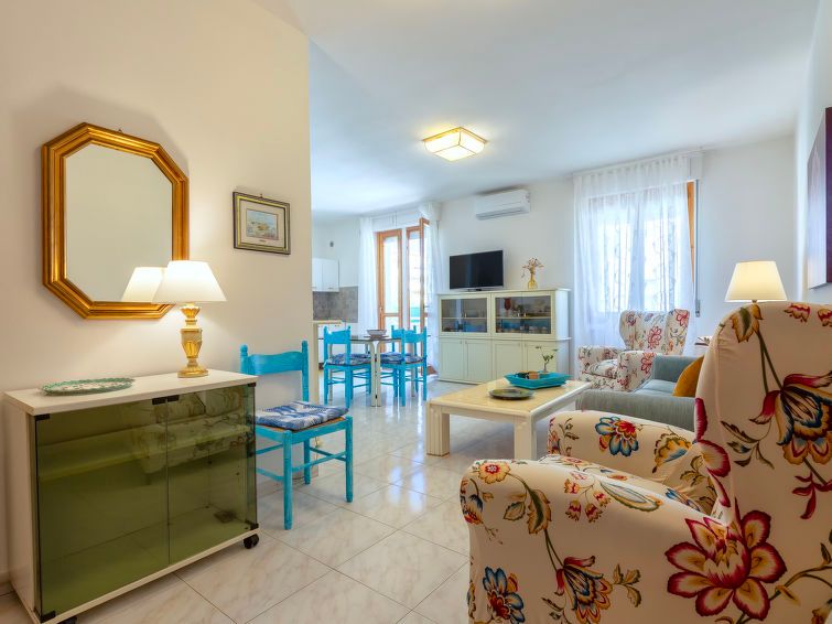 "Fiordaliso", 3-room apartment 70 m2, on the upper ground floor. Simple and practical furnishings: living/dining room with TV, flat screen and air conditioning. 1 double bedroom with air conditioning. 1 room with 3 beds and air conditioning. Exit to the terrace. Kitchenette (oven, 4 gas rings, toaster, kettle, electric coffee machine).