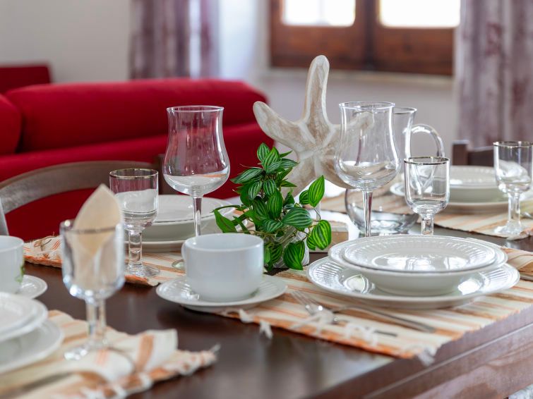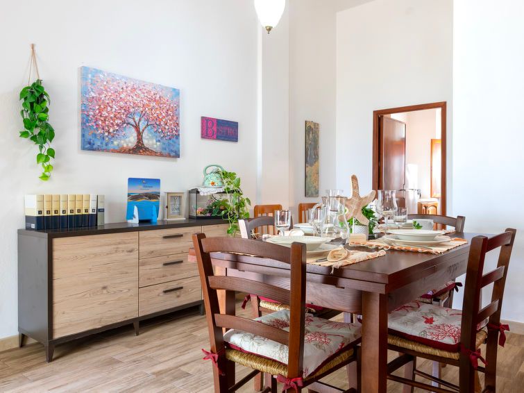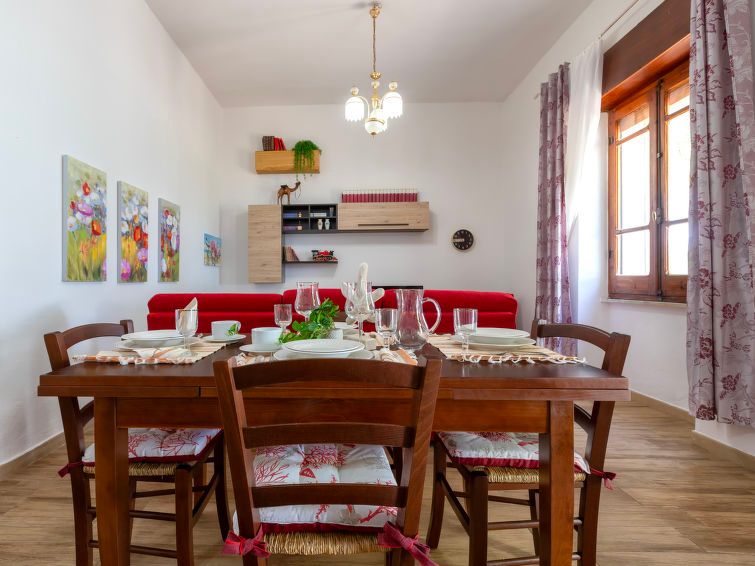 3-room house 85 m2, on the ground floor. Simple and comfortable furnishings: living/dining room with 2 sofabeds and TV (flat screen). Exit to the terrace. 1 double bedroom. Kitchen (4 hot plates, oven, toaster, kettle, electric coffee machine). Shower/bidet/WC. No heating option. Large terrace.