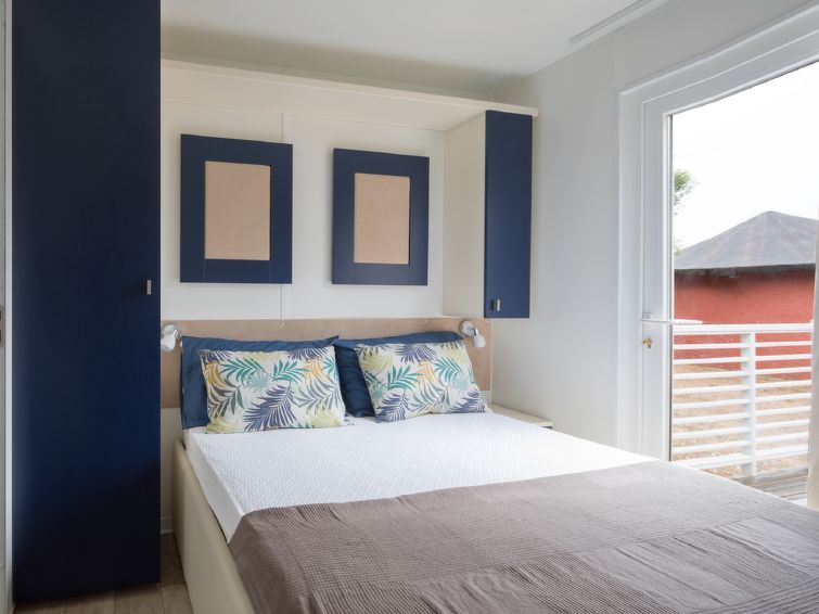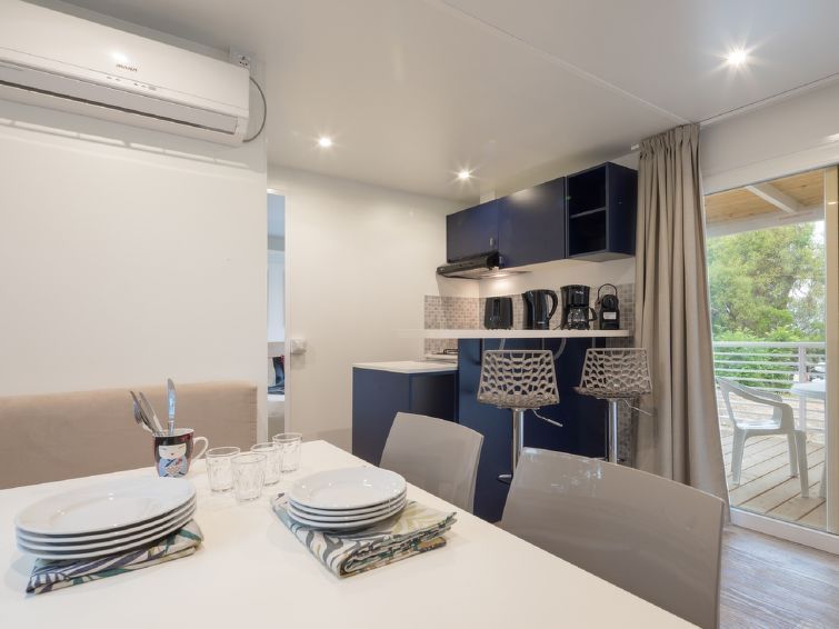 "Baia Elite", 4-room mobile home 33 m2. Modern furnishings: living/dining room with dining table. Exit to the terrace. 1 room with 1 french bed (140 cm), separate WC. 2 rooms, each room with 2 beds (70 cm). Kitchenette (4 gas rings, toaster, kettle, microwave, electric coffee machine).